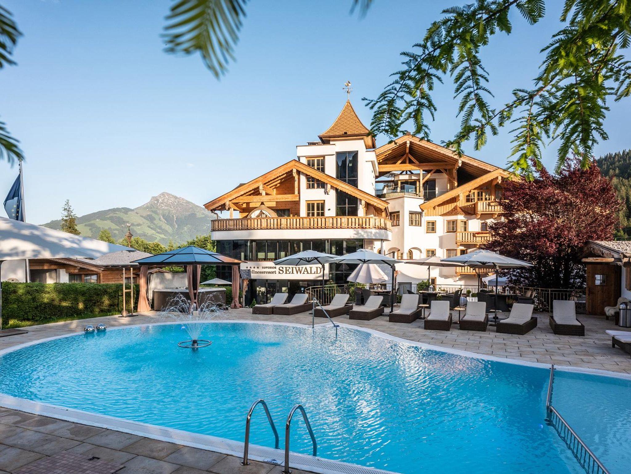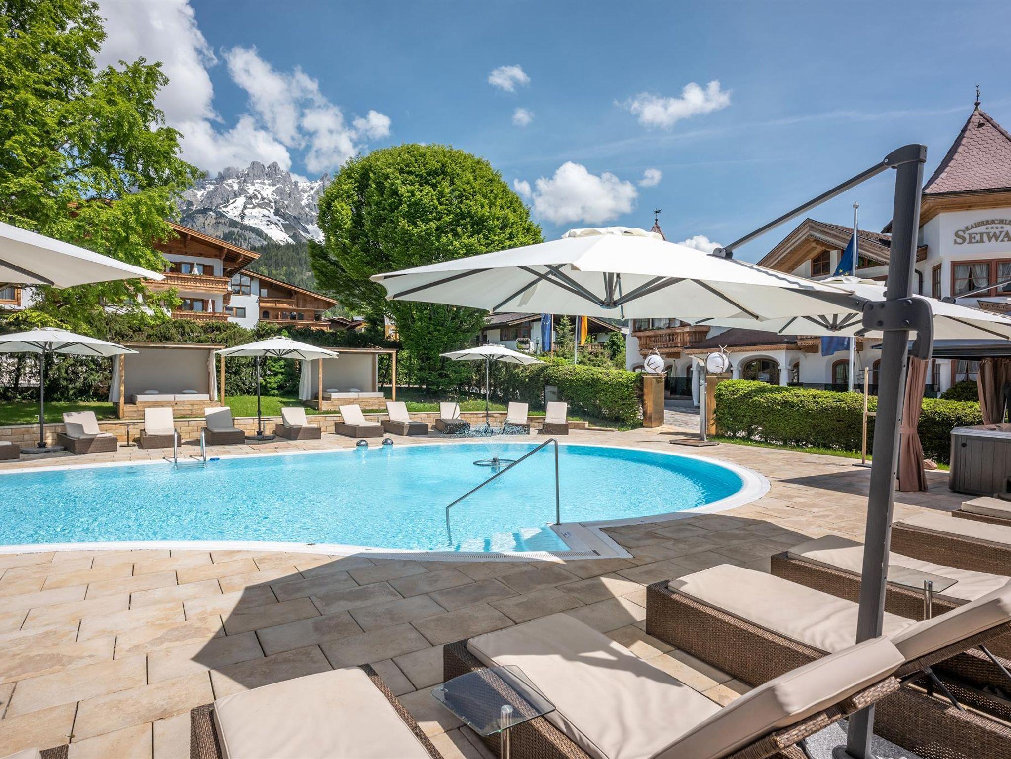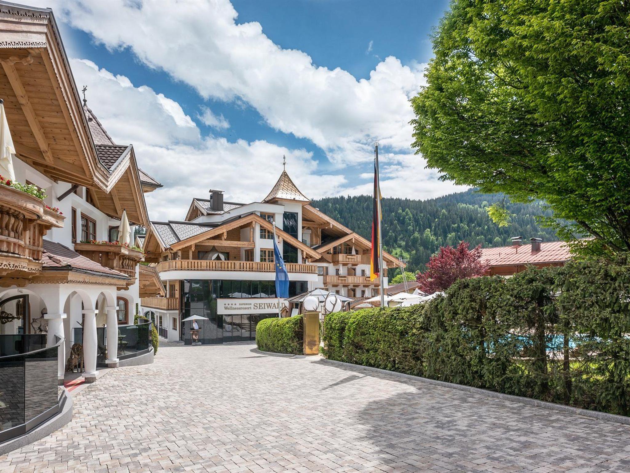 Herzlich willkommen im Familien-Wellnessresort Seiwald! Die Hotelanlage liegt sonnig und ruhig, in bester Lage von Going, 200m oberhalb vom Hotel Stanglwirt im Ortsteil Prama. In unserem familiär geführten Hotel, dem Kaiserschlöss'l und dem gegenüberliegendem Chalethotel können mehr als 100 Gäste unvergessliche Urlaubstage erleben. 10 Gehminuten ins Ortszentrum. Der kostenlose Skibus hält direkt am Hotel. Der berühmte Goinger Badesee, eine Reithalle, der Eislaufplatz und die Langlaufloipen sind vom Hotel in nur 5 Gehminuten erreichbar. Bei Schönwetter lädt der beheizte Außenpool zum Verweilen ein. Sollte Petrus mal streiken können Sie unser großes Erlebnis-Hallenbad genießen. Auf über 2.000 m² Wellnessbereich erwarten sie das Hallenbad mit Whirlpool, Sprudelbank und Luftsprudel, umgeben von einem sagenhaftem Bergbauerndorf mit Mühlrad mit Blick auf Going. Weiters ein großes Saunadorf mit türkischem Dampfbad, Sauna-Schwitzstube, Tepidarium, Solegrotte, Kneippstrasse in den Ötzikäteraum im Felsen, Infrarot-Wärmekabine sowie eine Schönheitsfarm mit Massage und Kosmetik.