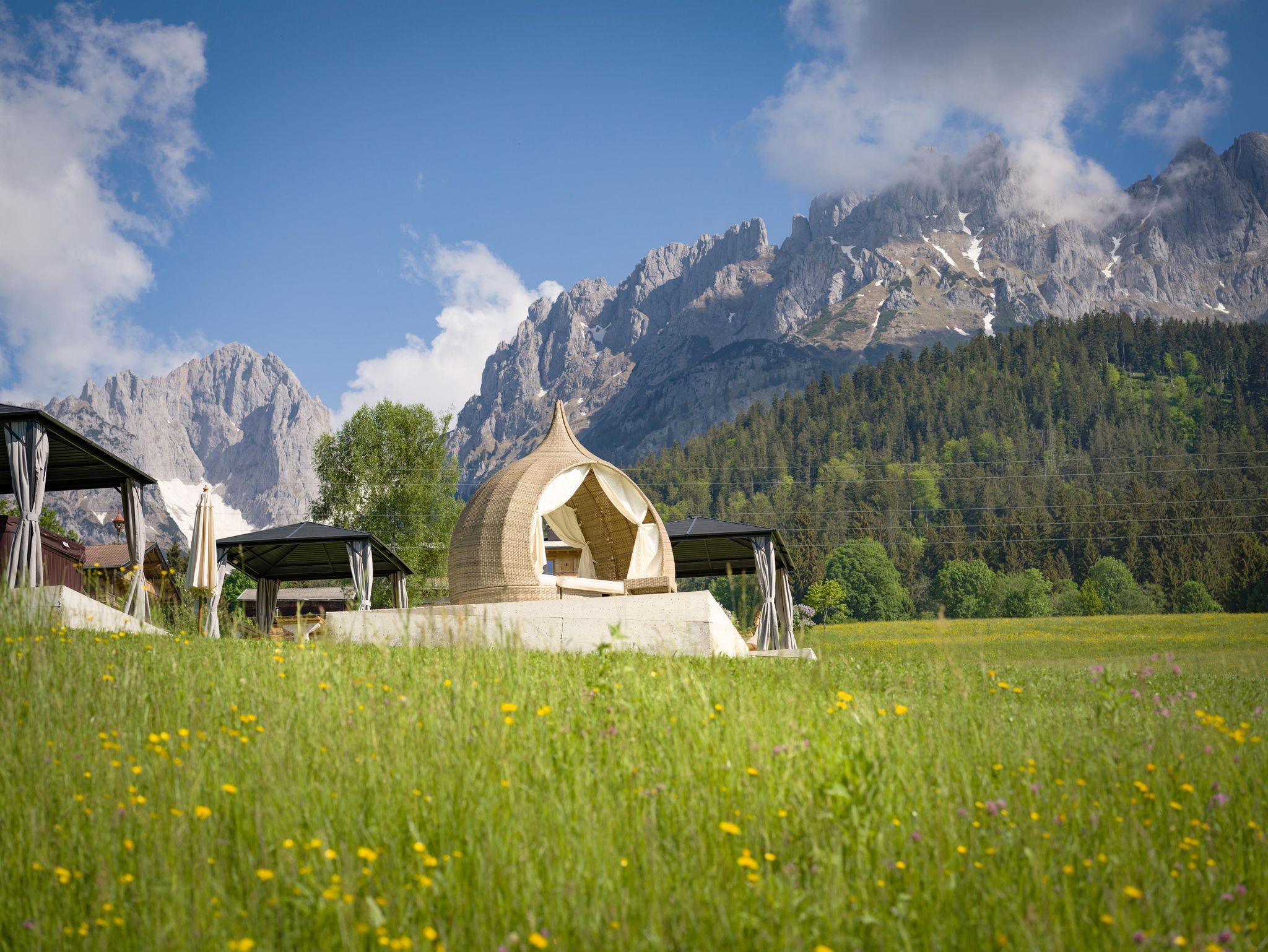 Für vollkommene Entspannung sorgt der ganzjährig kostenfrei nutzbare Whirlpool auf der weitläufigen Wellnesswiese. Nach einem aktiven Tag auf den Pisten oder den Wanderwegen ist das warme, sprudelnde Wasser – im Winter wie im Sommer – der ideale Ort zum Durchatmen, die Muskeln zu lockern und die umliegende Berglandschaft zu bewundern. In den Pavillons und auf den bequemen Liegen können Sie die Sonne genießen und die wohltuende Stille erleben, während die Kleinsten auf dem großzügigen Areal mit Fußball- und Volleyballfeldern sowie weiteren Spielgeräten nach Herzenslust toben können.