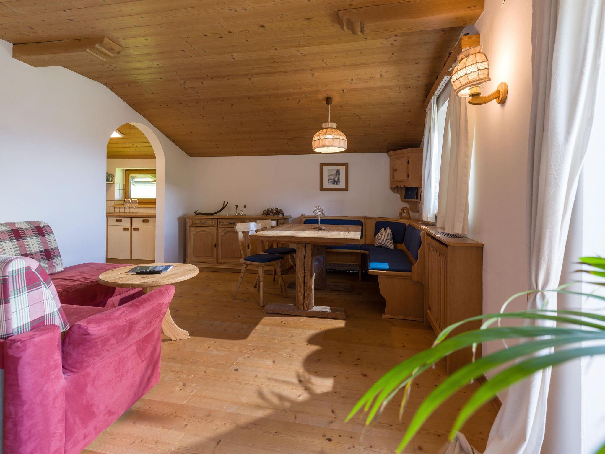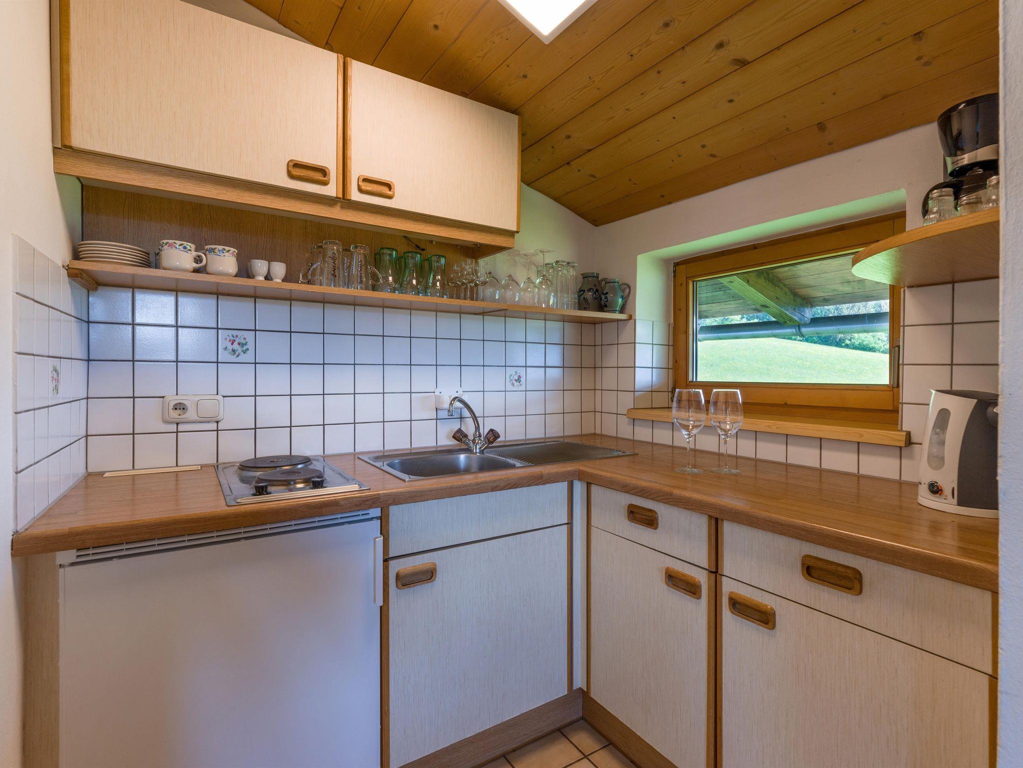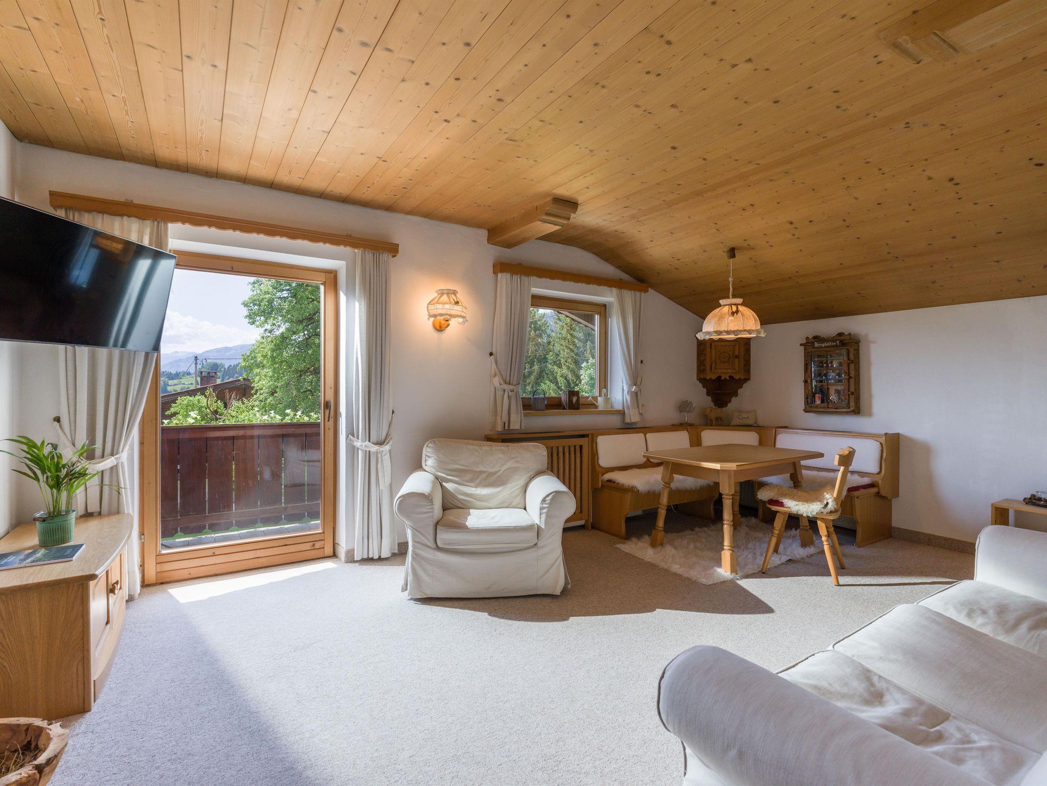 Das ca. 60 m² große Appartement bietet eine kleine, ausgestattete Küche mit gemütlicher Sitzecke und einem Flat- TV, ein Badezimmer mit Dusche und WC, ein Schlafzimmer mit Doppelbett und ein Schlafzimmer mit Einzelbett. Das Appartement bietet einen Balkon mit traumhaften Ausblick auf die gesamte Bergwelt und Terrasse mit Blick auf den Wilden Kaiser. Die gemütlichen Ferienwohnungen sind mit viel Liebe im Tiroler Landhausstil eingerichtet.