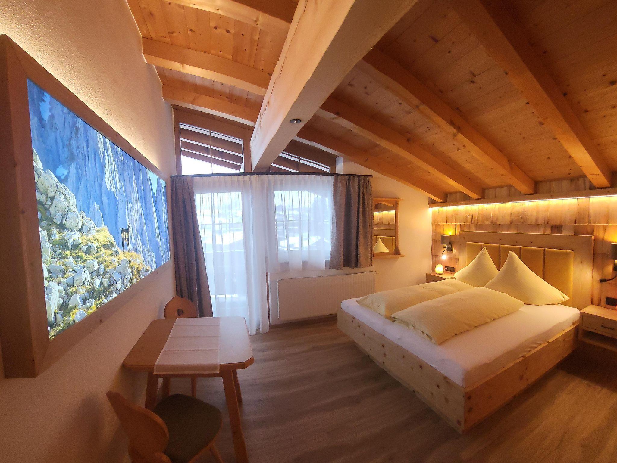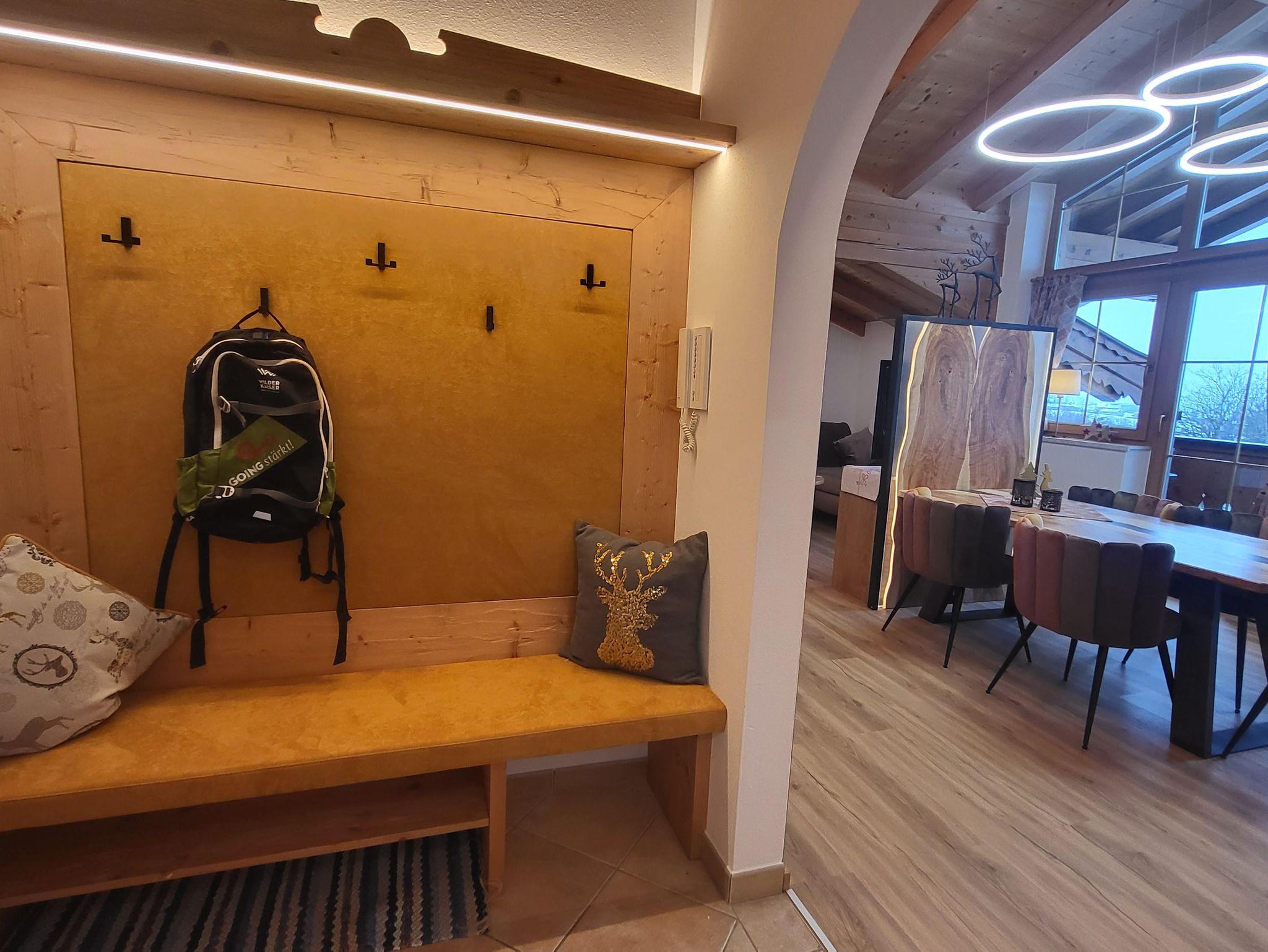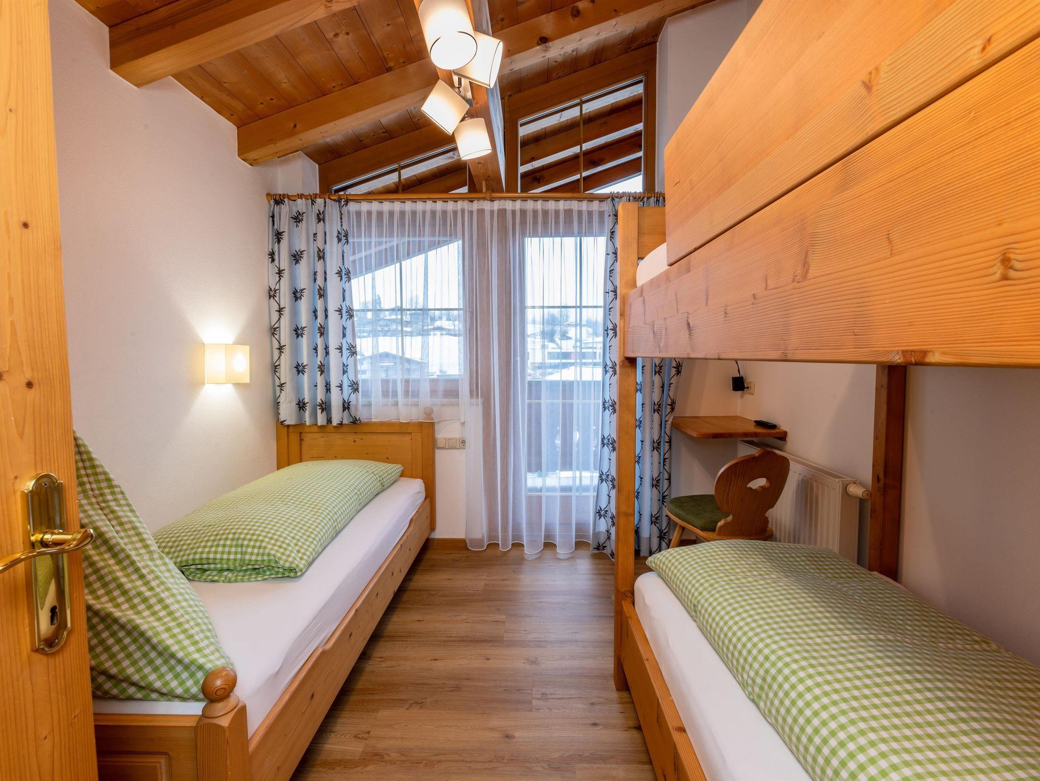 Das Appartment Nr. 5 liegt im Dachgeschoss. Mit Blick Richtung Norden zum Wilden Kaiser. Im ersten Schlafzimmer befindet sich ein Doppelbett, im zweiten Schlafzimmer sind zwei Einzelbetten. Das Wohnschlafzimmer inst mit einer Doppelschlafcouch, Kachelofen,Fernseher, Sitzecke und einer Küche ausgestattet. Badezimmer und separates WC. Das Appartment verfügt über einen eigenen Balkon. Der Dachstuhl wurde in Sichtbauweise gefertigt. Appartement 5 befindet sich direkt neben Appartement 4.