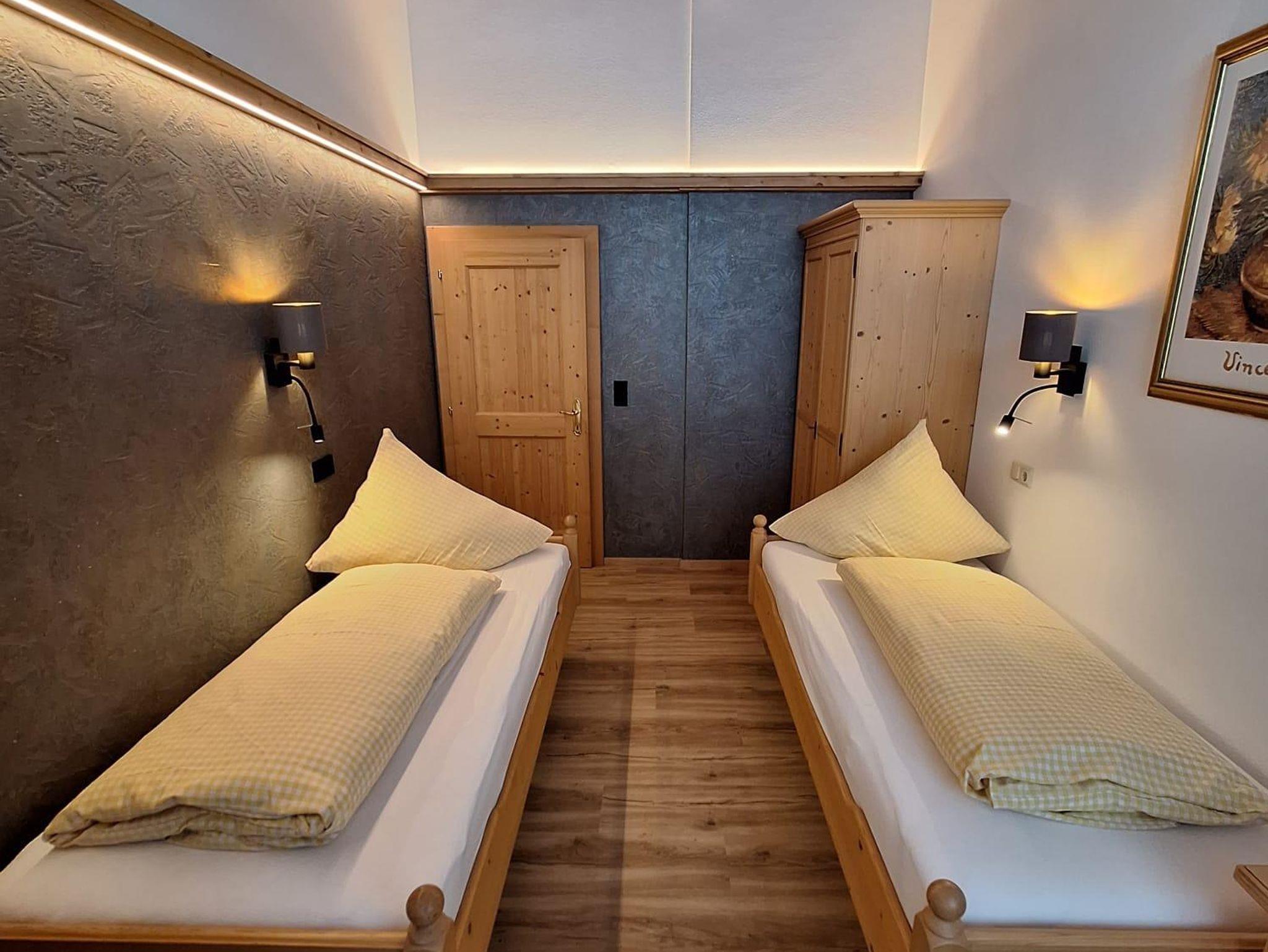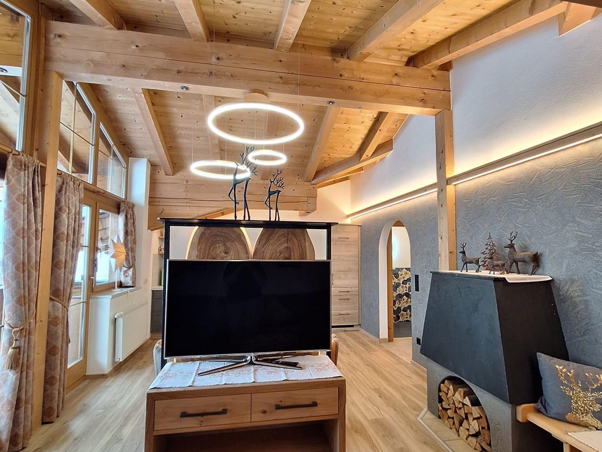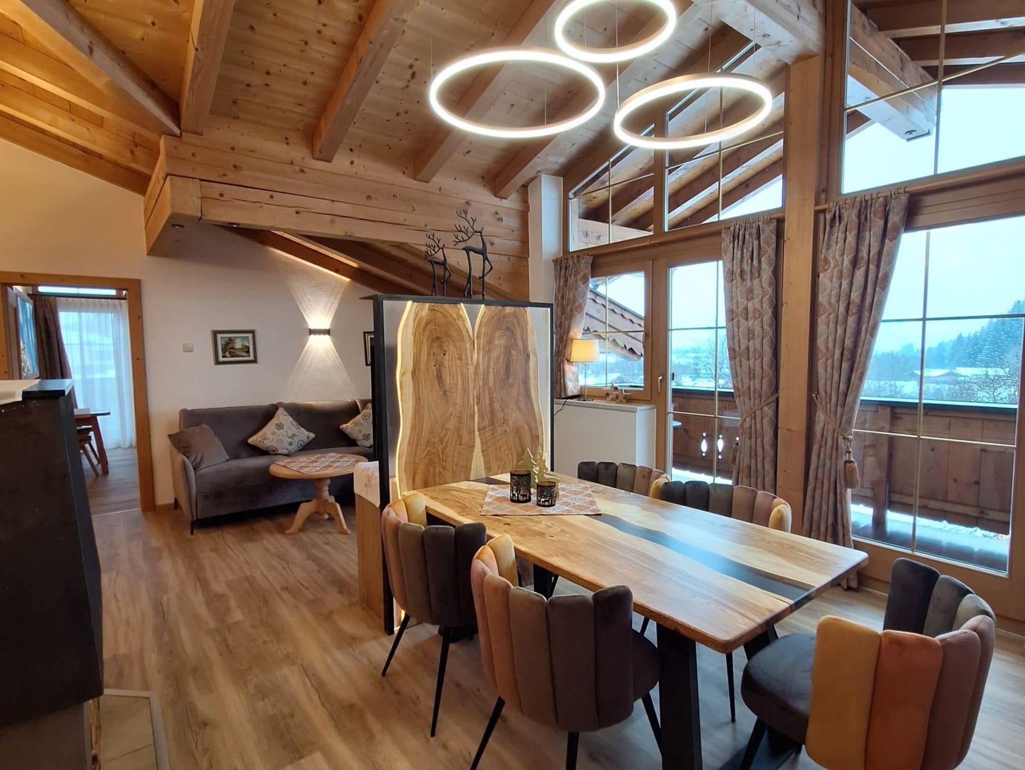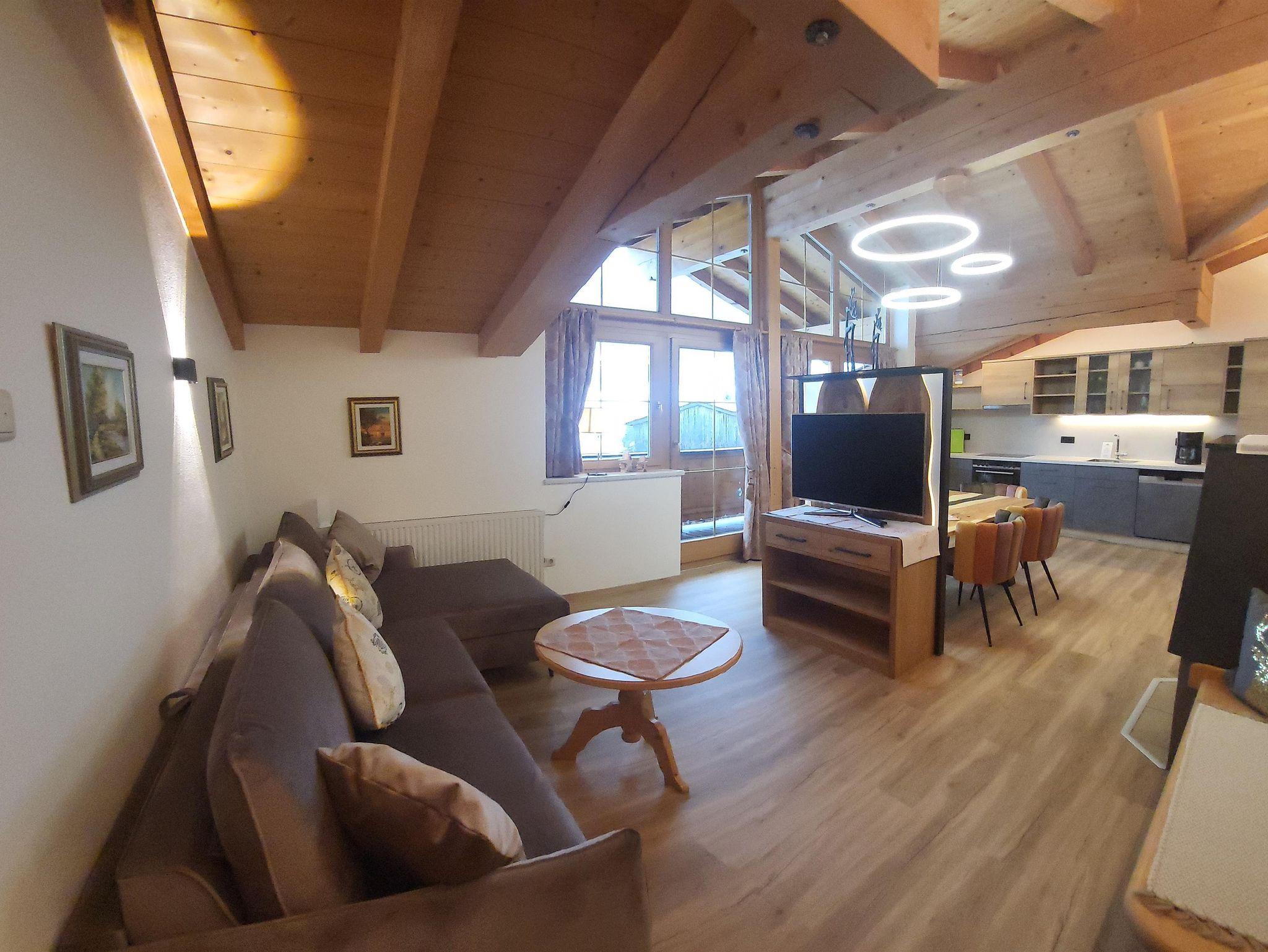 Das Appartment Nr. 5 liegt im Dachgeschoss. Mit Blick Richtung Norden zum Wilden Kaiser. Im ersten Schlafzimmer befindet sich ein Doppelbett, im zweiten Schlafzimmer sind zwei Einzelbetten. Das Wohnschlafzimmer inst mit einer Doppelschlafcouch, Kachelofen,Fernseher, Sitzecke und einer Küche ausgestattet. Badezimmer und separates WC. Das Appartment verfügt über einen eigenen Balkon. Der Dachstuhl wurde in Sichtbauweise gefertigt. Appartement 5 befindet sich direkt neben Appartement 4.