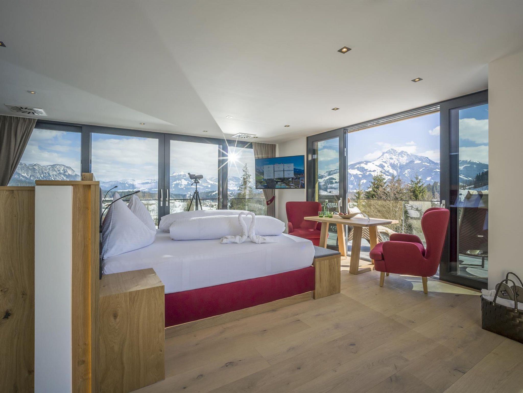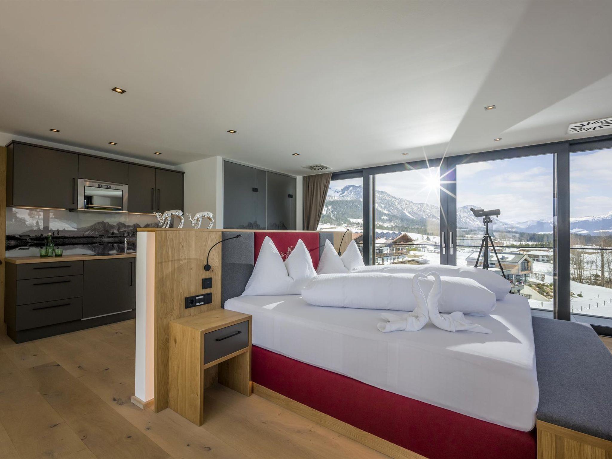 Unsere Penthousesuite ist 40 m² groß und verfügt 1 Schlafzimmer mit Eichenholzboden, Dusche und separetes WC, SAT-TV, Kochnische mit Kühlschrank, Haarföhn, Safe, Telefon, gemütliche Sitzecke, Balkon, einzigartigen Rundumblick auf die gesamte Bergwelt.