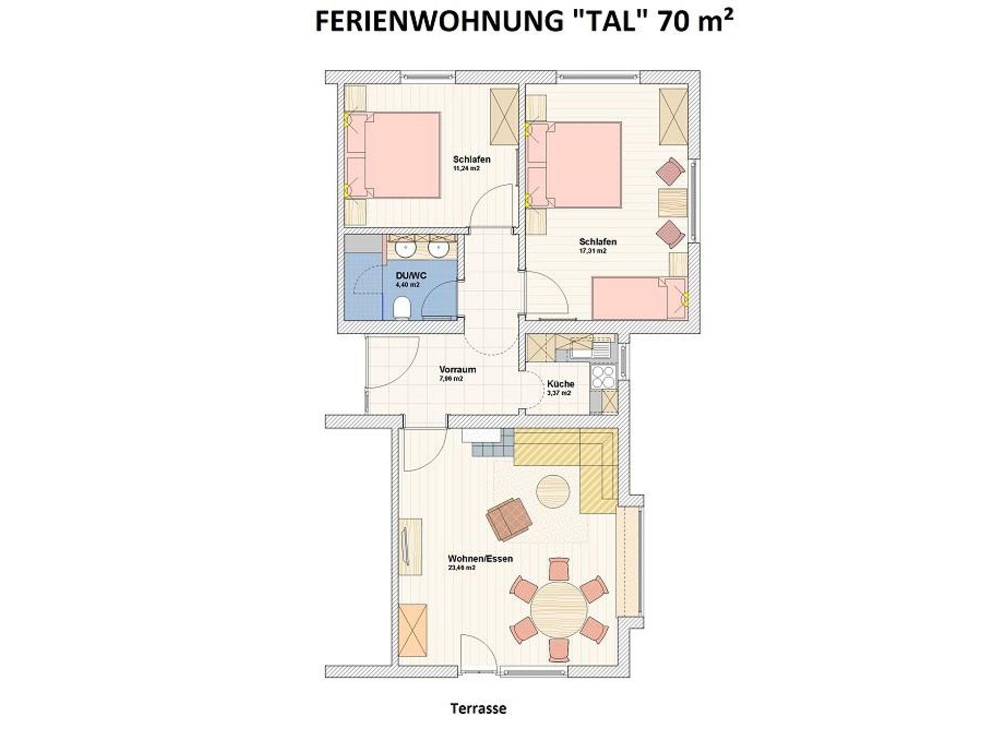 Unser Appartement „Tal“ mit 70 m² bietet Platz für bis zu 6 Personen und ist ausgestattet mit 2 Schlafzimmer und komplett Vollholzmöbel vom Goinger Tischler. Weiters verfügt die Wohnung über eine vollausgestattete Wohnküche und ein großzügiges Badezimmer. Von der Appartement eigenen Terrasse aus genießen Sie den Ausblick auf das Kitzbüheler Horn und den Astberg.