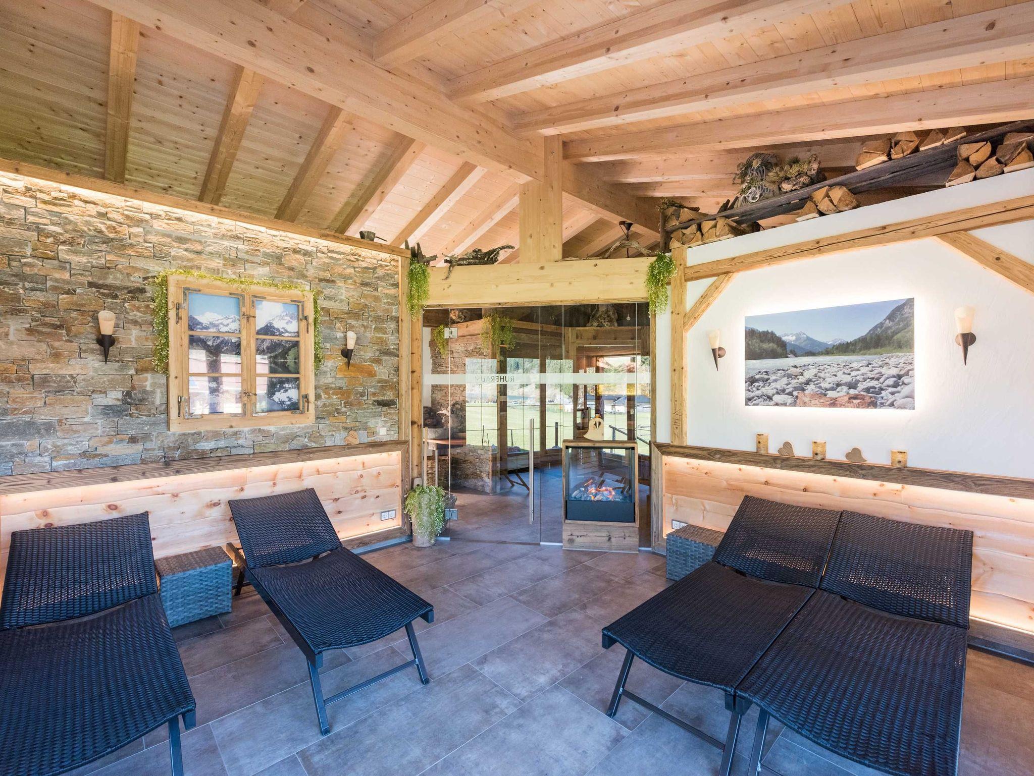 Hier findet man alles, was Körper, Geist und Seele nach einem langen Tag in den Tiroler Bergen erfreut: eine finnische Sauna aus Altholz für bis zu acht Personen, eine Infrarotkabine mit Farblichttherapie und Musik, eine Biosauna aus Zirbenholz mit Kräuteraufguss für bis zu sechs Personen, im Freibereich eine Sitzlounge sowie Sonnenliegen, Freidusche, einen Ruheraum mit Effektfeuer, gemütlichen Liegen und traumhaftem Ausblick auf den Haldensee und die umliegende Bergwelt.