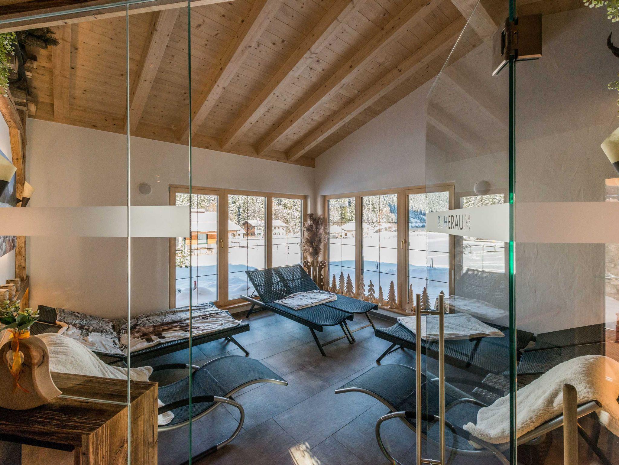 Hier findet man alles, was Körper, Geist und Seele nach einem langen Tag in den Tiroler Bergen erfreut: eine finnische Sauna aus Altholz für bis zu acht Personen, eine Infrarotkabine mit Farblichttherapie und Musik, eine Biosauna aus Zirbenholz mit Kräuteraufguss für bis zu sechs Personen, im Freibereich eine Sitzlounge sowie Sonnenliegen, Freidusche, einen Ruheraum mit Effektfeuer, gemütlichen Liegen und traumhaftem Ausblick auf den Haldensee und die umliegende Bergwelt.