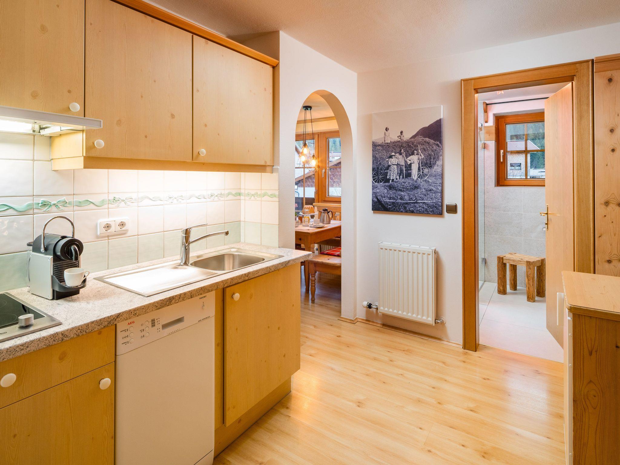 Der authentische Ess- und Wohnbereich bildet den natürlichen Mittelpunkt der Stube und versprüht jede Menge Wohlfühlatmosphäre. Die Wandgestaltung mit Kiefern- und Fichtenaltholz spendet schmeichelnd honigfarbenes Licht. In der Bauernstube zieren über naturbelassenen Altholztisch aus dem Ursprungshaus moderne Designlampen. Alte Schwarzweißfotografien erinnern an frühere Zeit im Bäckergut. Spannende Lektüre findet sich in der Hausbibliothek. Räumlich getrennt ist die perfekt eingerichtete Küche.