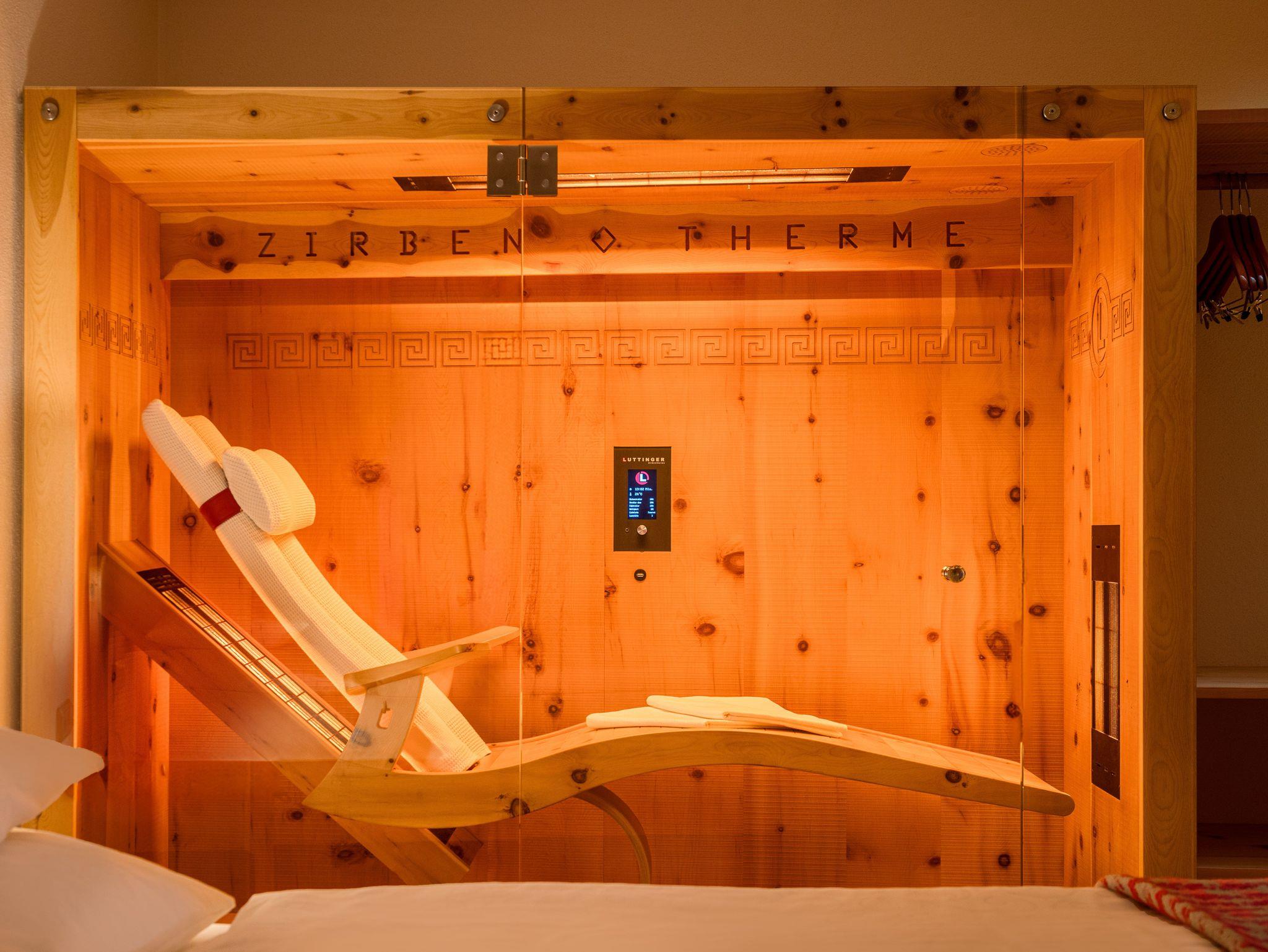 Zirbenholz und Tiefenwärme entzünden das Lebensfeuer. Die wohltuende Wärme der Infrarotsauna, gepaart mit der Kraft der Zirbe verstärkt den Erholungseffekt auf den ganzen Körper. Im Private Spa mit Schwebeliege, Farblichtregelung und entspannter Wellnessmusik kann der Körper effektiv und nachhaltig regenerieren.