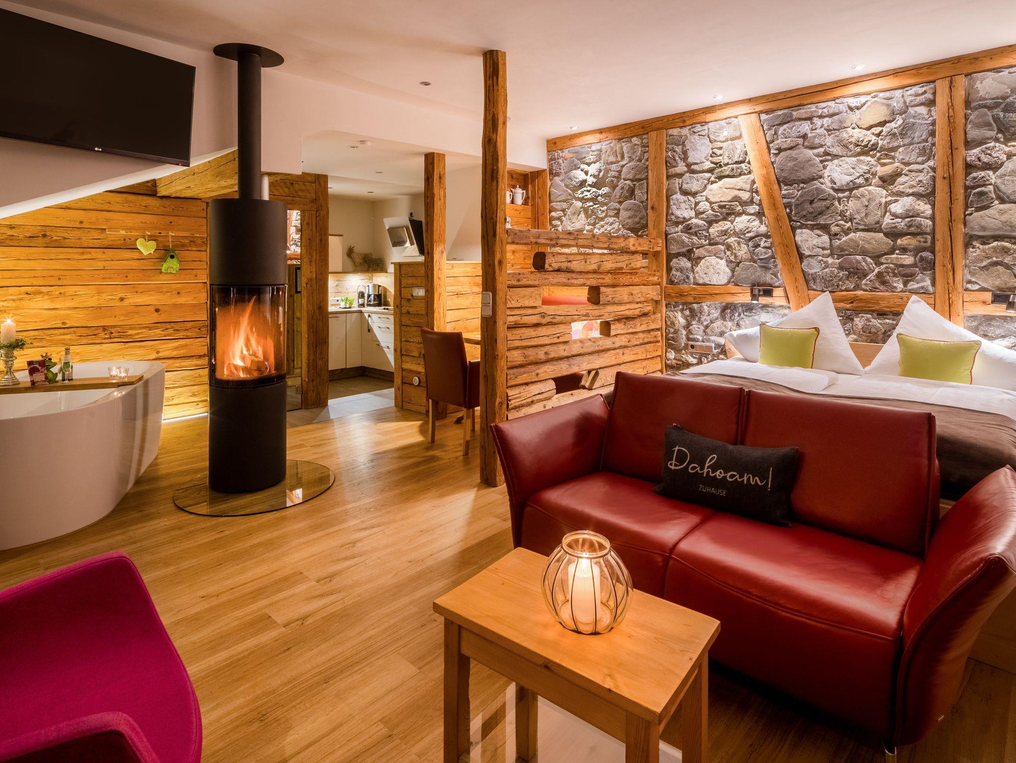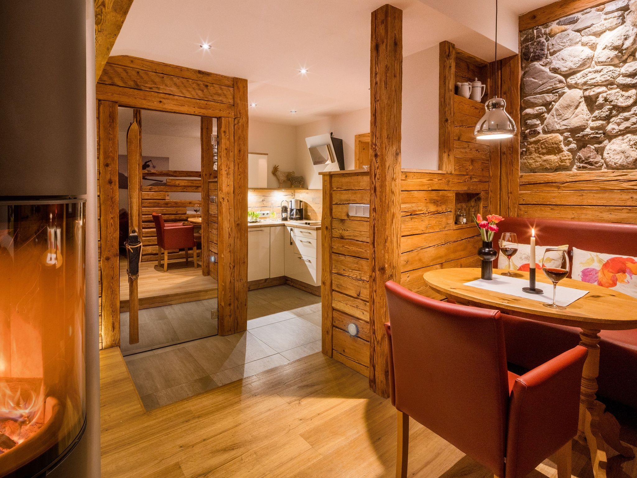 ... schlägt das Herz der Heimat im Takt des knisternden Feuers. Betten, so einladend wie eine Umarmung in der Morgendämmerung, handverlesener Naturstein, top-eingerichteter Küche, durchdachtem Interieur und einer Atmosphäre, die in Ihnen nur einen Wunsch entstehen lässt: Bleiben.