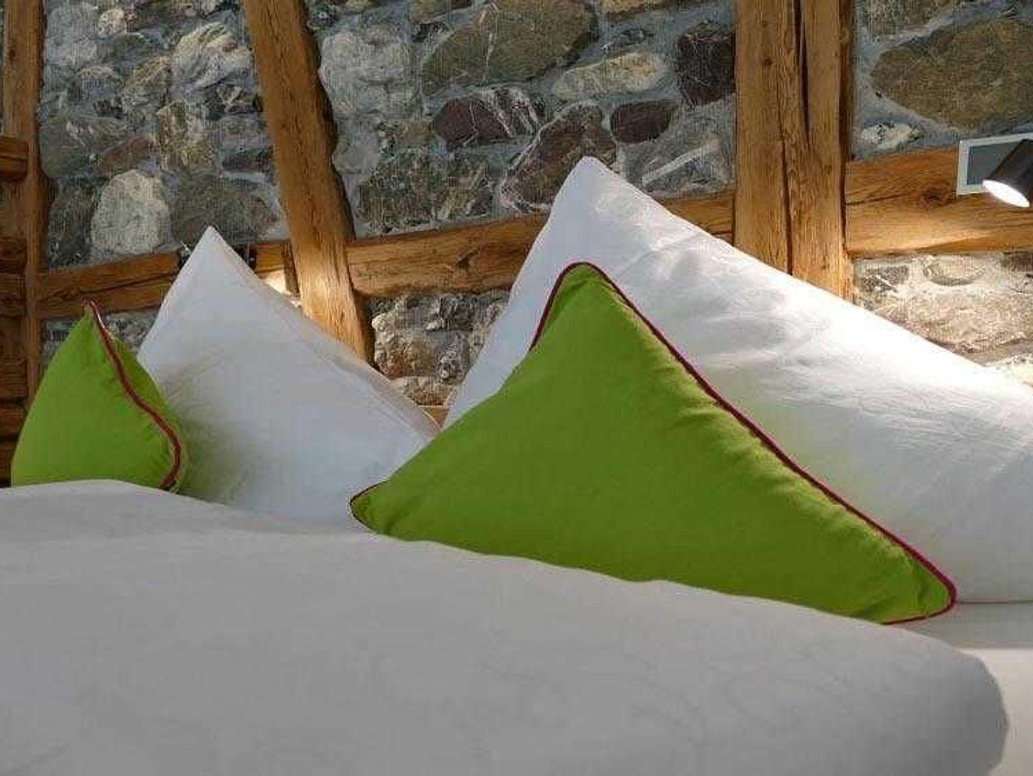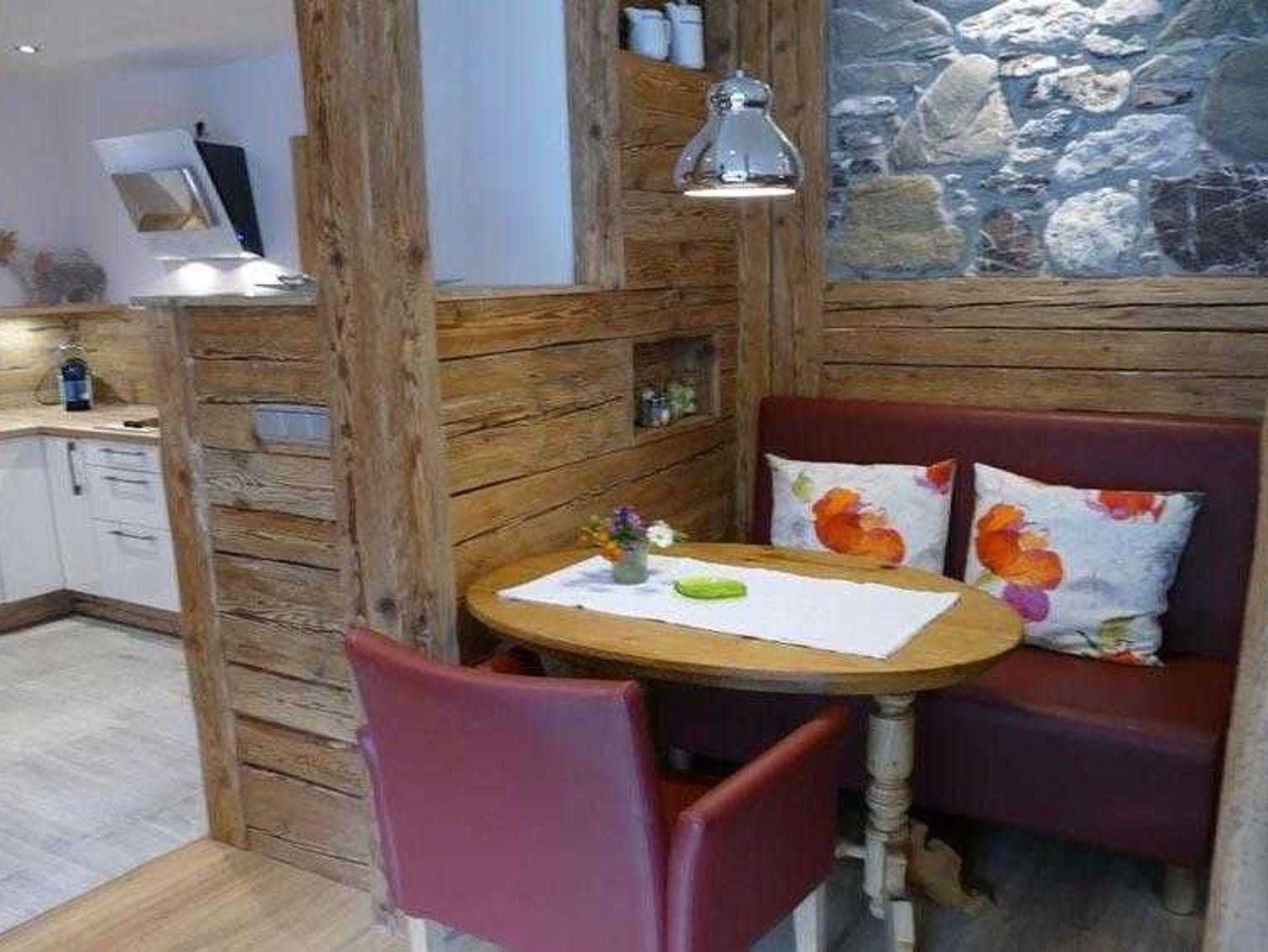 Gemütliche Stube mit Kamin, natürliche Materialien wie Holz und Stein, komfortable Betten und eine voll ausgestattete Küche schaffen eine behagliche Atmosphäre.