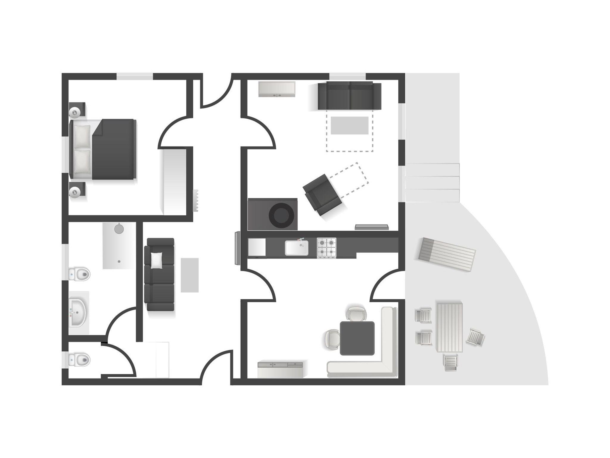 • Wohnküche mit direktem Zugang auf die möblierte Sonnenterrasse und den Garten