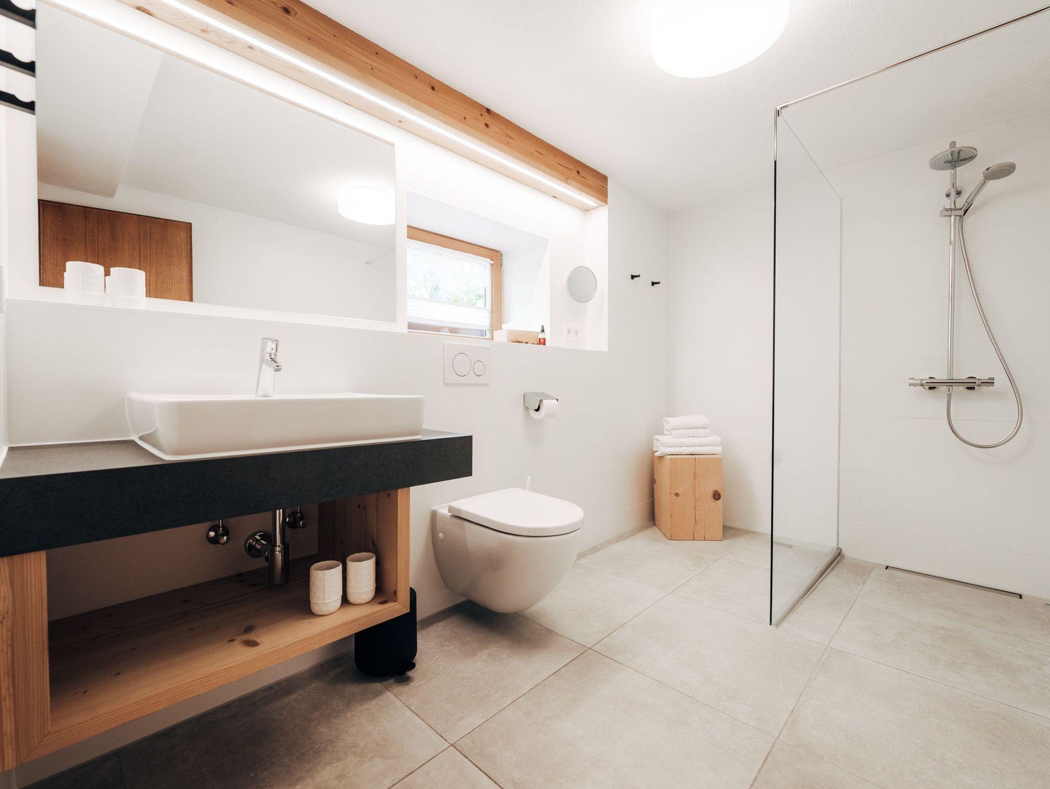• großzügiges Bad mit Waschtisch, Regendusche, WC, Kosmetikspiegel, Fön und Reinigungstüchern