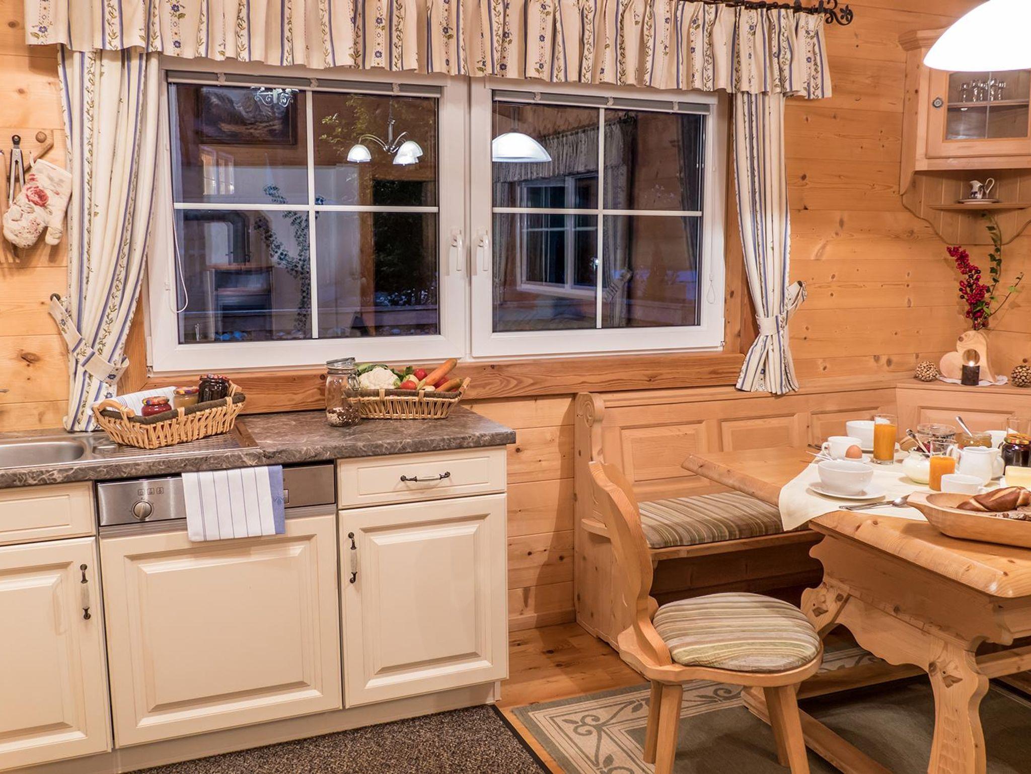 • Voll eingerichtete offene Küche mit Sitzecke und großem Jogeltisch im Landhausstil