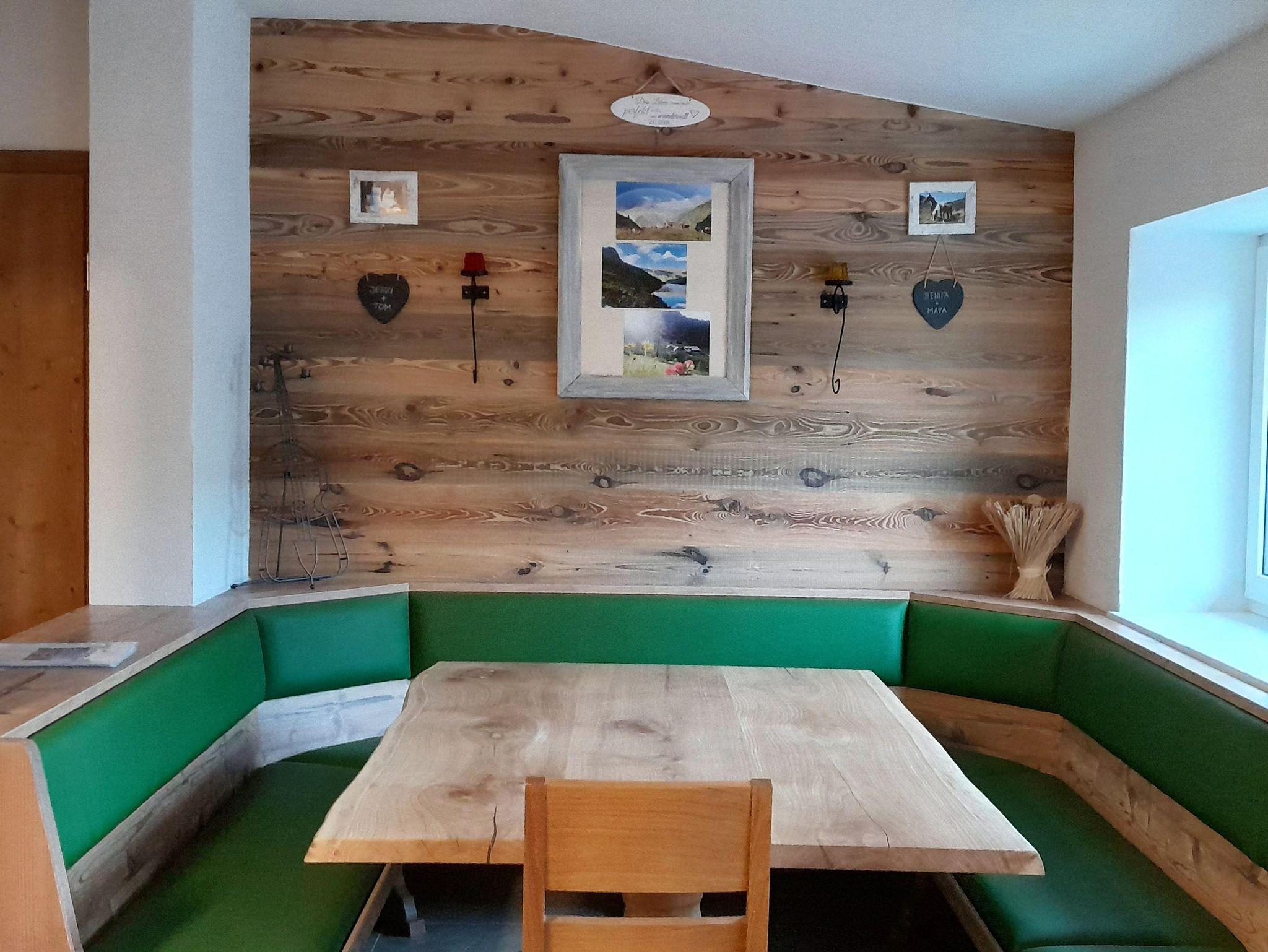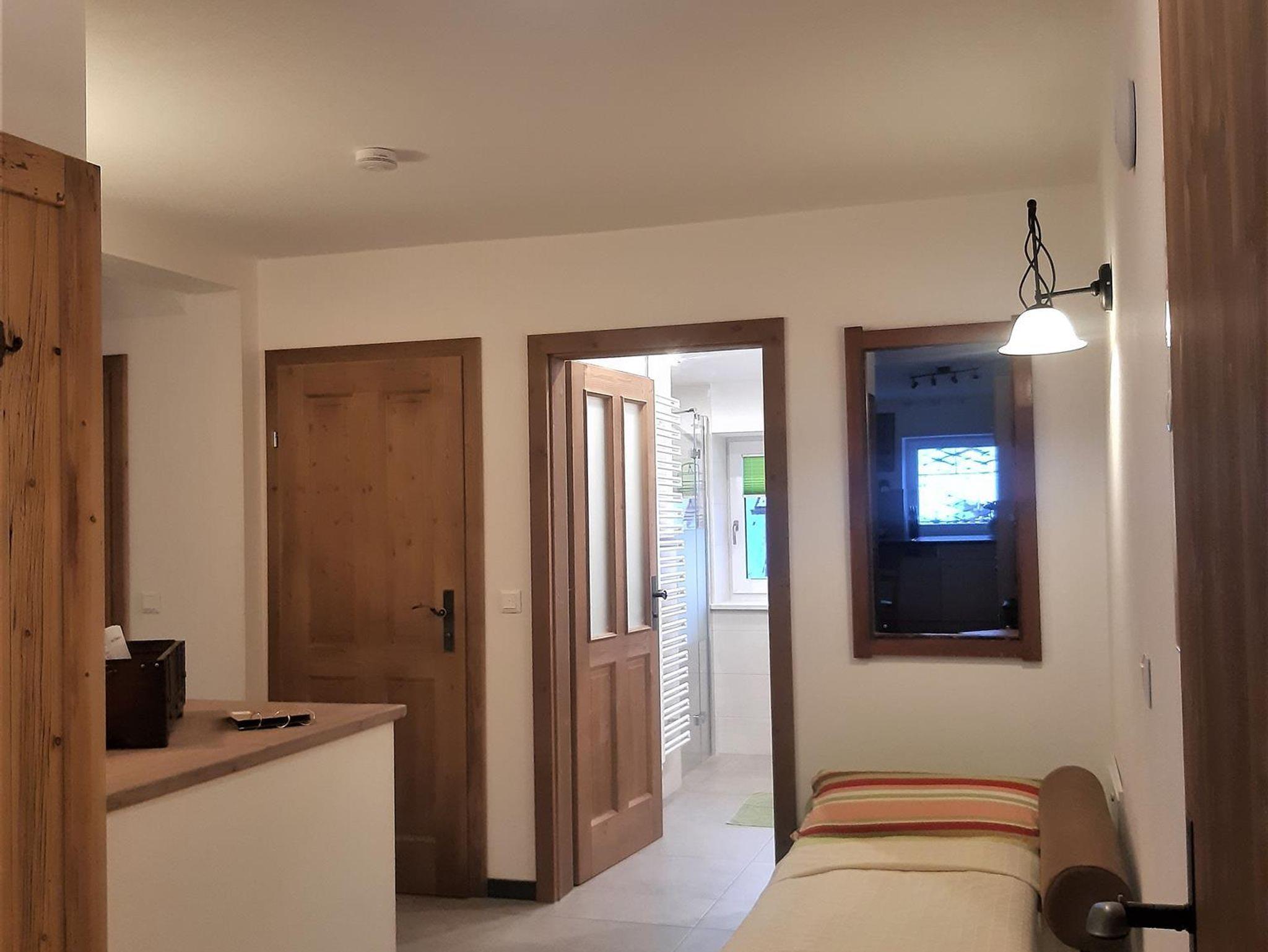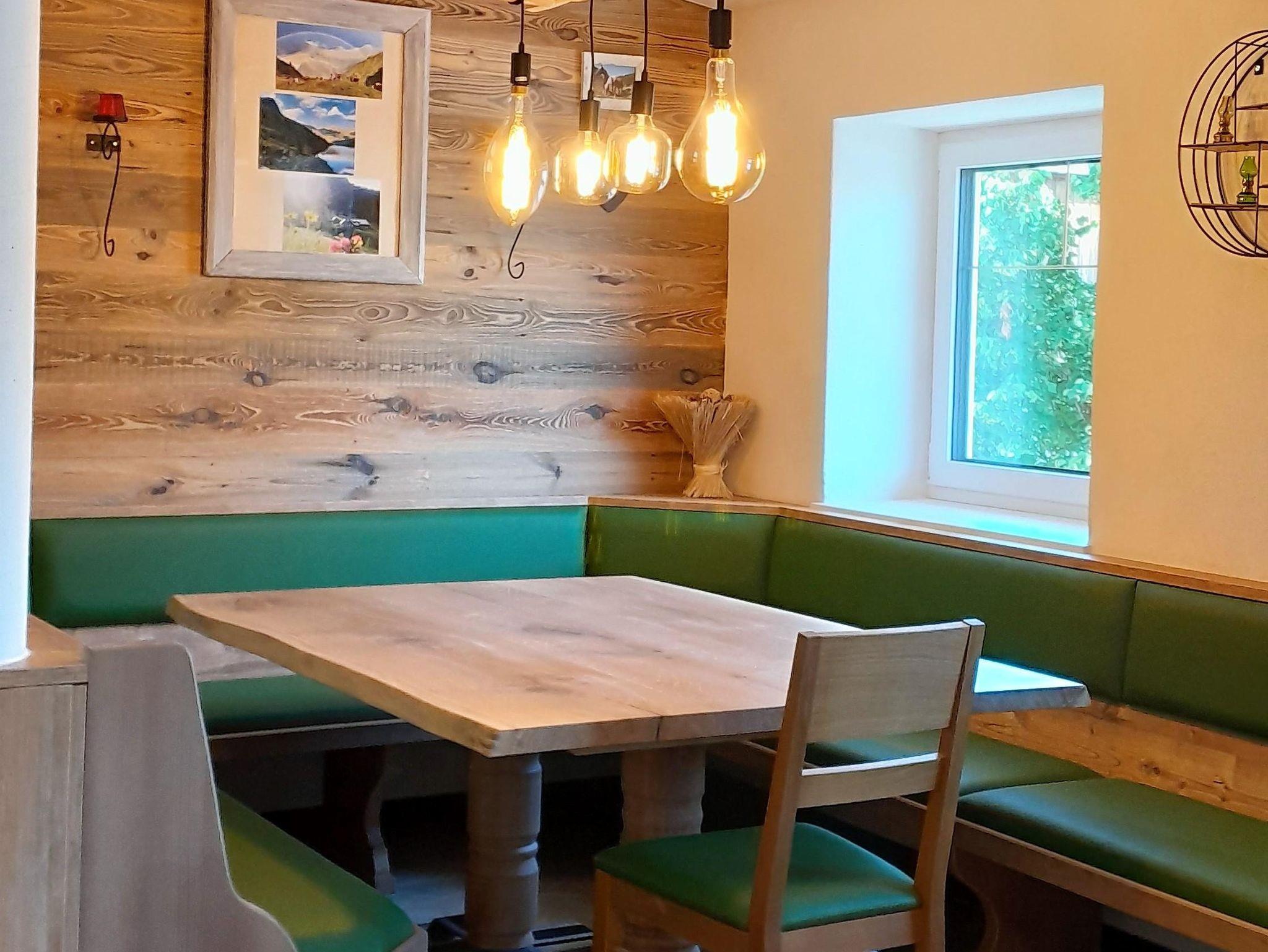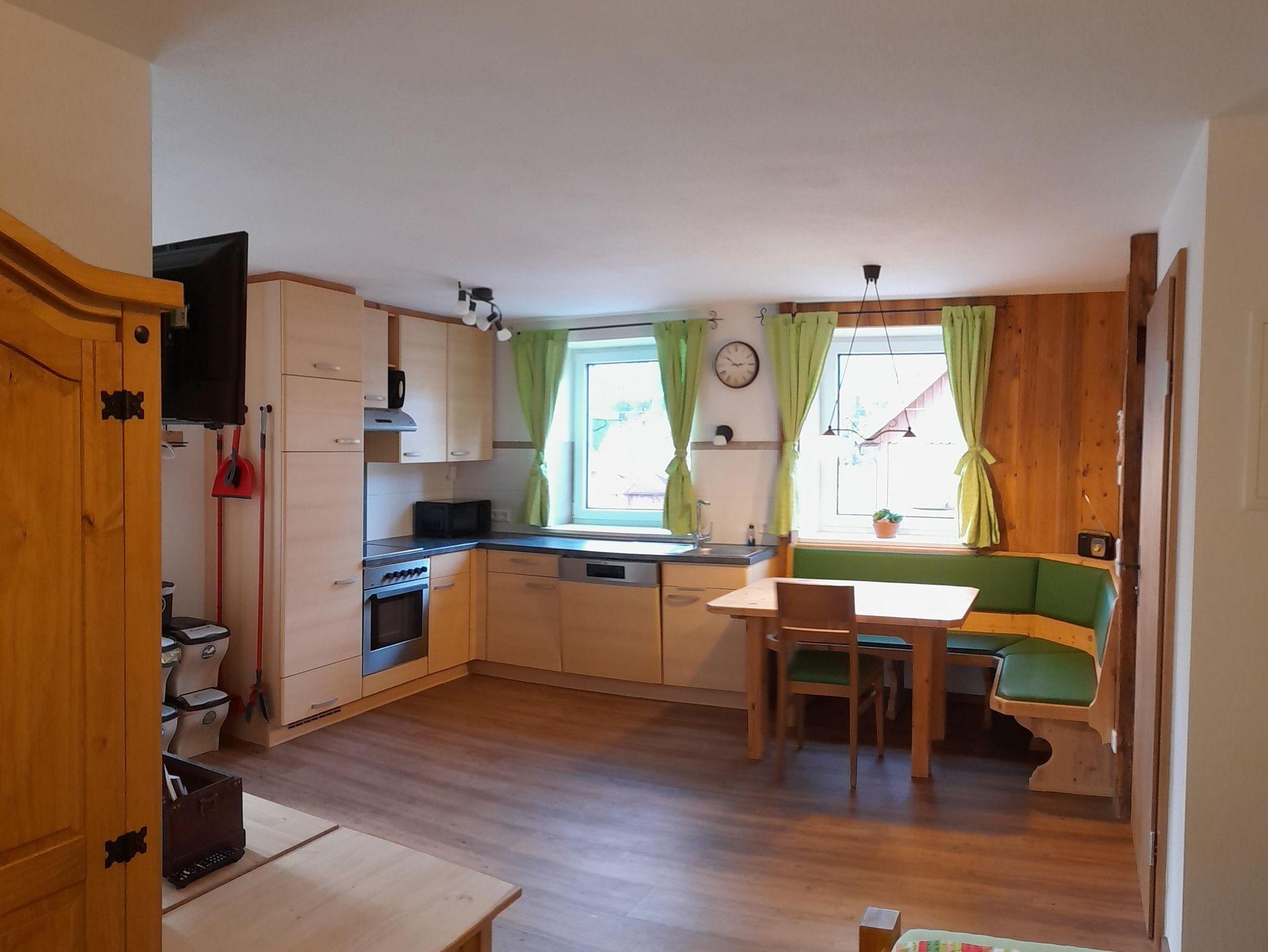 Küche mit uriger Eckbank und Tisch zum Sitzen für 10 Personen, Vorraum mit Garderobe und Liegecouch. Badezimmer mit Waschtisch, Badewanne und Dusche und ein extra begehbares WC. Ein Babybett kann auf Anfrage ebenso beigestellt werden.