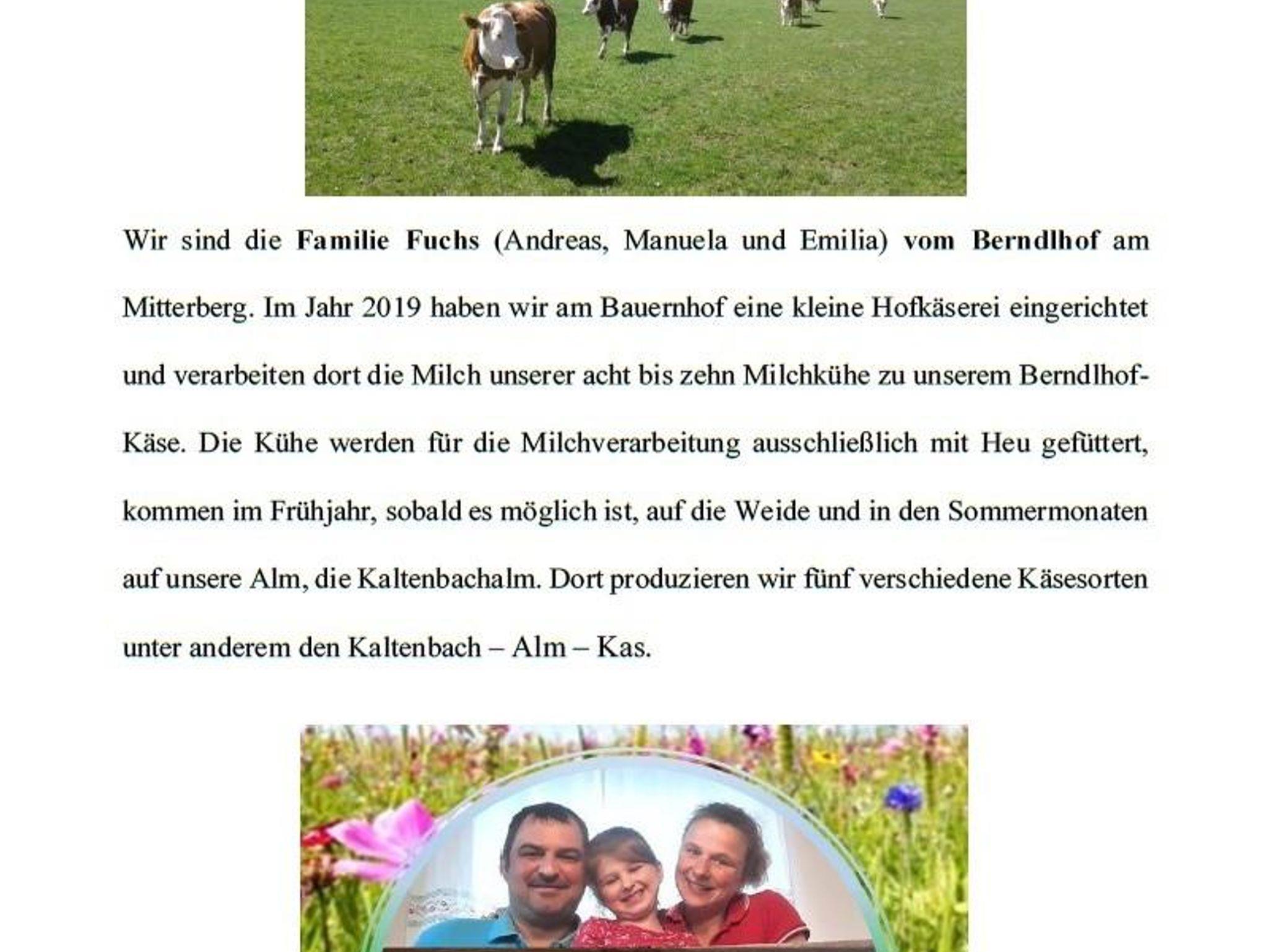 Im Jahr 2019 haben wir am Bauernhof eine kleine Hofkäserei eingerichtet und verarbeiten dort die Milch unserer Milchkühe zu unserem Berndlhof-Käse. Die Kühe werden für die Milchverarbeitung ausschließlich mit Heu gefüttert, kommen im Frühjahr, sobald es möglich ist, auf die Weide und in den Sommermonaten auf unsere Alm, die Kaltenbachalm. Dort produzieren wir fünf verschiedene Käsesorten unter anderem den Kaltenbach – Alm – Kas.