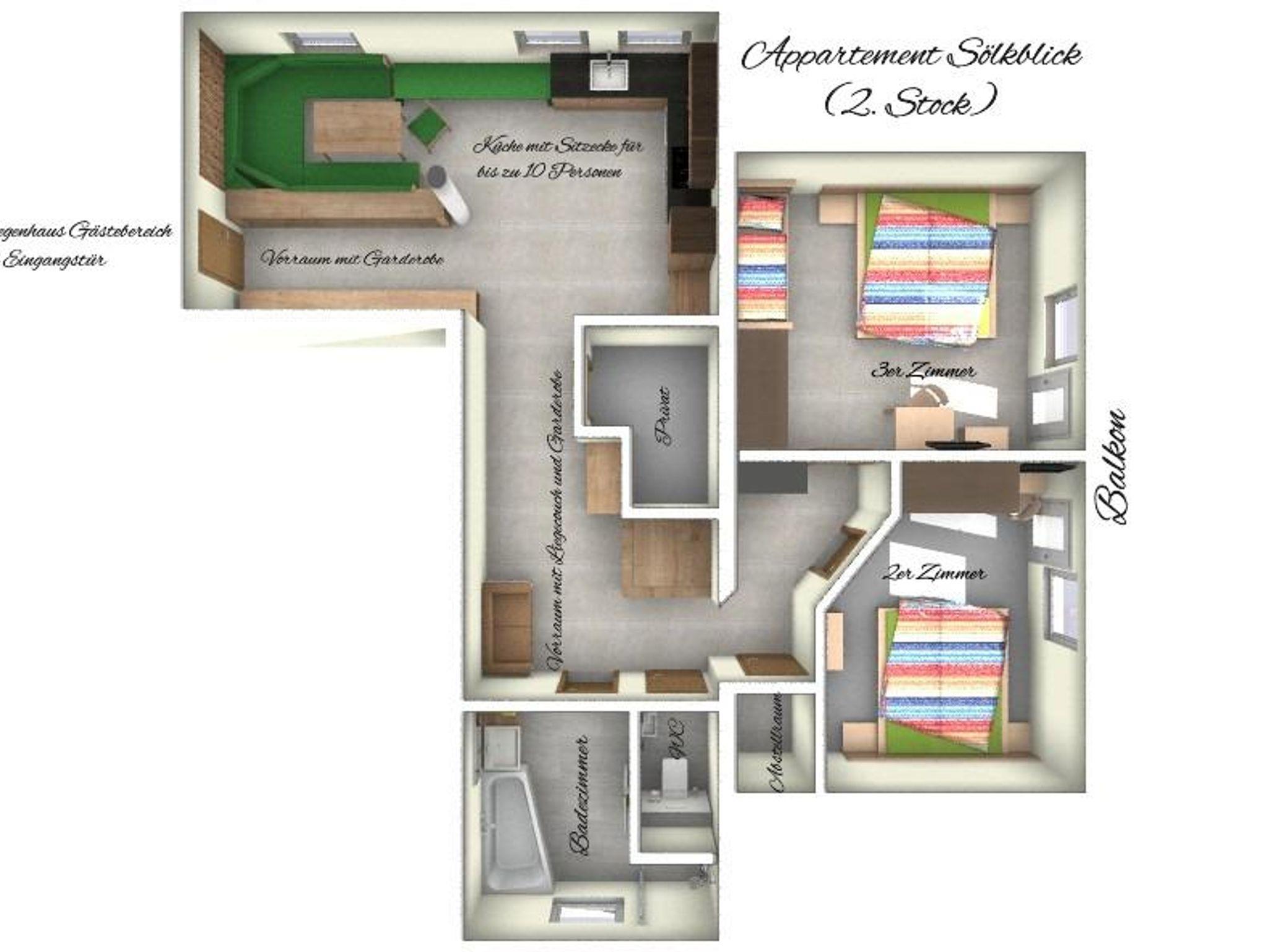 Das Appartement Sölkblick bietet auf ca. 68 m² ein freundliches Ambiente mit einer großzügigen Ausstattung für 4 Personen bis max. 6 Personen: 2 Schlafzimmer mit Fernseher, Tisch und Schrank. Beide Schlafzimmer mit einem Doppelbett (180 x 200 cm) und eines davon zusätzlich mit einem Einzelbett. Liegecouch für 1 Person im Vorraum;