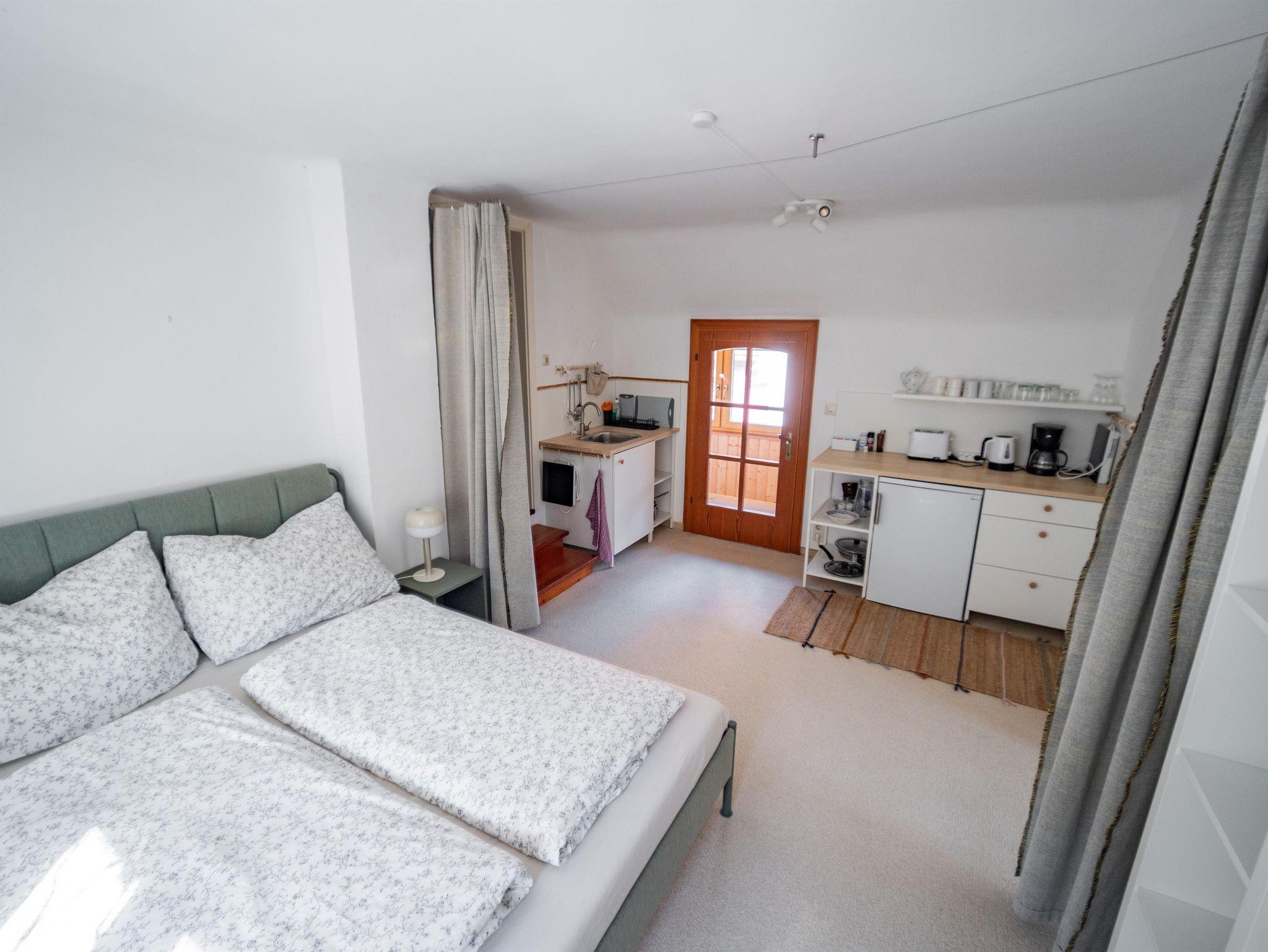 Die charmante Ferienwohnung befindet sich im 1. Stock und bietet einen wunderschönen Blick auf die Donau. Sie verfügt über zwei getrennte Zimmer, eine Küchennische, ein gemütliches Doppelbett und eine Schlafcouch für zusätzliche Gäste. Das großzügige Badezimmer ist mit einer Badewanne ausgestattet.