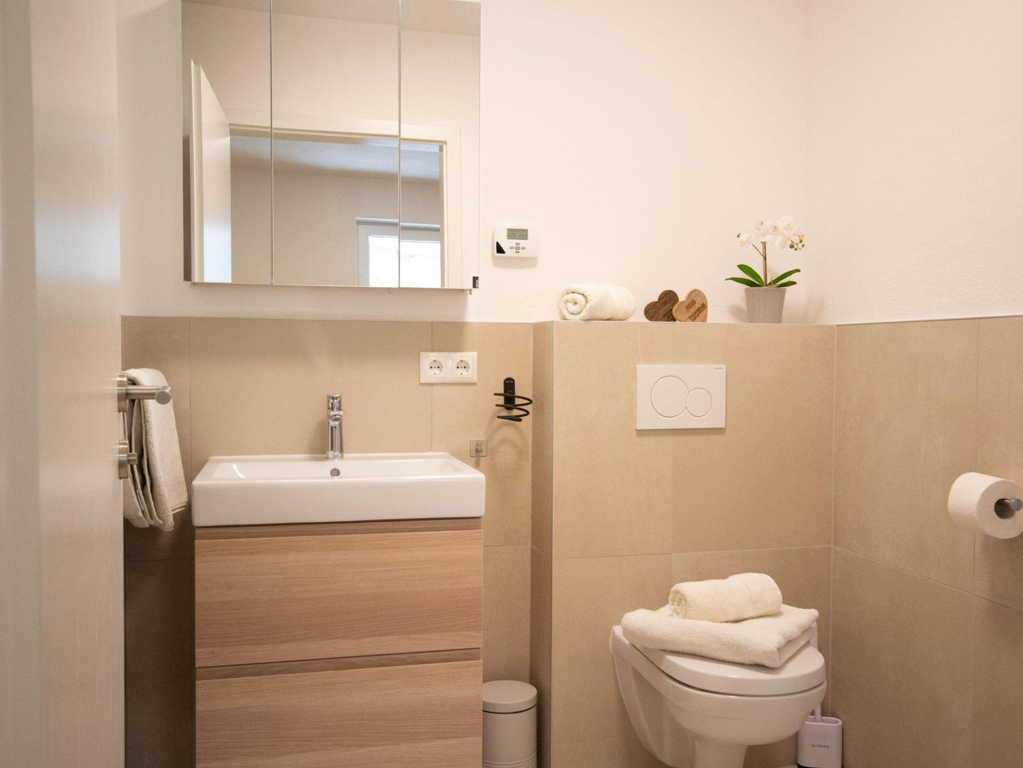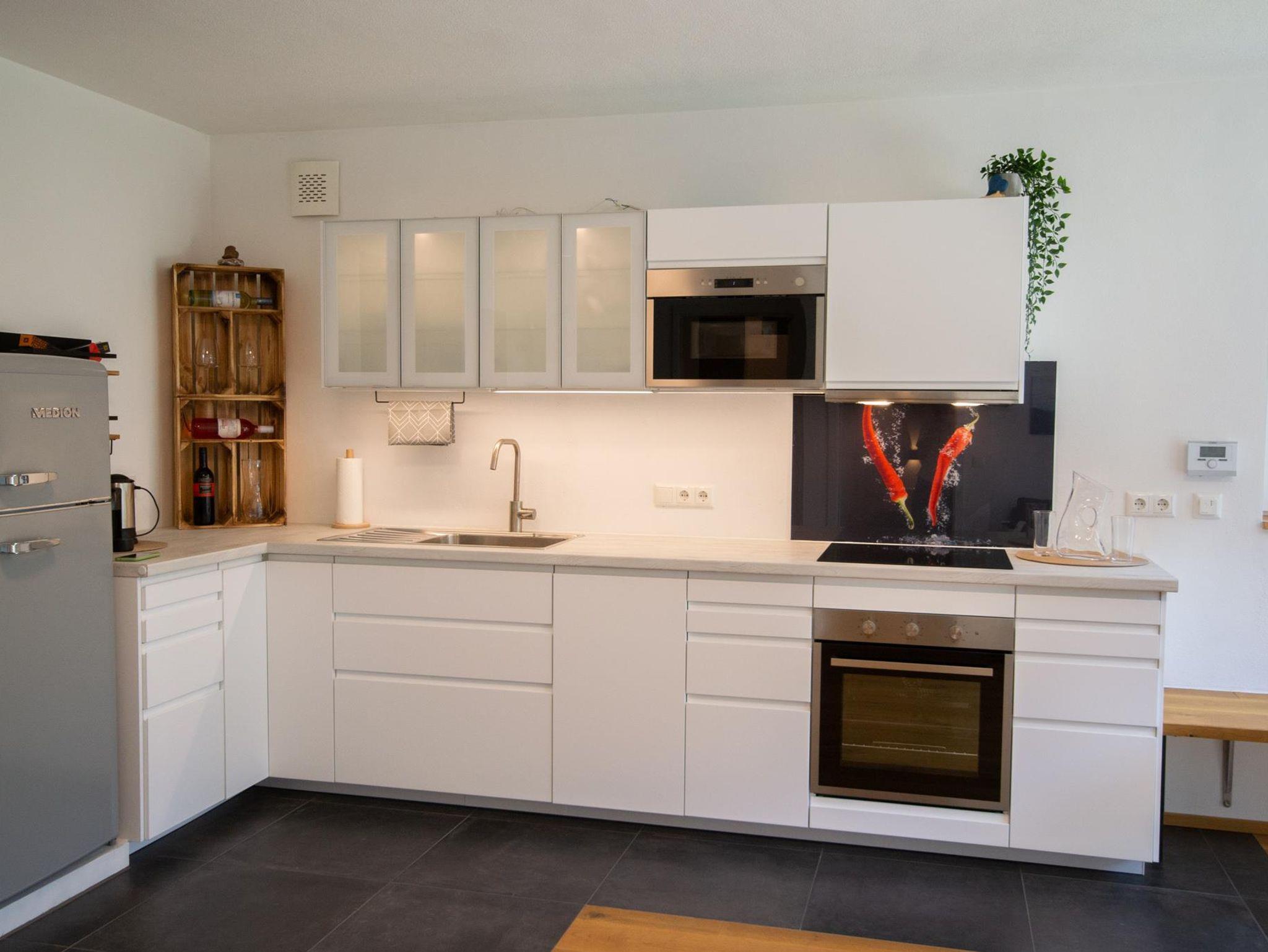 Die Ferienwohnung verfügt über einen gemeinsamen Wohn- und Essbereich mit voll ausgestatteter Küchenzeile (Herd, Backofen, Geschirrspüler, Dunstabzug, Kühlschrank mit Gefrierfach, Kaffeemaschine Nespresso und Wasserkocher), Smart-TV und W-LAN. Das Badezimmer ist von Schlafzimmer und Wohnküche begehbar und mit einer Dusche, WC, Waschmaschine und Kleiderständer ausgestattet. Das Schlafzimmer verfügt über ein Doppelbett (180x200). Zwei weitere Personen finden auf dem Schlafsofa (140x200) in der Wohnküche Platz. Direkt vor der Unterkunft steht Ihnen ein großer kostenloser Parkplatz zur Verfügung. Nach Absprache steht auch ein zweiter Parkplatz bereit. Die Ferienwohnung bietet zudem noch einen Außenbereich mit Rasen und gepflasterter Terrasse.