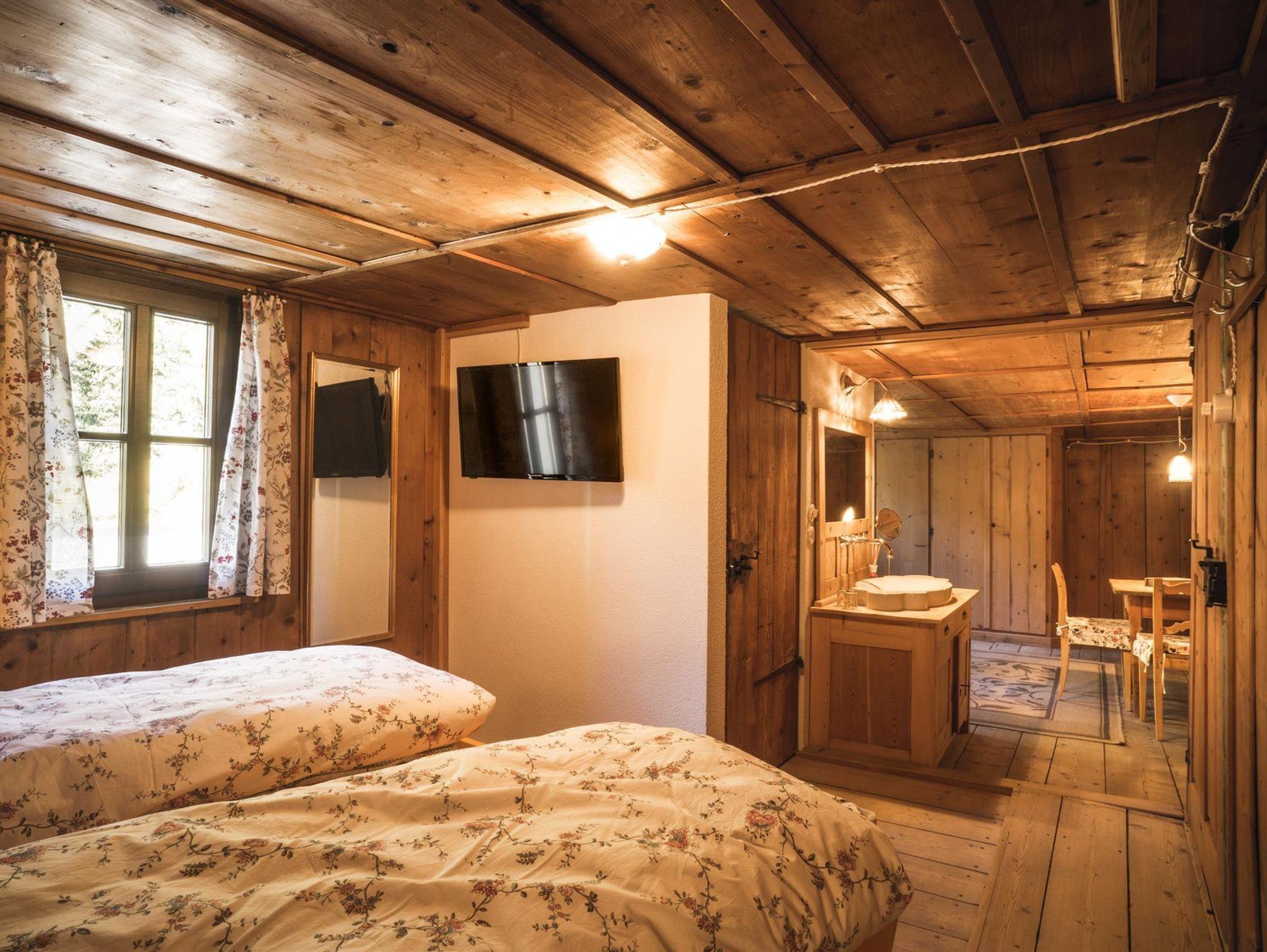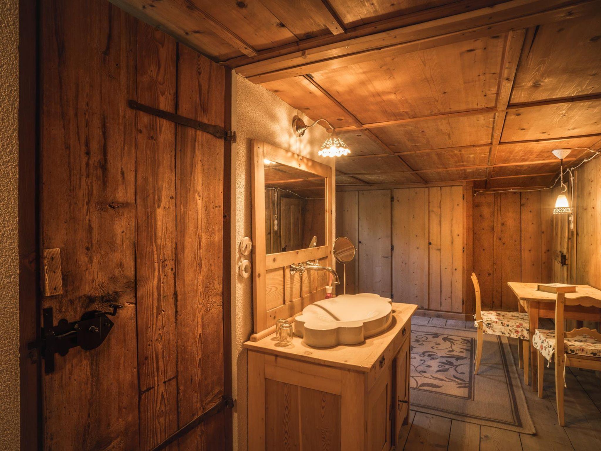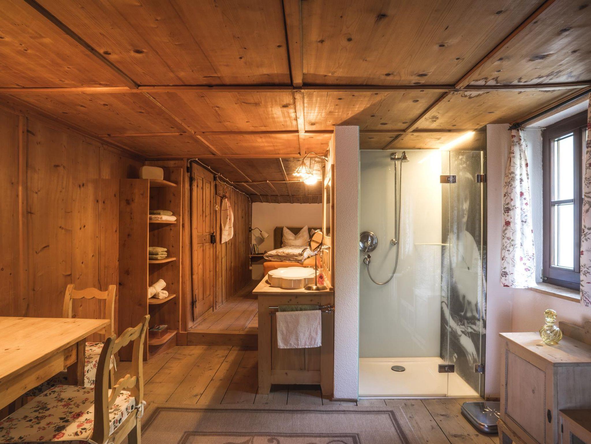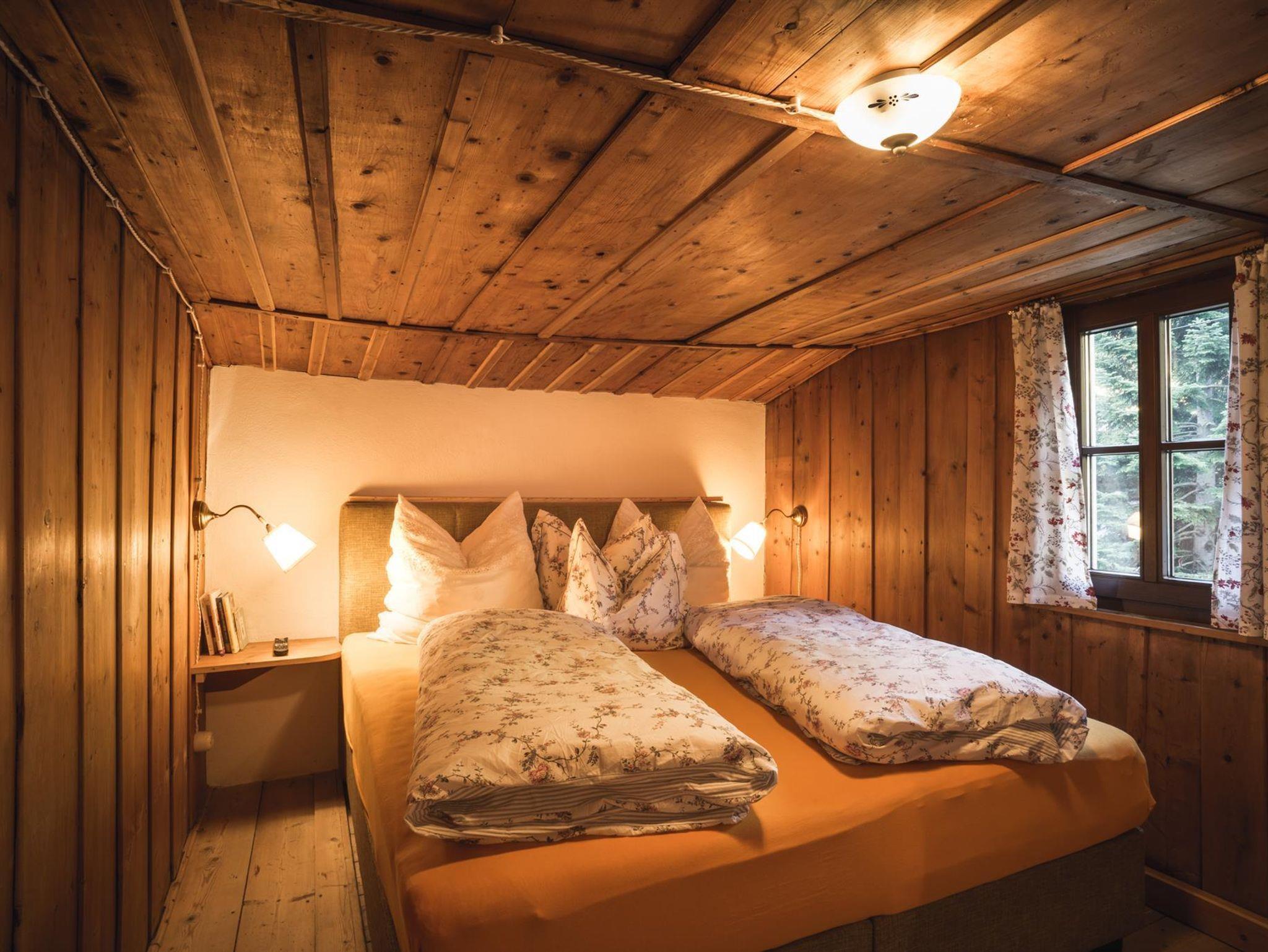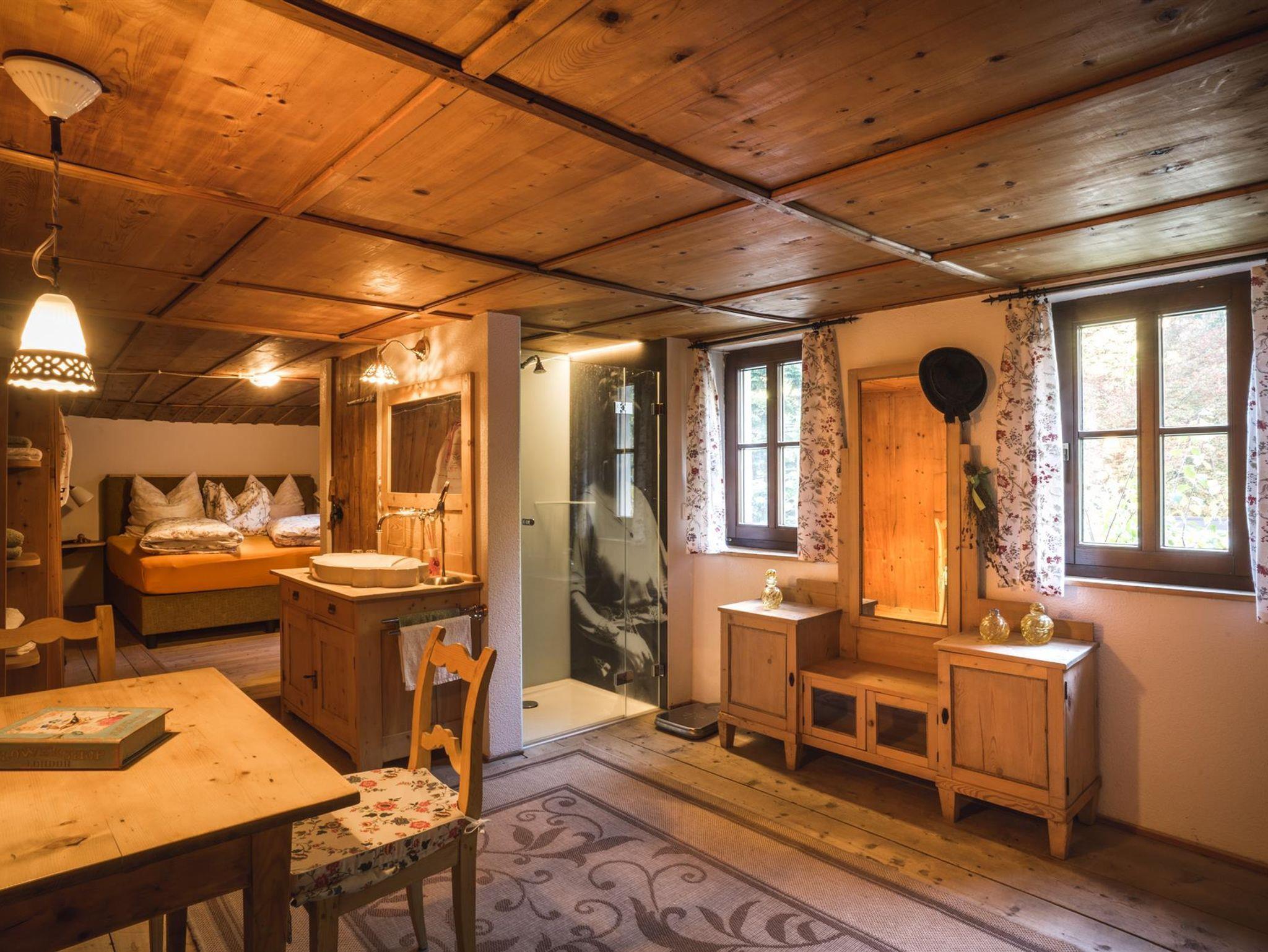 Als Kammerle bezeichnete man früher die mit Holz ausgetäfelten Zimmer. Diese Zimmer gehörte ursprünglich unserer Tante Zenzi (ihr Bild ist in der Duschrückwand verewigt). Wir haben es in seinem traditionellen und urigen Charakter nicht verändert, aber mit modernen Elementen ausgestattet: ein komfortables Boxspringbett, ein Flatscreen, eine große Dusche, ein WC, ein Waschtisch, eine Espressomaschine und ein kleiner Kühlschrank. Bademäntel für einen Sprung in den Pool im Sommer oder eine kurze Auszeit im Garten gibt es ebenfalls dazu.