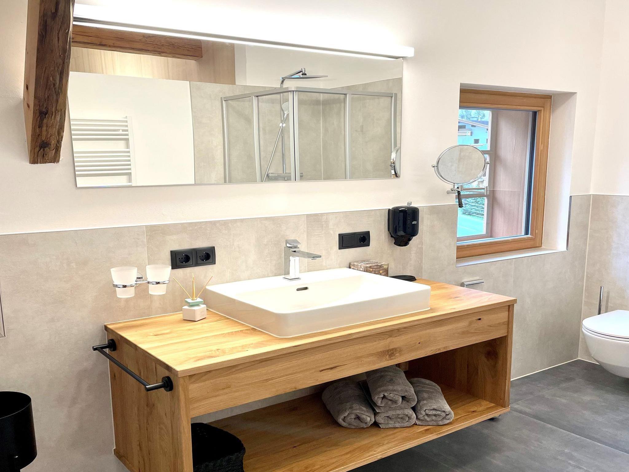 Die zwei modernen und neuwertigen 55 m² großen Appartements für 2 bis 4 Personen im ersten Stock verfügen über je ein Schlafzimmer mit Boxspringbett, eine Schlafcouch, einem offenen Wohn-, Koch-und Essbereich und einem Badezimmer mit Dusche und WC.