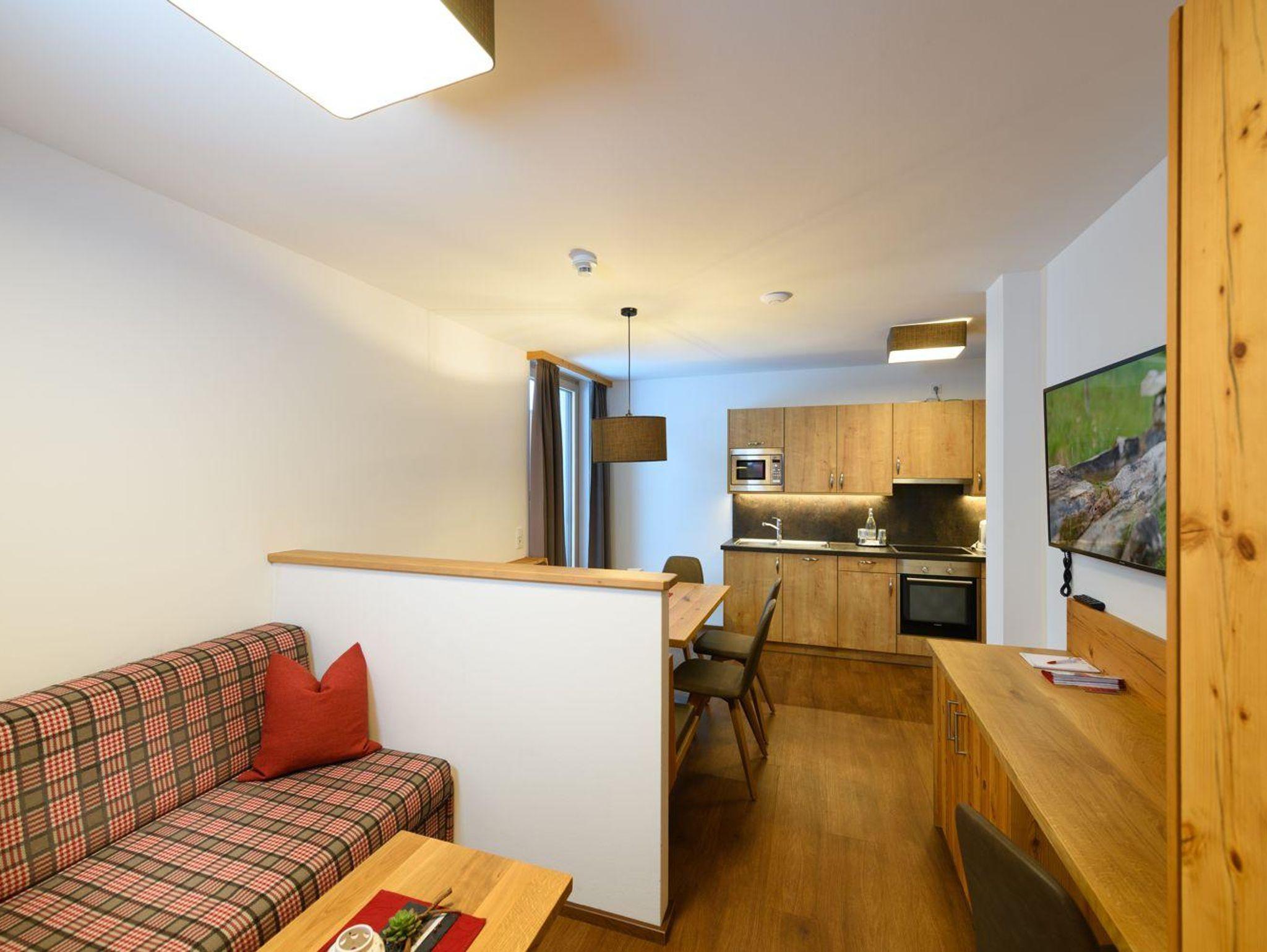 Im großen Wohnraum befindet sich eine Küchezeile, eine Eckbank sowie eine ausziehbare Doppelcouch mit Federkernqualität. Die Küche ist komplett mit Backrohr, E-Herd mit Cerankochfeld, Geschirrspüler, Wasserkocher, Kaffeemaschine sowie Kühlschrank mit Gefrierfach ausgestattet. Weiters verfügt das Appartement über 2 getrennte Schlafzimmer, Bad und WC getrennt. Eine Terrasse und ein Balkon runden das Angebot ab.