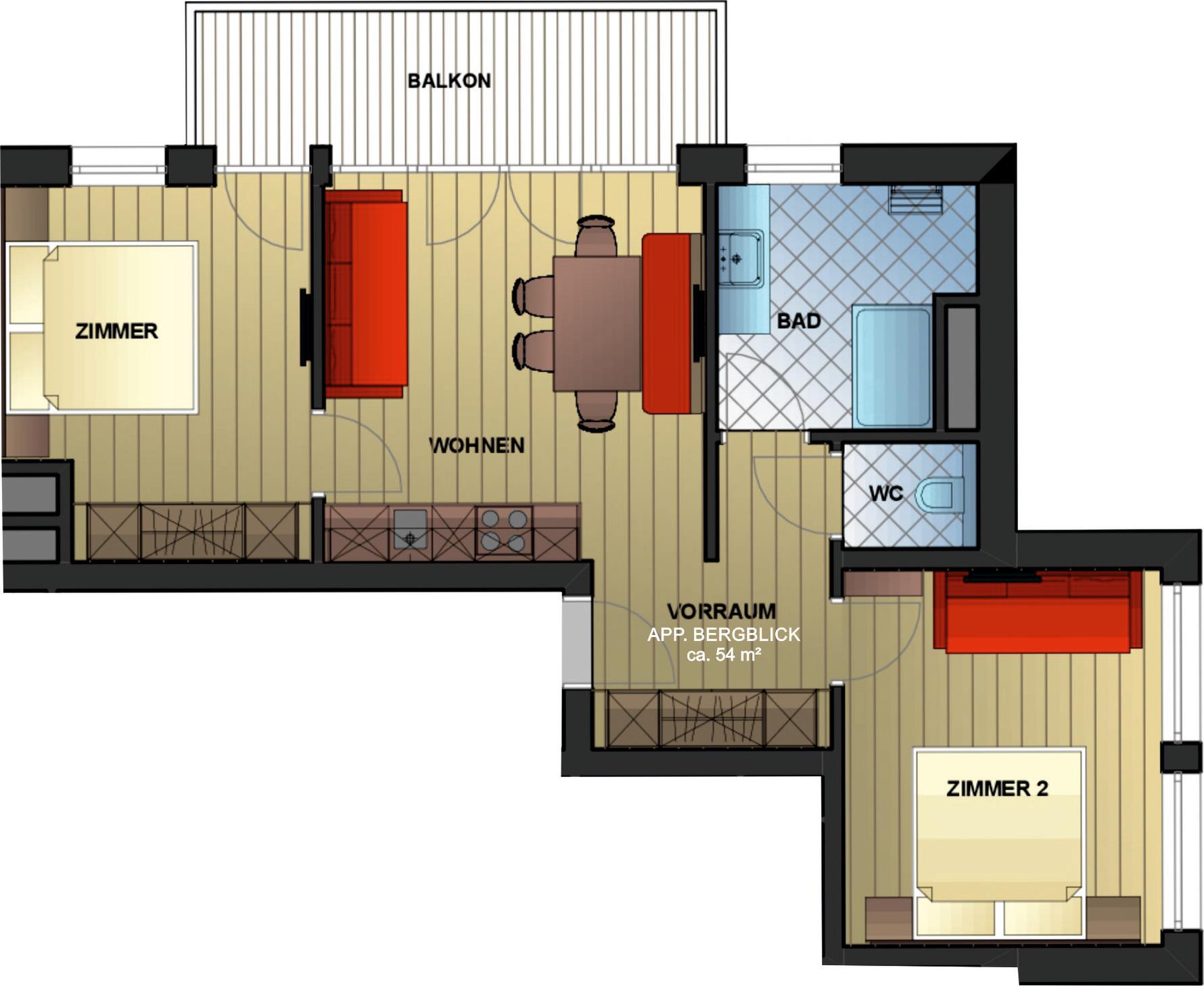 Das Appartement Bergblick hat eine Größe von ca. 55 m² und bietet genug Platz für bis zu 6 Personen. Die Dusche und das WC sind räumlich getrennt. Die Zimmer sind im alpinen Stil eingerichtet.