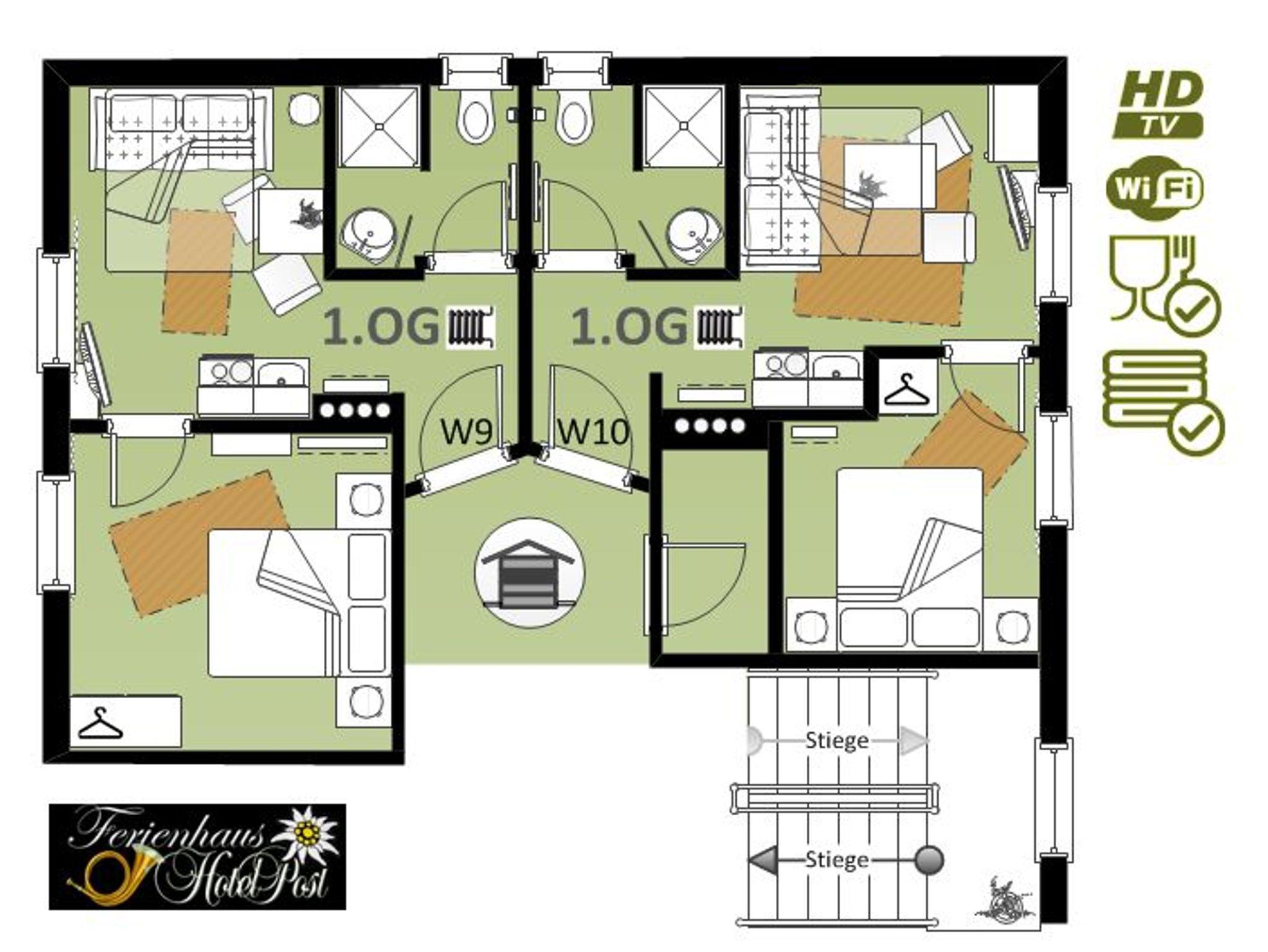 1. OG, Vorraum, Wohnzimmer mit Kochnische, Schlafzimmer, DU/WC - max 3 Pers. Die Wohnung ist für 2 Personen. Der Wohnbereich kann aber auch zum Schlafraum für 1 bis 2 Personen umfunktioniert werden. Die beiden Wohnungen W9 und W10 sind unmittelbar nebeneinander und gemeinsam ideal für Familien mit älteren Kindern. Da kann man ungestört den Urlaub genießen.