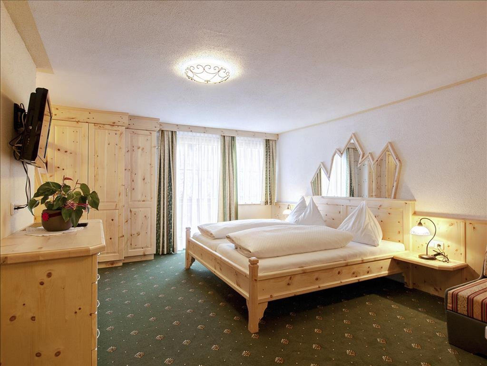 Neuwertiges Familienzimmer im Erdgeschoß mit gemütlicher Sofaecke und Zirbenholzmöbeln, 2 Doppelzimmer und Schlafmöglichkeit am Sofa für max. 5 Personen