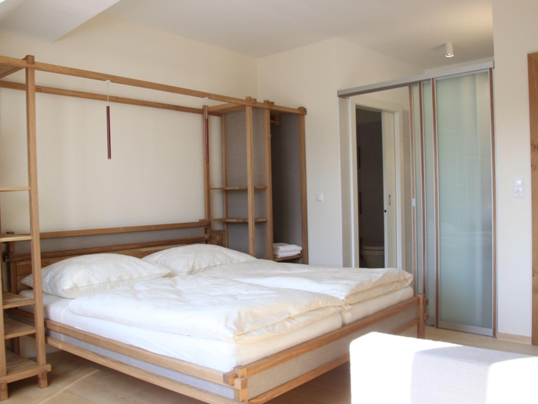 Unser zweites Zimmer mit dem Blick auf den Sonnberg – auf dessen Hochplateau unser frisch fruchtiger Grüner Veltliner namens „Juche“ wächst - ist auch mit heimischen hellen Naturholz ausgestattet. Der geflieste Boden in der Dusche und eine Wand im WC hat das Farbmuster eines Tischtuches von einem typischen Heurigentisch in rot-weiß-rosa gehalten.