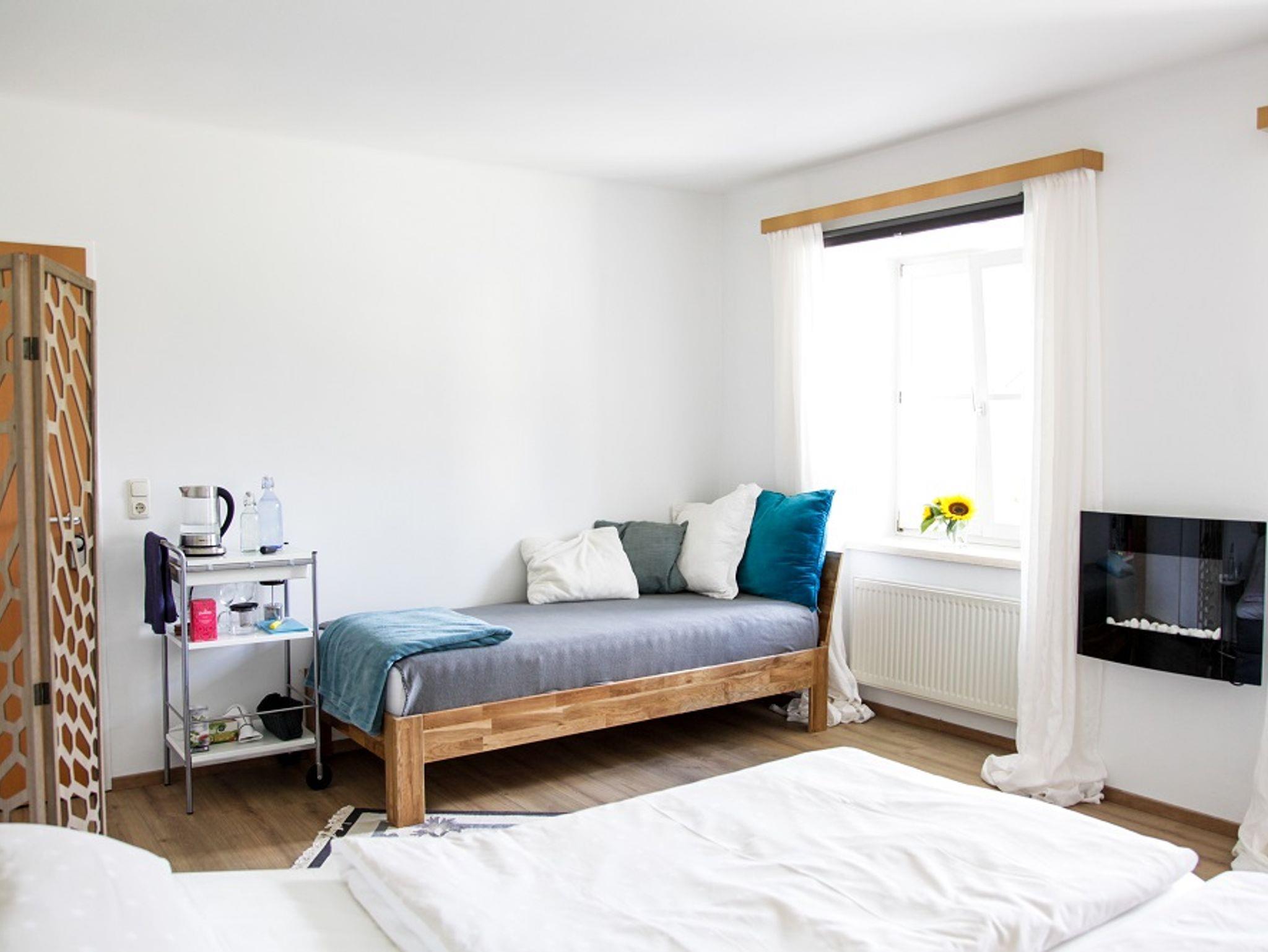 Ein Apartment, mit Zugang von der Gartenseite: ein Wohnzimmer mit Schlafcouch und ein Schlafzimmer mit Jogltisch. Ein neu saniertes Bad mit Dusche und Fußbodenheizung. Vorraum und im Wohnzimmer einer Küchenzeile. Auch dieses Apartment bietet Ihnen Zugang zu unserem Garten am See.