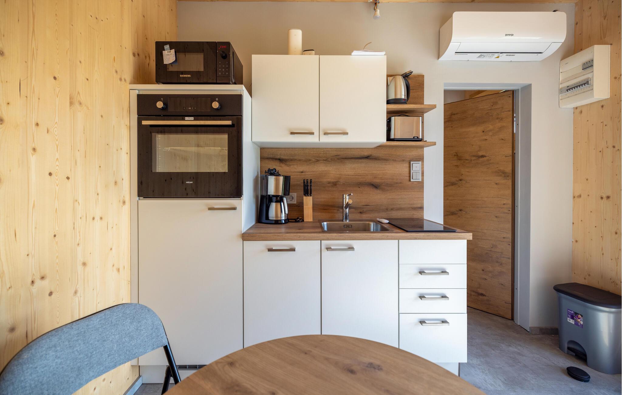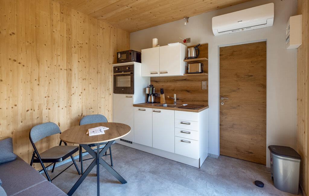 Dette hus byder jer velkommen med sit rene linjer, hvor alt har sin plads, fra det funktionelle køkken til den komfortable opholdsstue med en sofa og et lille bistrobord. Slap af og nyd feriestemningen her. Lav mad sammen, nyd jeres måltider med et godt glas vin, og afslut aftenen afslappende på sofaen.