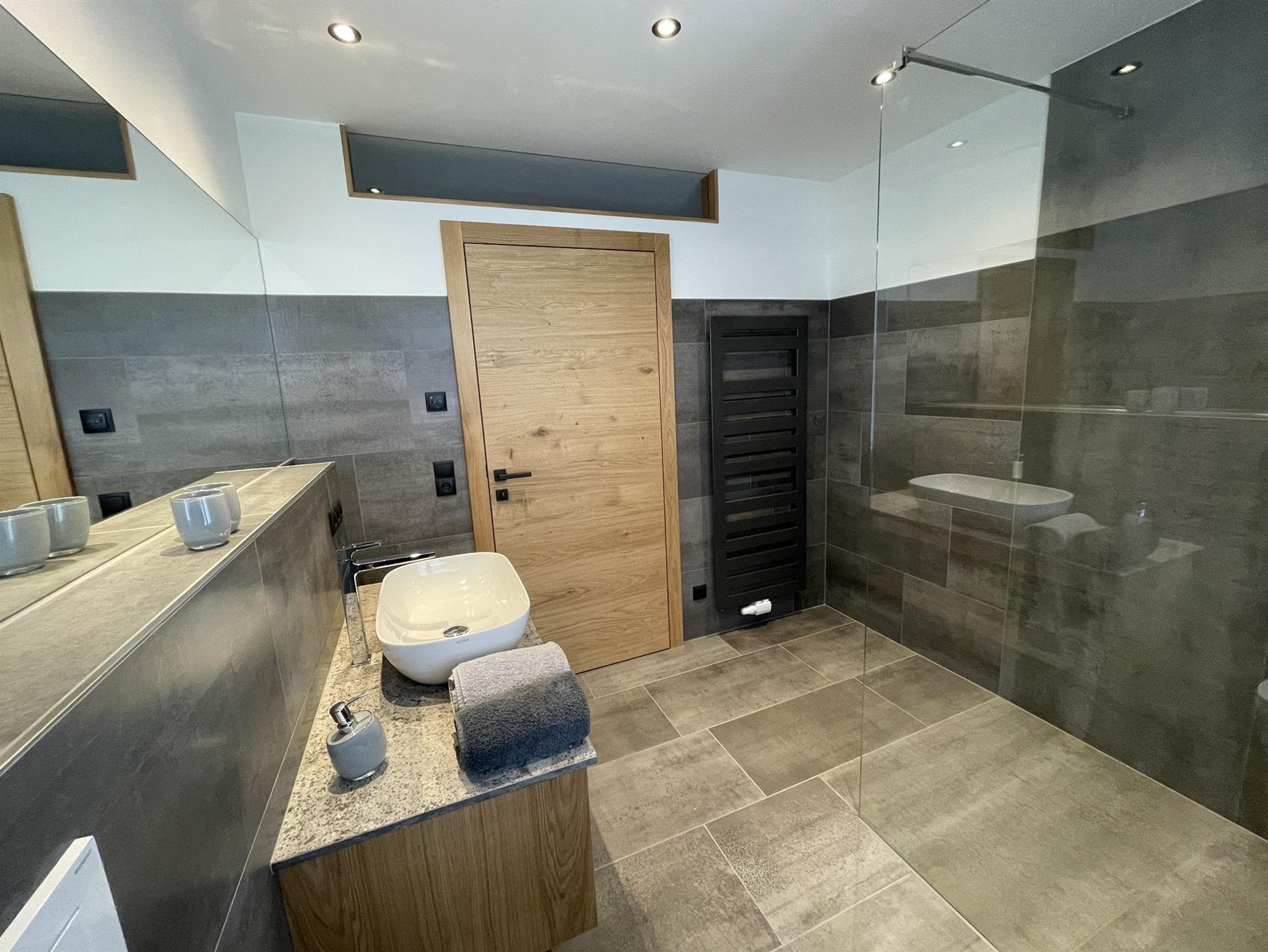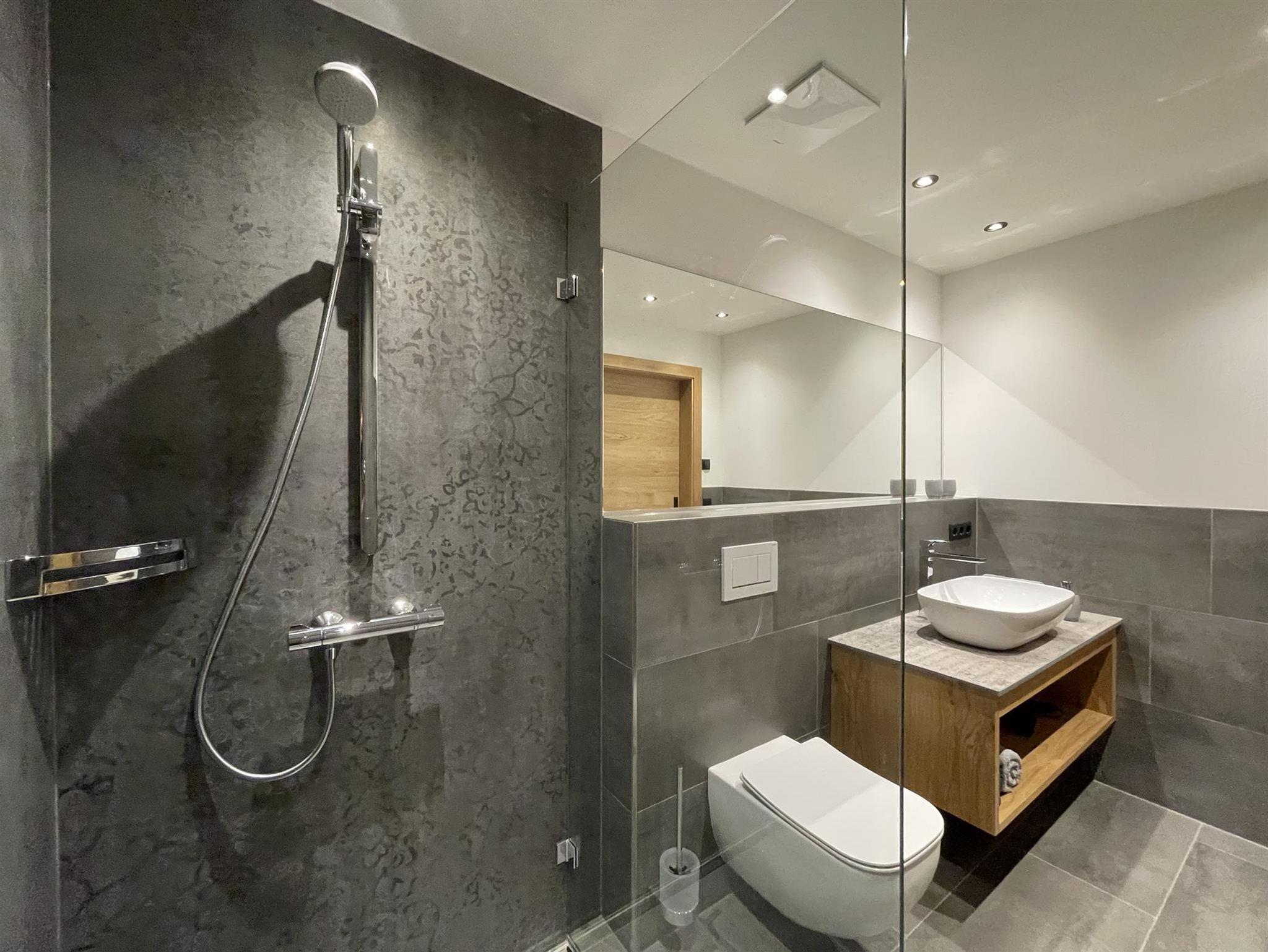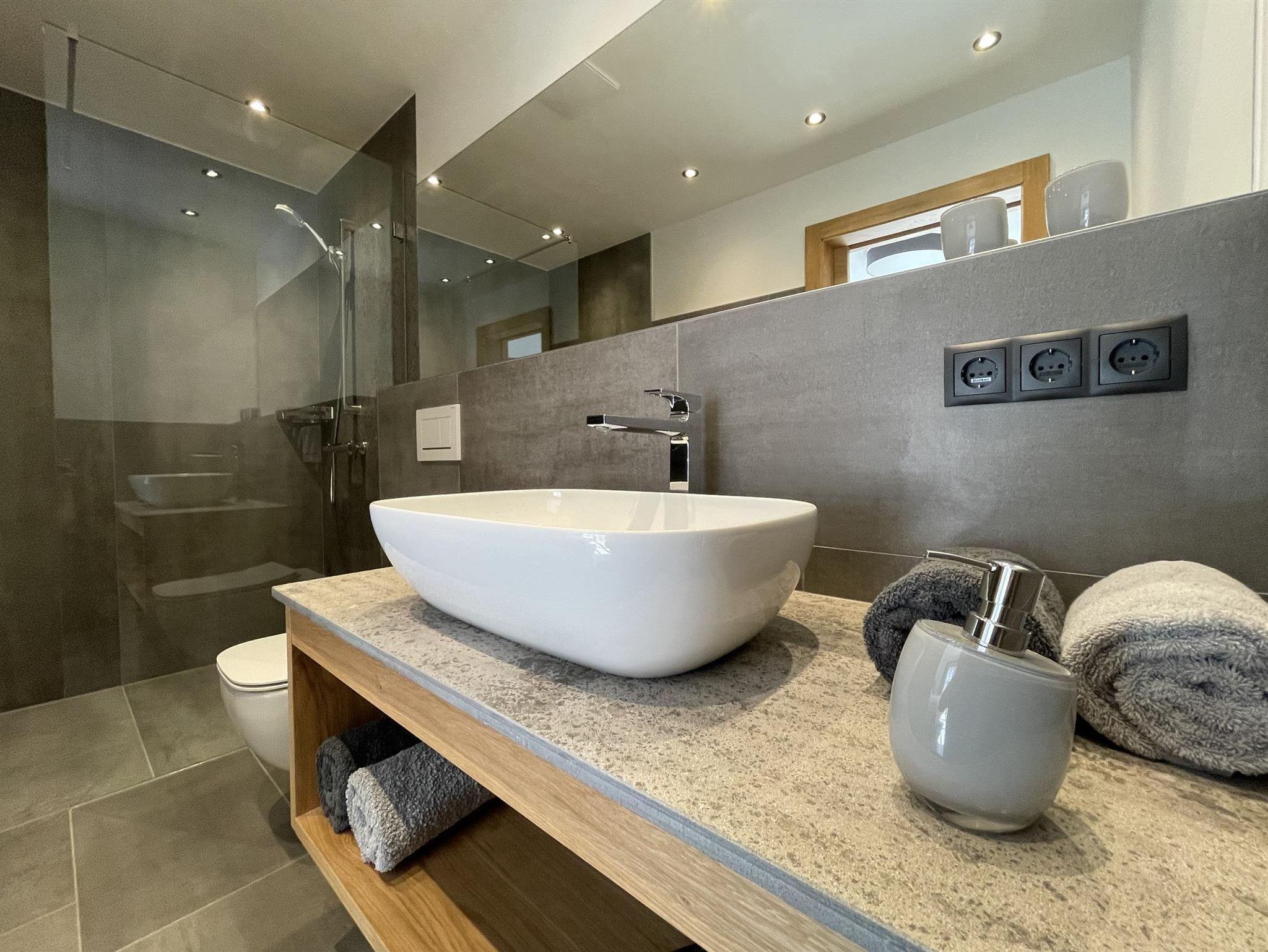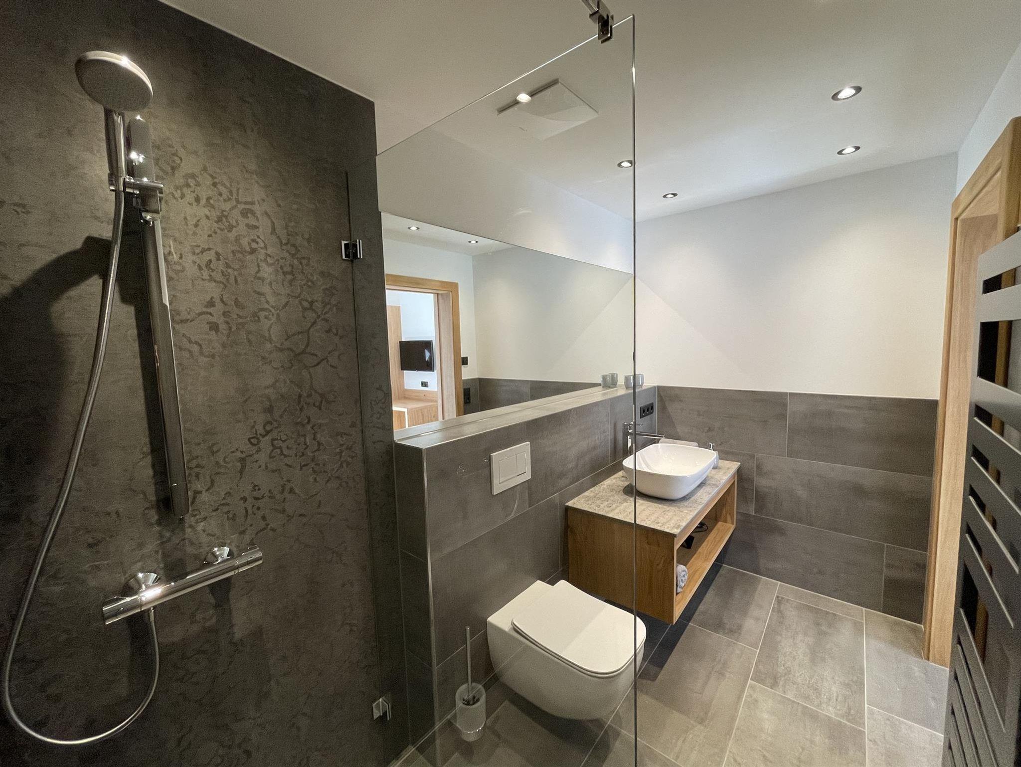 -Badezimmer: Dusche, WC, Handtuchtrockner, Föhn, Handtücher