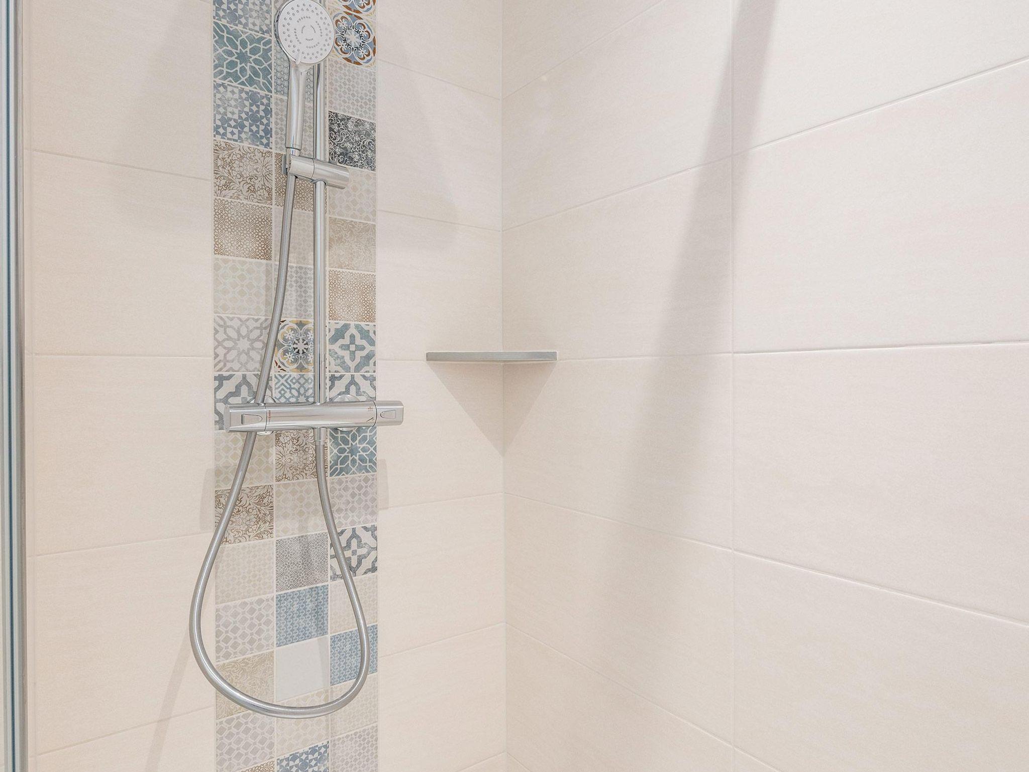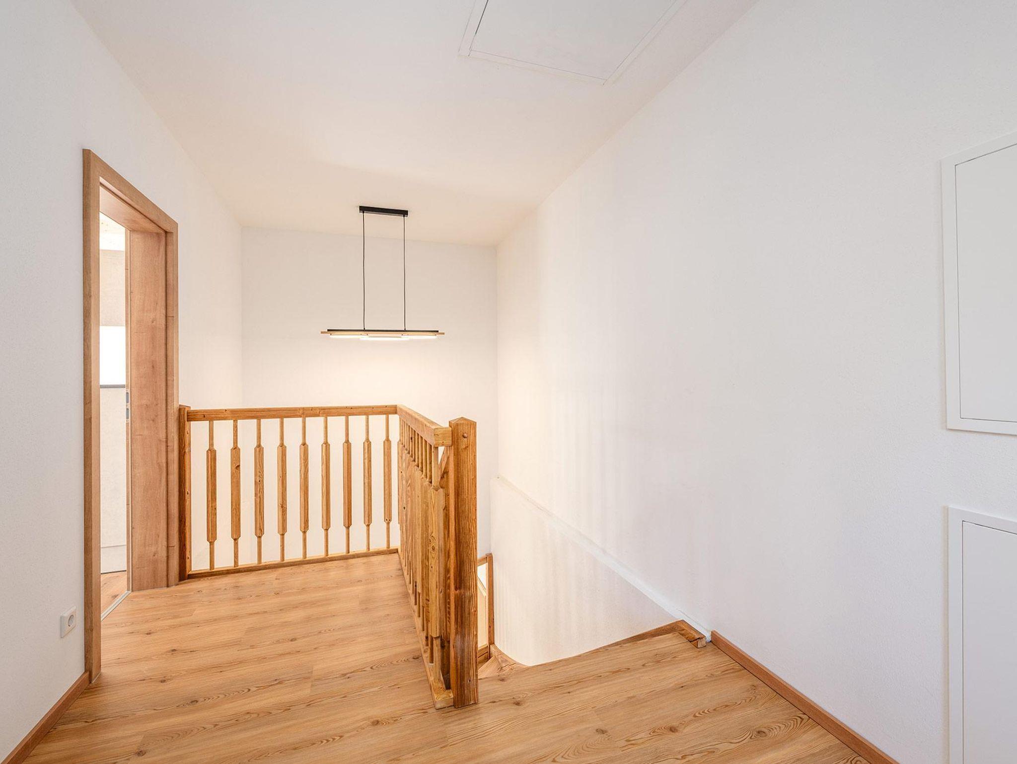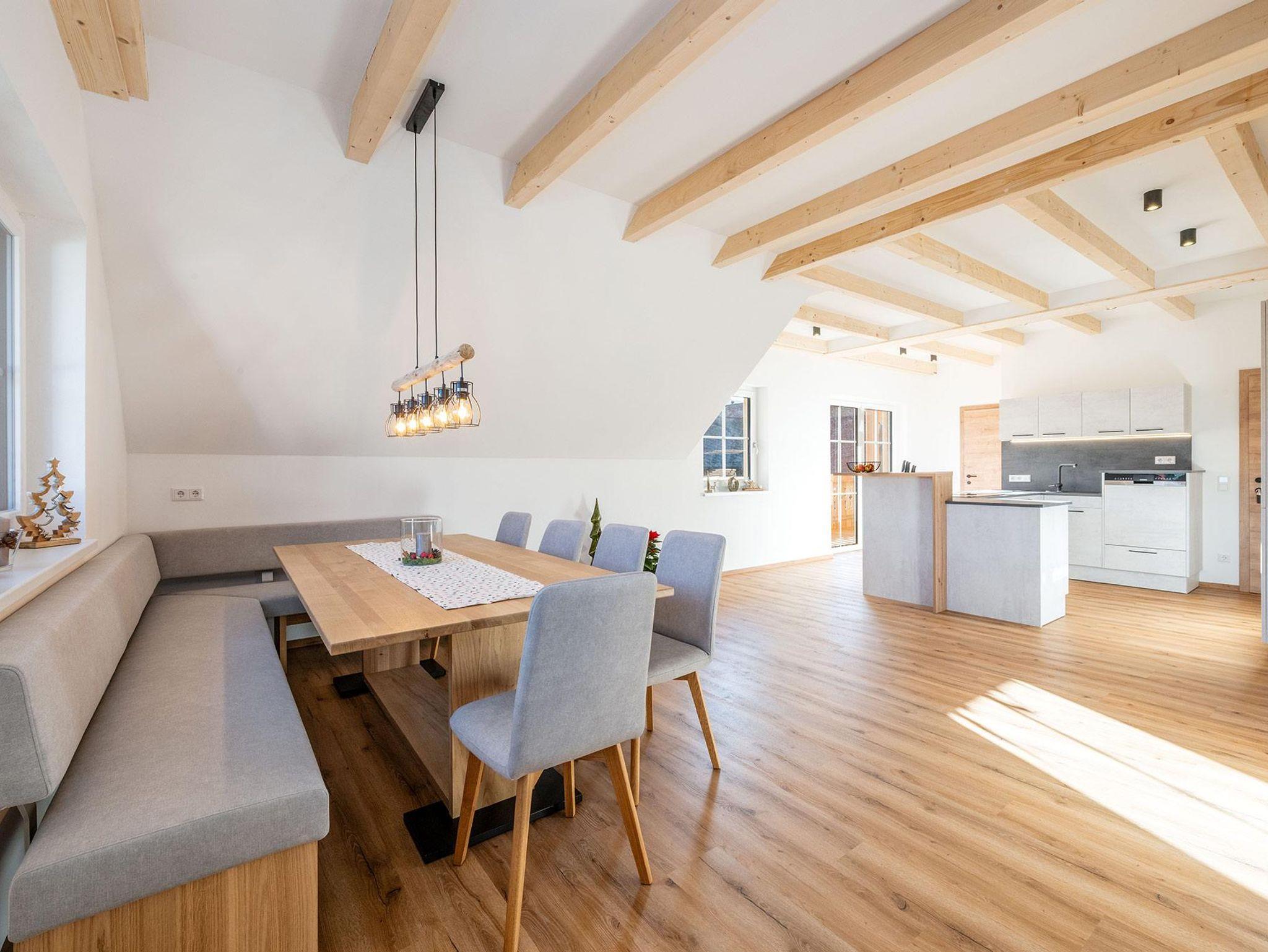 Ein besonderes Highlight ist das Altholz aus dem ehemaligen Dachstuhl, das behutsam aufgearbeitet und in den maßgefertigten Möbeln wiederverwendet wurde. Dieses historische Holz verleiht dem Apartment seine unverwechselbare Atmosphäre und verbindet jahrzehntealte Substanz mit modernem Wohnkomfort.