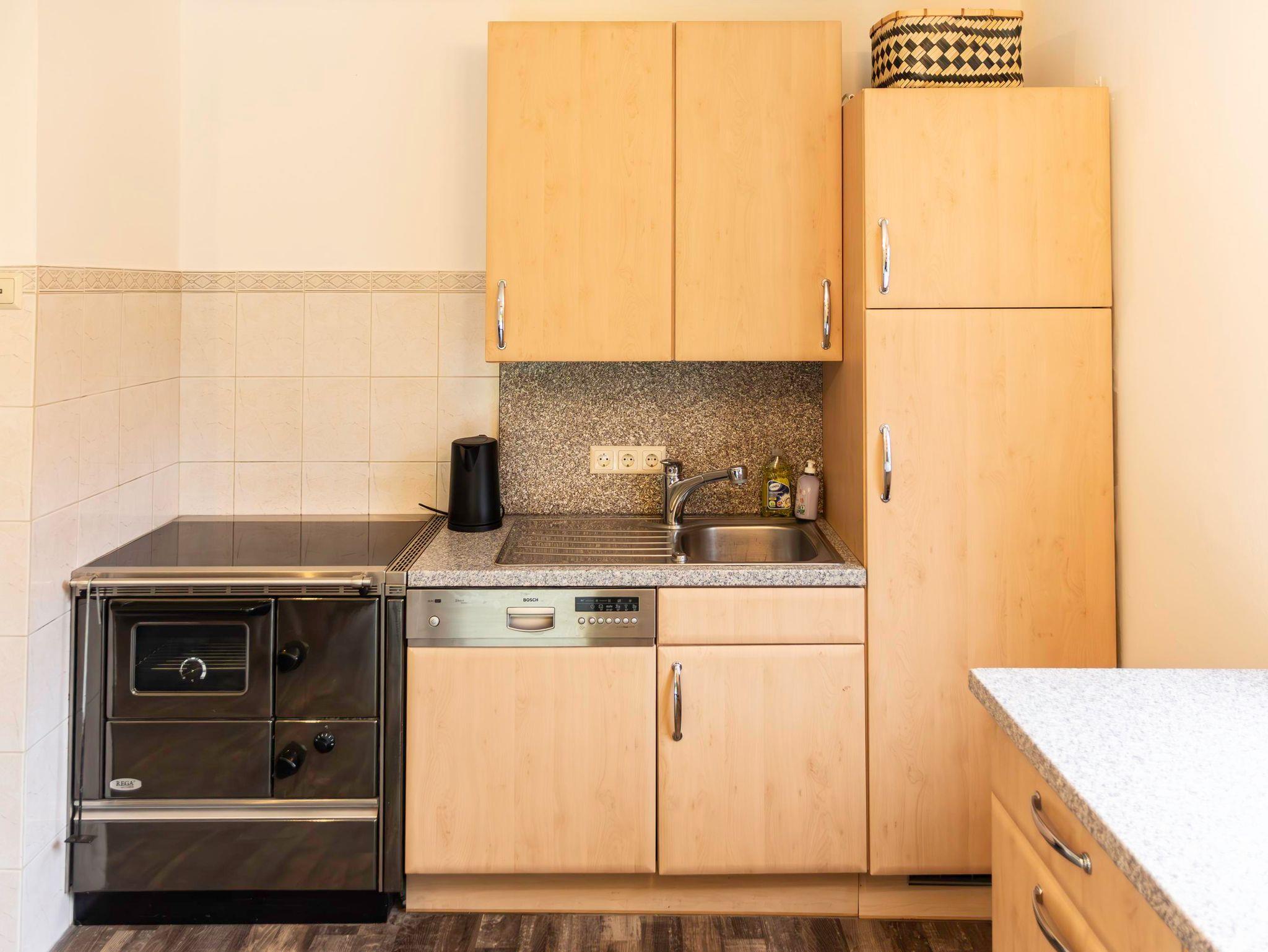 Unsere 90 m² großes Apartment 1 im Obergeschoss bietet Platz für bis zu 6 Personen. Es verfügt über 3 getrennte Schlafzimmer (jeweils mit Flat-TV) und eine voll ausgestattete Küche mit gemütlicher Essecke. Zwei der Schlafzimmer befinden sich auf einer Ebene, das dritte Schlafzimmer erreicht man über eine Treppe. Die Wohnung verfügt außerdem über ein Badezimmer mit großer Dusche und Blick auf das Dachstein-Massiv. Das WC ist separat. Der kleine Balkon mit Sitzgelegenheit, erreichbar über die Küche, bietet einen Blick in unseren schönen Garten.