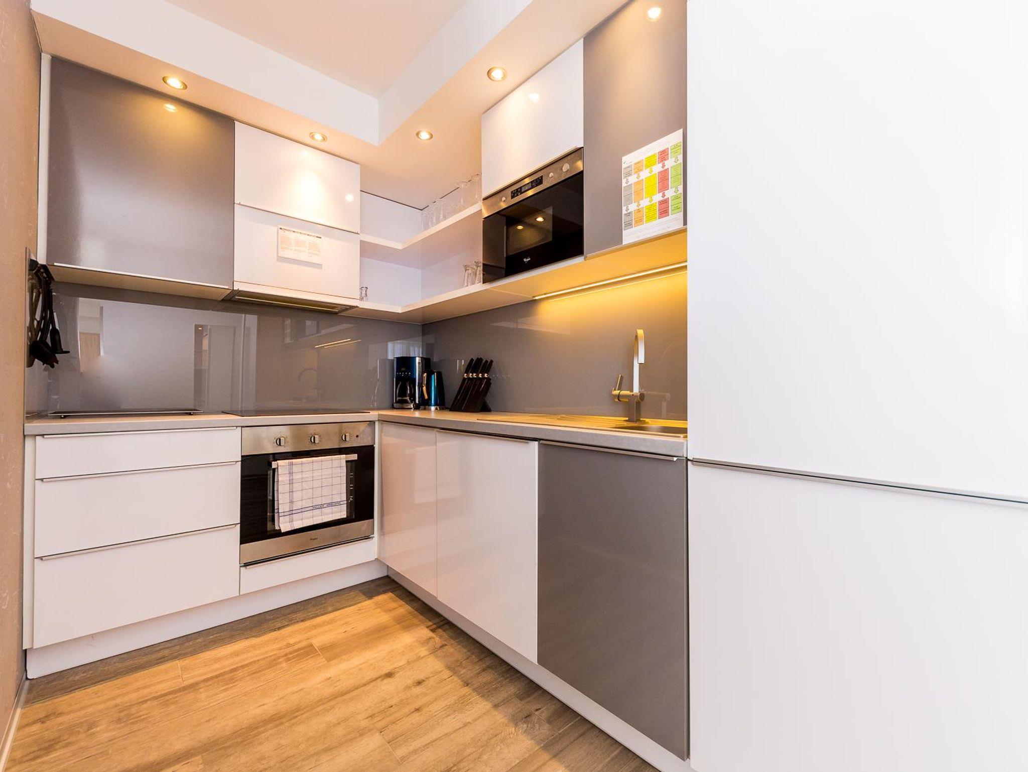 Appartement mit Wohnzimmer und separatem Schlafzimmer mit einem Doppelbett und mit einem ausziehbaren Sofa. Das Midi Appartement beinhaltet eine Essdiele, eine komplett ausgestattete Kochecke, ein Badezimmer mit Dusche und eine Terrasse (25-35m2).