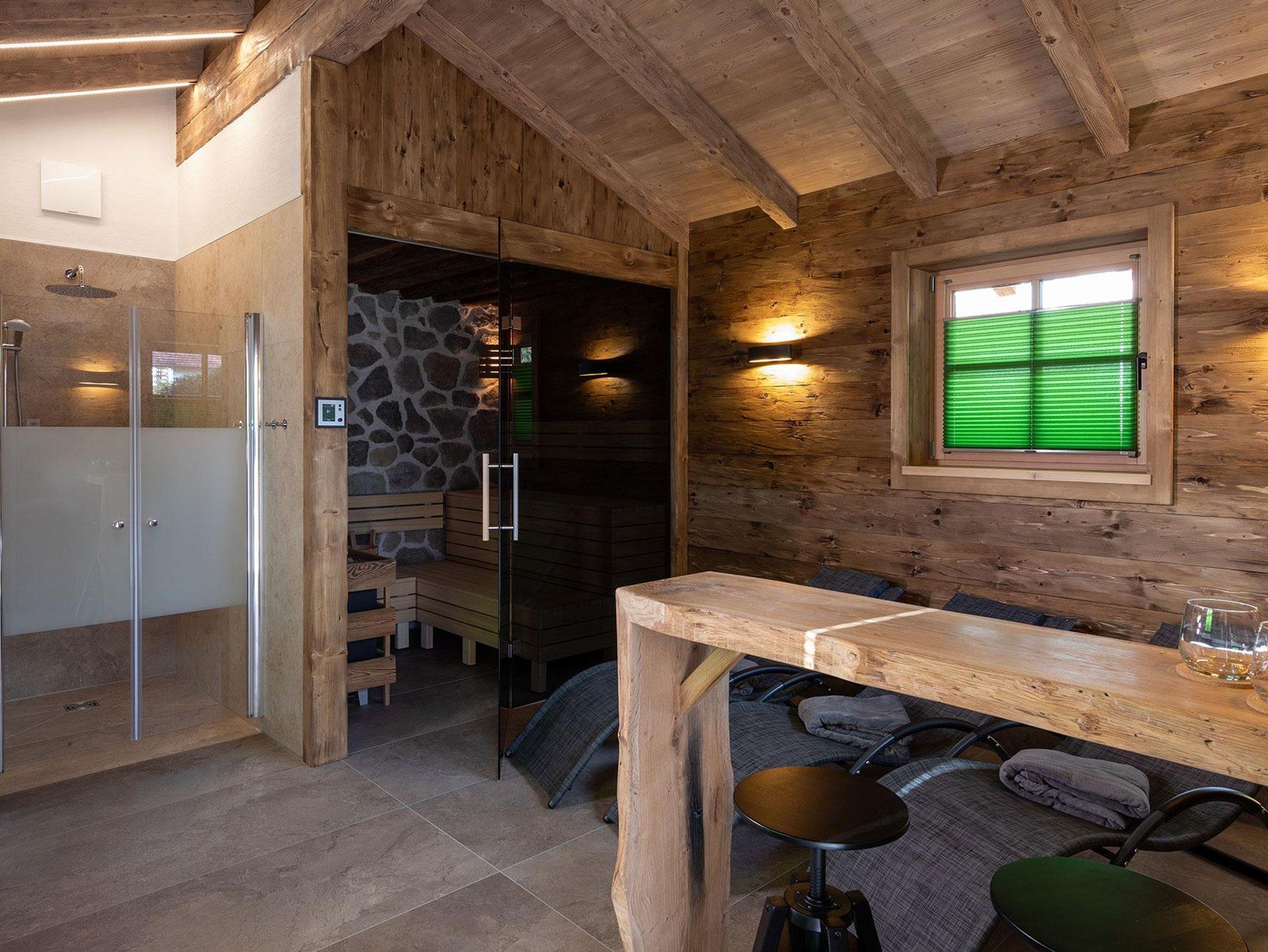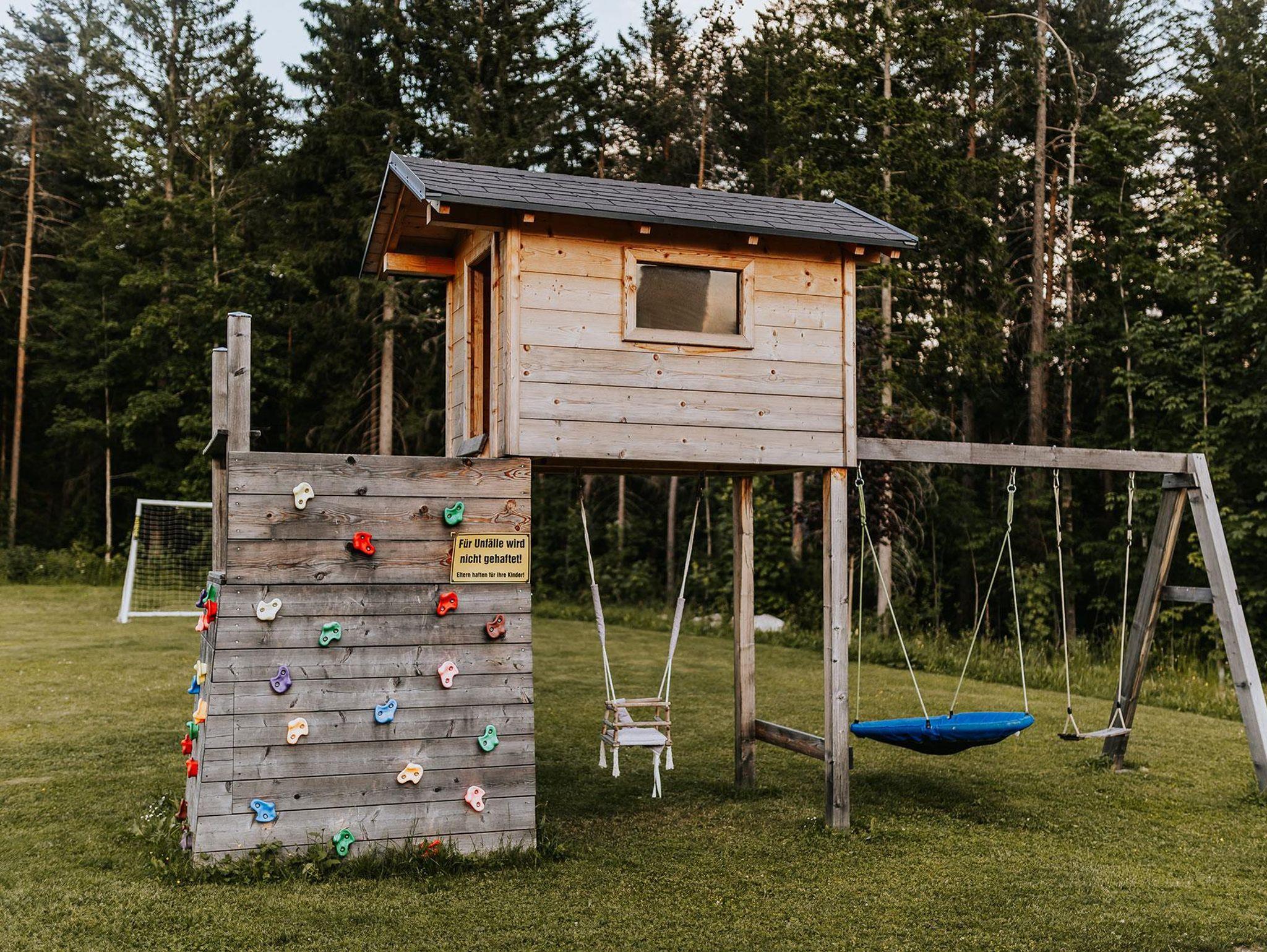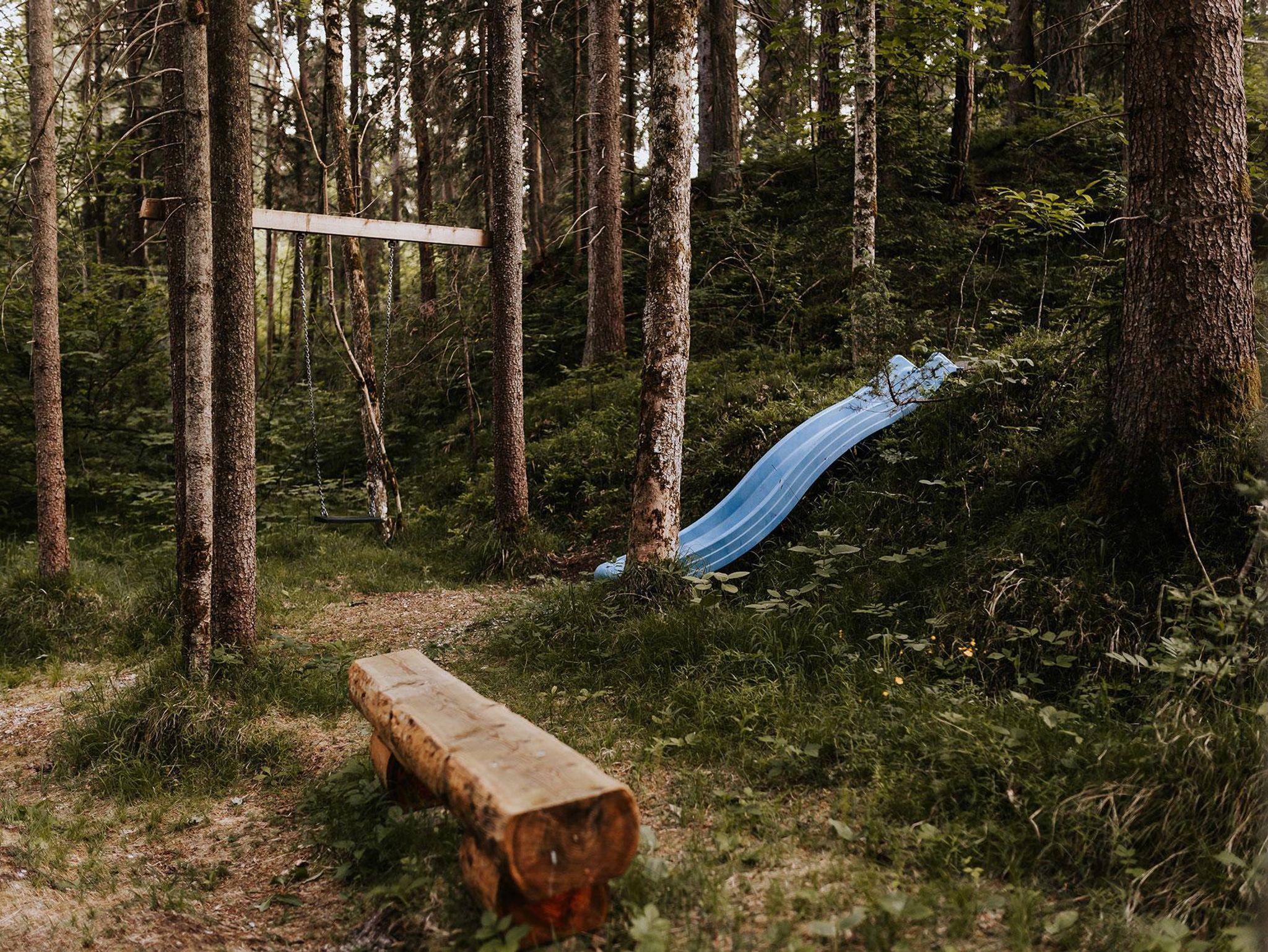 Im offenen Wohnbereich mit voll ausgestatteter Küche und gemütlichem Kachelofen lassen sich unvergessliche Momente mit Familie oder Freunden verbringen. Für erholsame Stunden sorgt das private Saunahaus mit eigener Dusche und WC. In den warmen Monaten laden die große Terrasse und der angrenzende Garten zu entspannten Grillabenden ein, während Kinder sich am eigenen Spielplatz, beim Slacklinen, Fußballspielen oder am kleinen Bach austoben können. Ein kinderwagenfreundlicher Waldweg führt in wenigen Minuten zur idyllischen Kneippanlage.