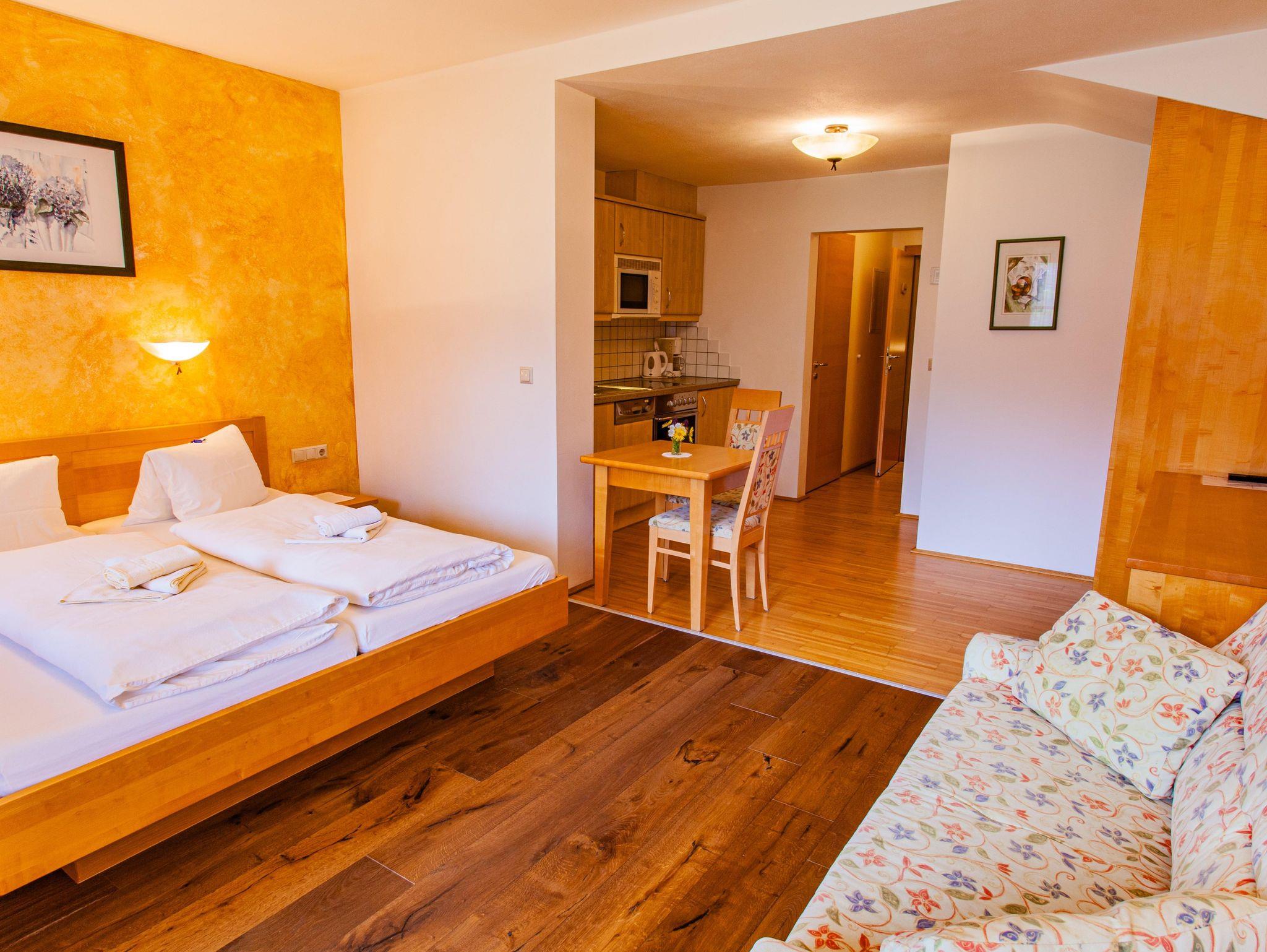ca. 32 m2 groß, Wohn-Schlafraum mit ausziehbarer Couch, Südbalkon, Badezimmer und WC getrennt, SAT-TV, Internetanschluß; Geschirrspüler, Mikrowelle, Kaffeemaschine, Kühlschrank, E-Herd mit Backofen, Brötchenservice, Sauna-Infrarotkabinenbenützung, Föhn, Sauna und Infrarot täglich frei.