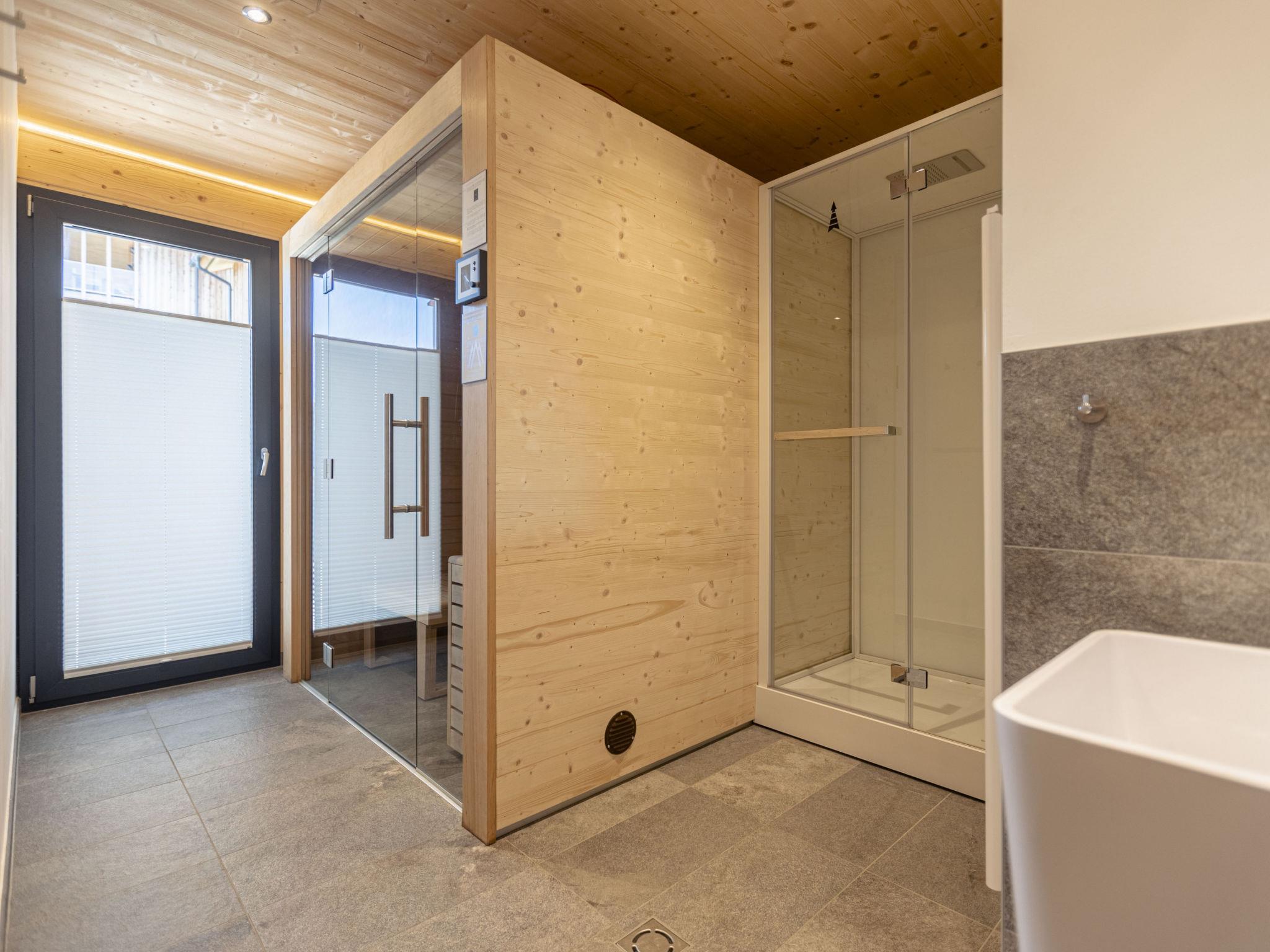 "Premium mit 4 Schlafzimmern,Sauna&Pool", 5-room chalet 125 m2. Bright, comfortable and luxurious furnishings: living/dining room with dining table, satellite TV and flat screen. 1 double bedroom. Open kitchen (oven, dishwasher, 4 ceramic glass hob hotplates, toaster, kettle, freezer, electric coffee machine) with Scandinavian wood stove. Sep. WC. Upper floor: 2 double bedrooms, each room with shower/WC. 1 double bedroom with 1 x 2 bunk beds. Bathroom, sep. WC. Balcony. Balcony furniture. Very beautiful panoramic view of the mountains. Facilities: sauna. Internet (WiFi, free). Please note: non-smokers only. The property is one of a type of property or apartment. This chalet has a private outdoor pool!