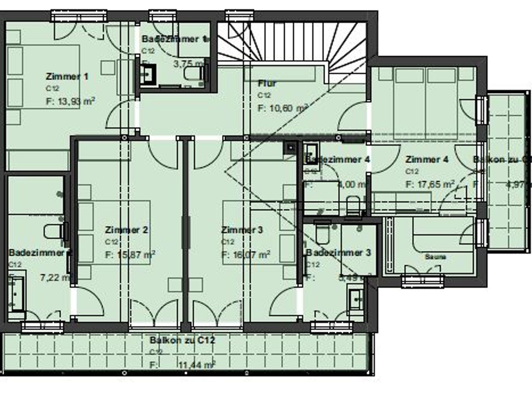 • Vier getrennte Schlafzimmer mit je einem Doppelbettem