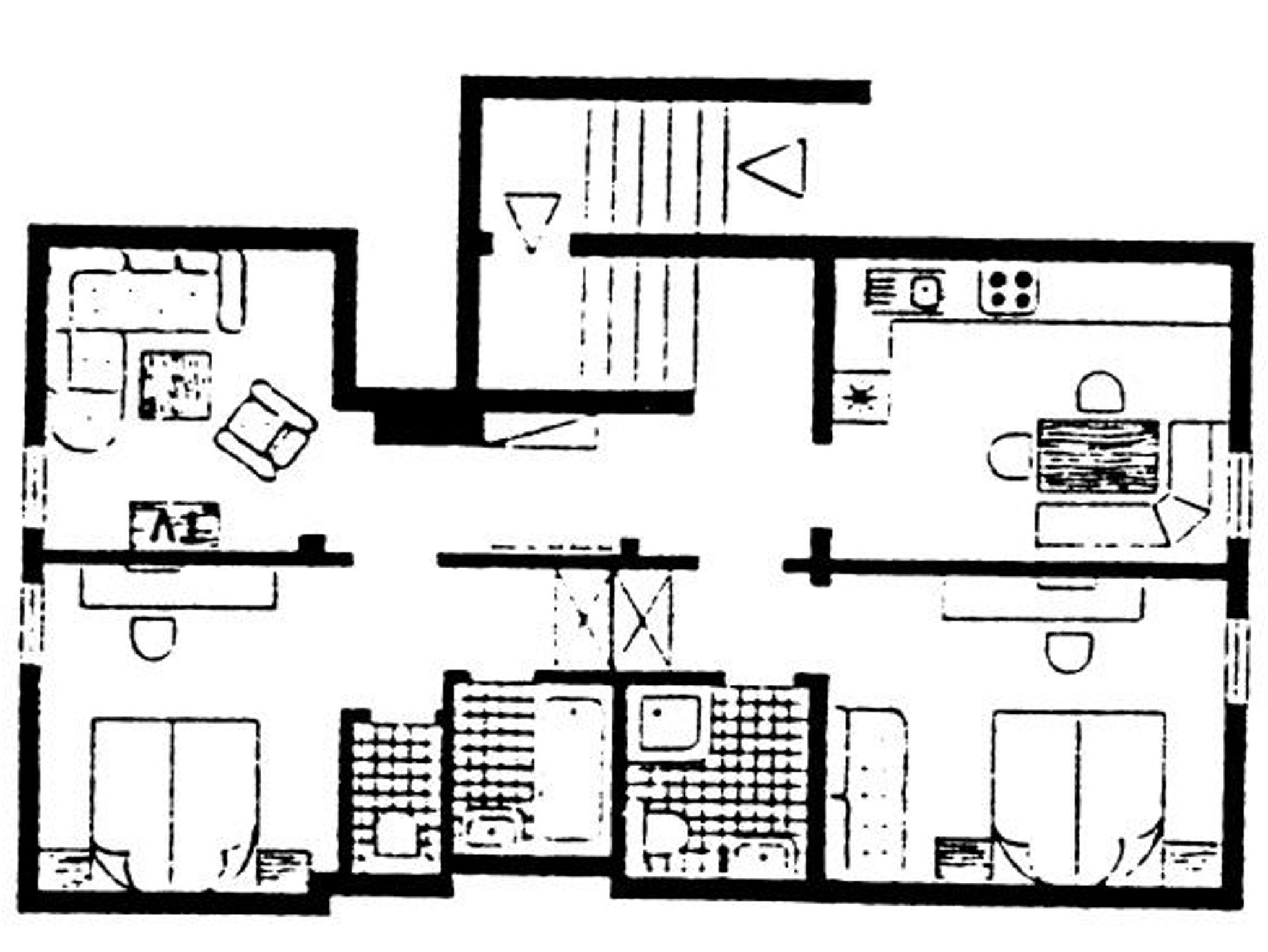 Komfortable Dachgeschosswohnung mit viel Atmosphäre! Nichtraucherwohnung! Abgeschlossene Küche mit eigener Essecke, seperate Wohnecke mit ausziehbarer Doppelcouch, zwei Schlafzimmer mit je Dusche bzw. Badewanne und WC.