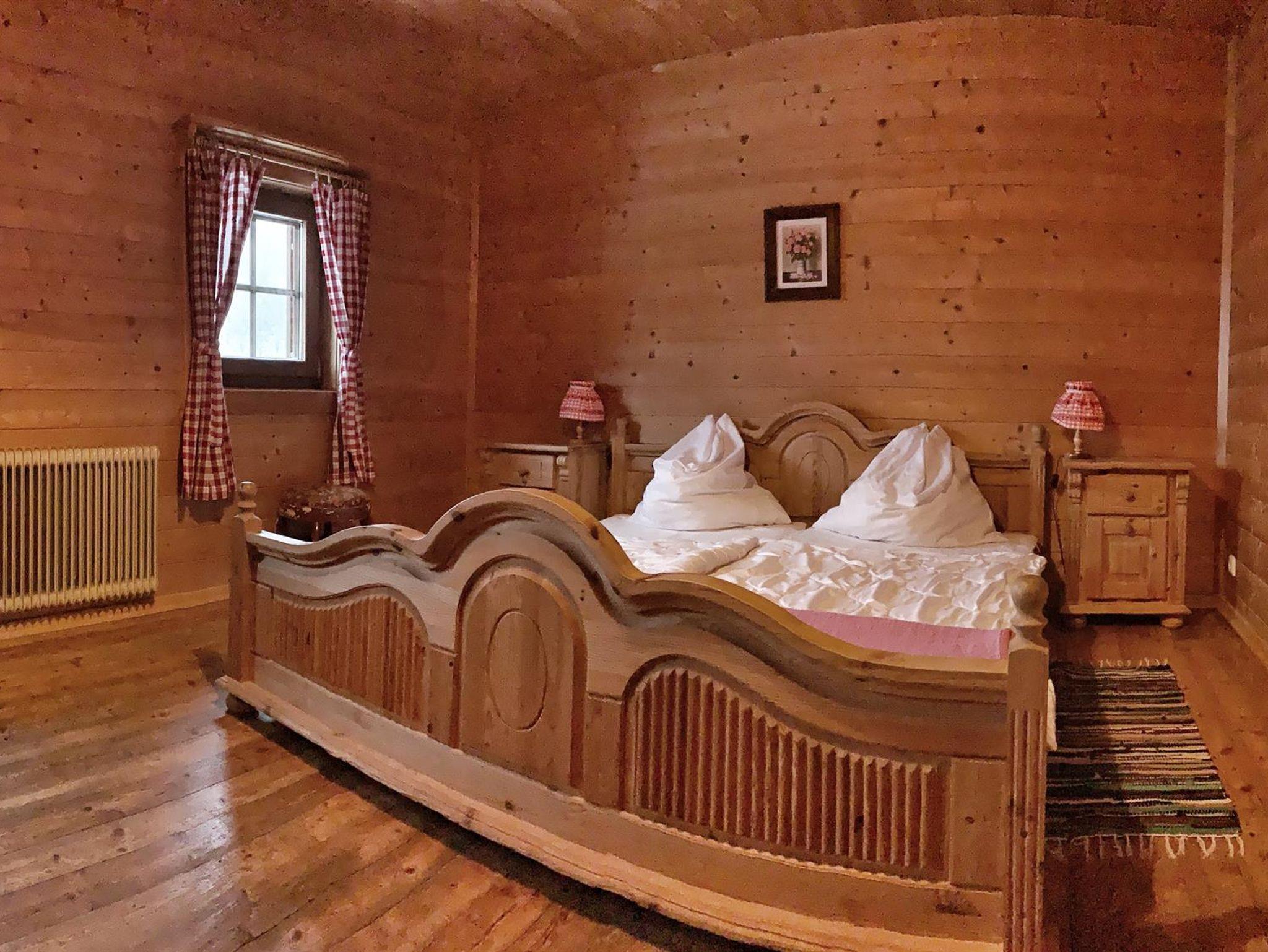 Almhütte „Gipper“ (Selbstversorgerhütte) – ausgestattet mit Vorraum, großer, gemütlicher Wohnküche mit Holzherd, E-Herd, Kühlschrank, Kaffeemaschine, Koch- und Essgeschirr, 1 Einzelzimmer, 1 Doppelzimmer, 1 weiteres Doppelzimmer verbunden über eine Treppe mit 1 Vierbettzimmer (nicht durch Türen oder Wand getrennt), Badezimmer mit Dusche/WC, Balkon, und großer sonnseitiger Terrasse