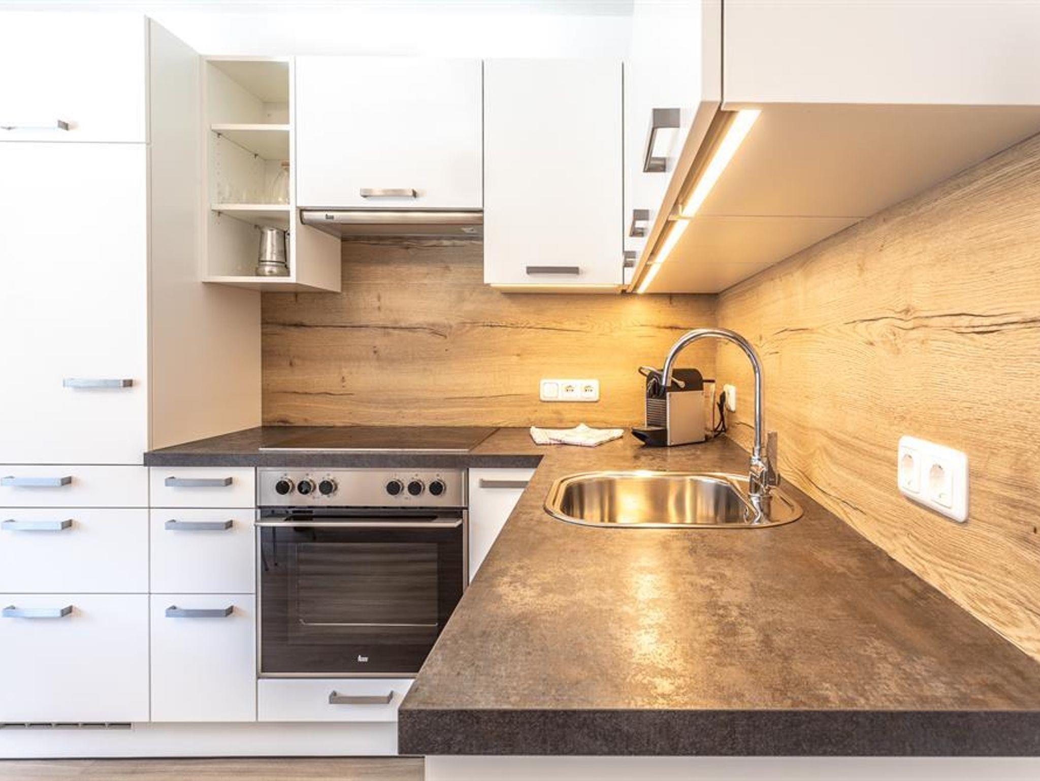 Große Wohnküche mit komplett ausgestatteter Markenküche, 2 ruhige Doppelschlafzimmer, großes, modernes Badezimmer mit Doppelwaschtisch/Dusche/WC, Gemeinschaftsbalkon