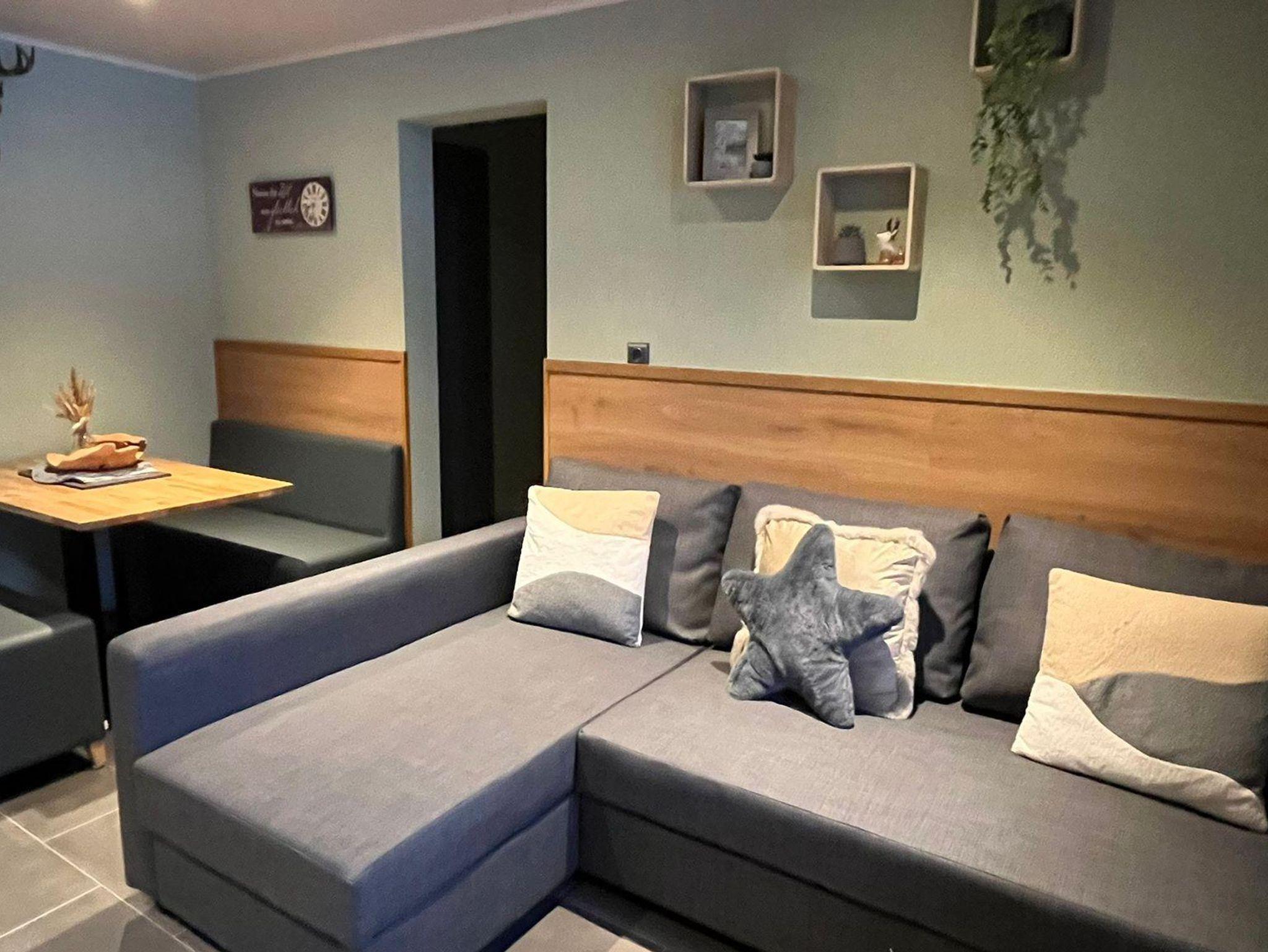 Wohnzimmer mit Küche und Essbereich, Schlafsofa, Smart-TV mit Satellitenempfang. Schlafzimmer mit Doppelbett und Etagenbett. Das Badezimmer verfügt über eine Dusche und ein Waschbecken. Separates WC. Diese Wohnung hat einen überdachten Balkon im Süden mit Blick auf den Garten. Kostenlos WLAN