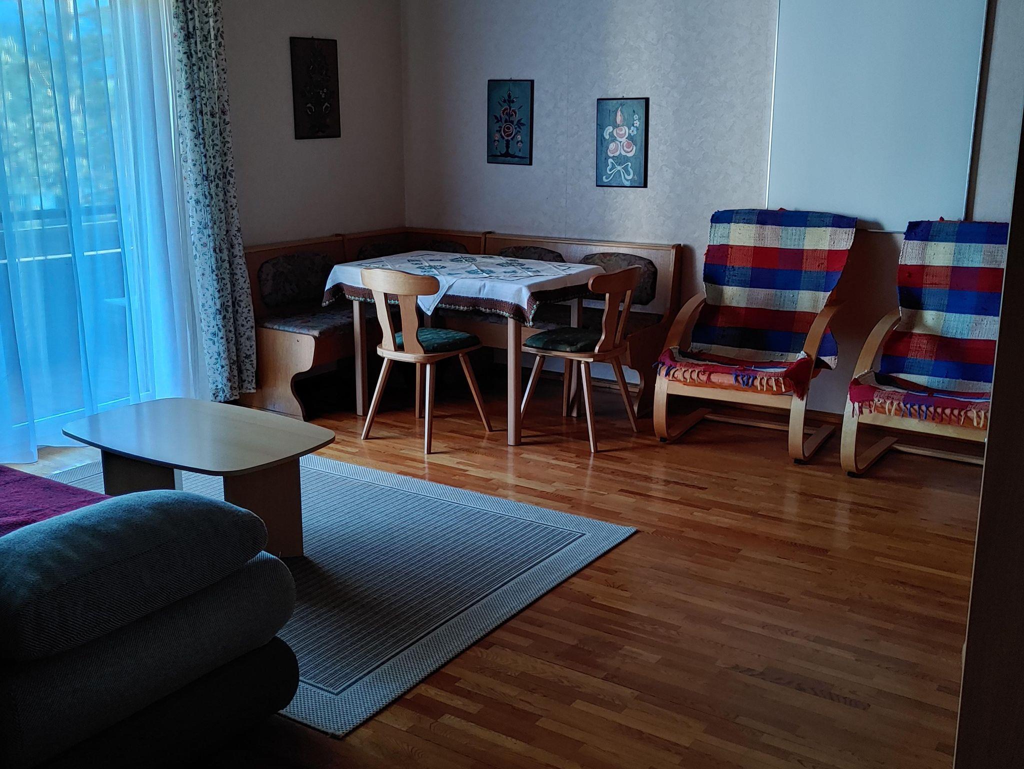 Das Apartment für vier Personen besteht aus einem Vorraum, einem Badezimmer mit Badewanne, einem separaten WC, zwei Schlafzimmern, sowie einem großzügigen Wohnzimmer mit Kochnische. Auf dem Schlafsofa im Wohnzimmer können bei Bedarf zwei weitere Schlafgelegenheiten eingerichtet werden. Der südseitige Balkon bietet einen prächtigen Blick auf den Pressegger See und die Karnischen Alpen.