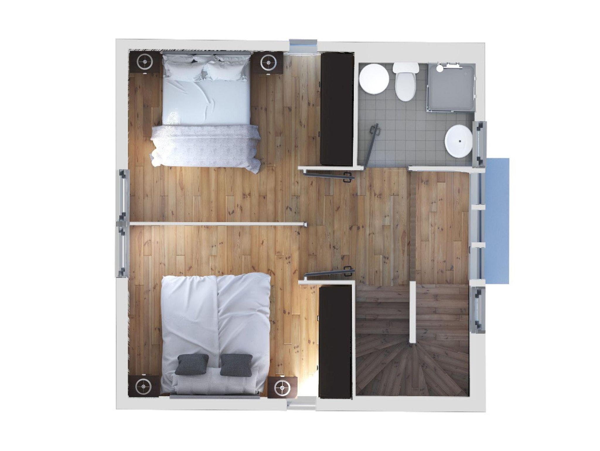 • 2 getrennte Schlafzimmer (1. OG) eines davon verfügt über ein Hochbett auf dem Kasten. Dieses ist über eine Leiter erreichbar und hat eine Liegefläche von 70×190 cm