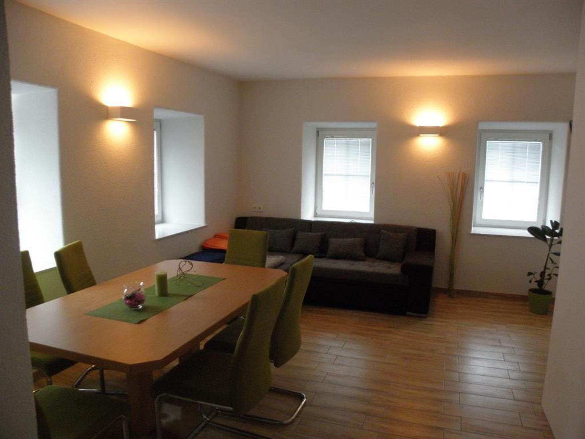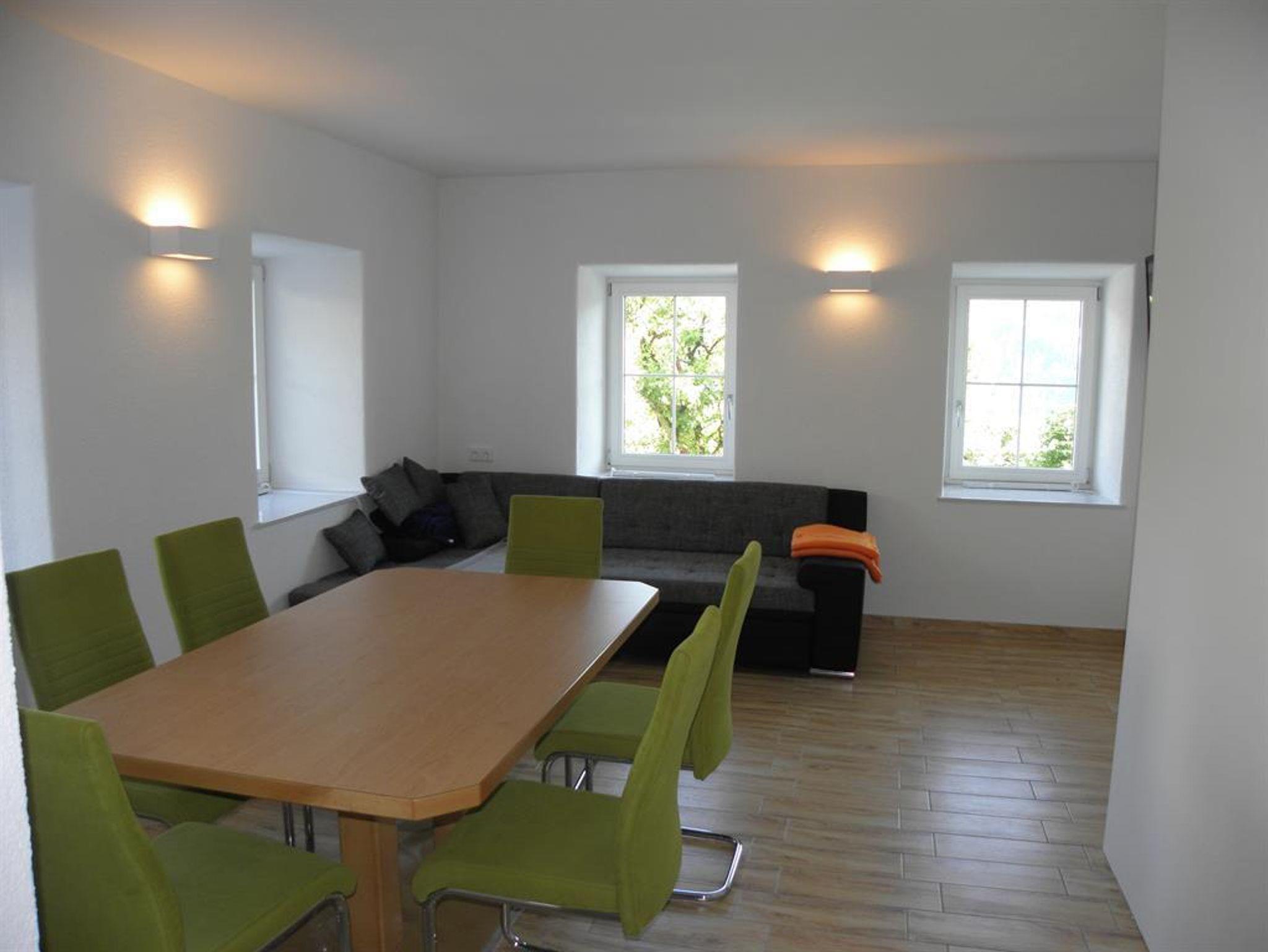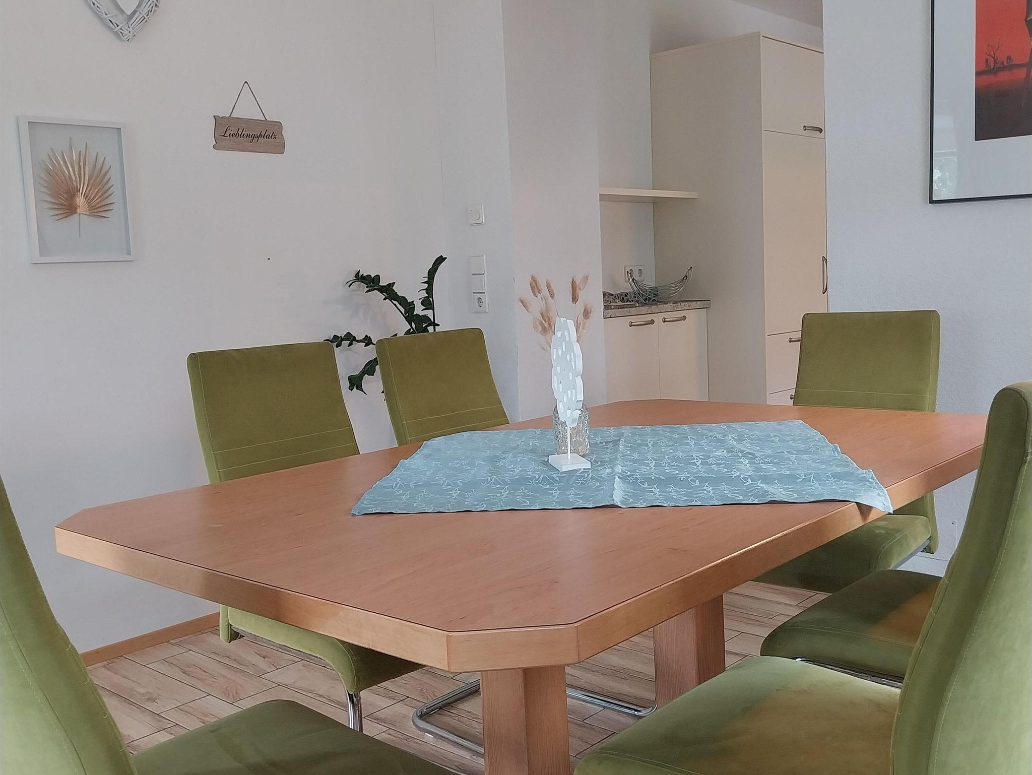 Wohn/ Esszimmer mit großen Esstisch und Couch.
