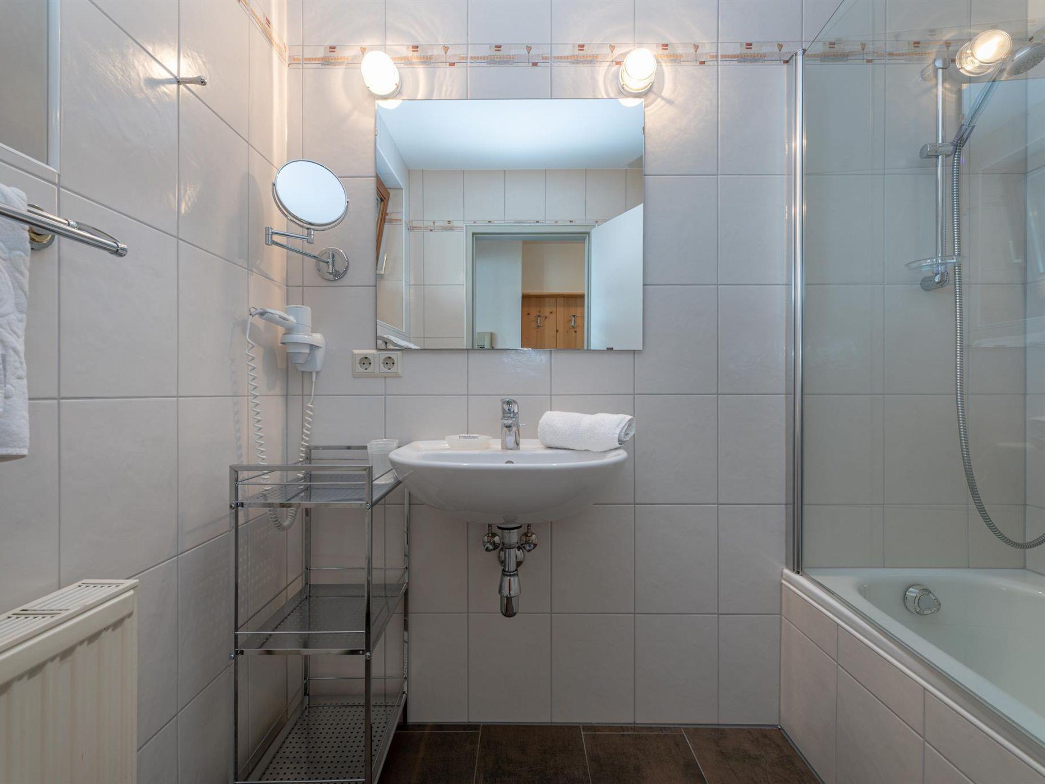 Das Hauptbadezimmer ist ausgestattet mit Badewanne/Dusche, Föhn, Kosmetikspiegel und seperatem WC. Das Kinderzimmer verfügt zusätzlich über ein eigenes Bad mit Dusche/WC – ideal für Familien mit mehreren Kindern oder Freunden, die gemeinsam reisen.