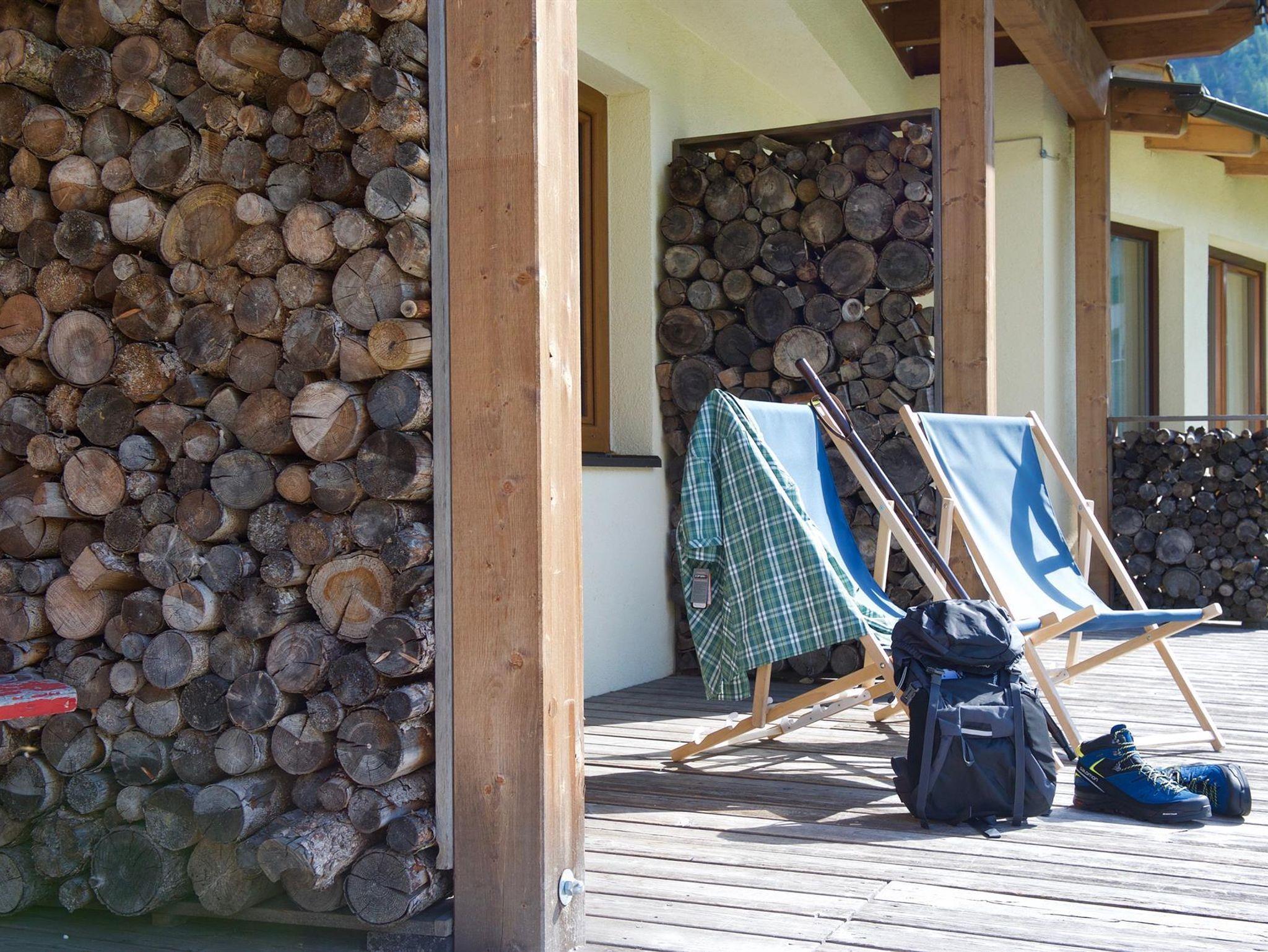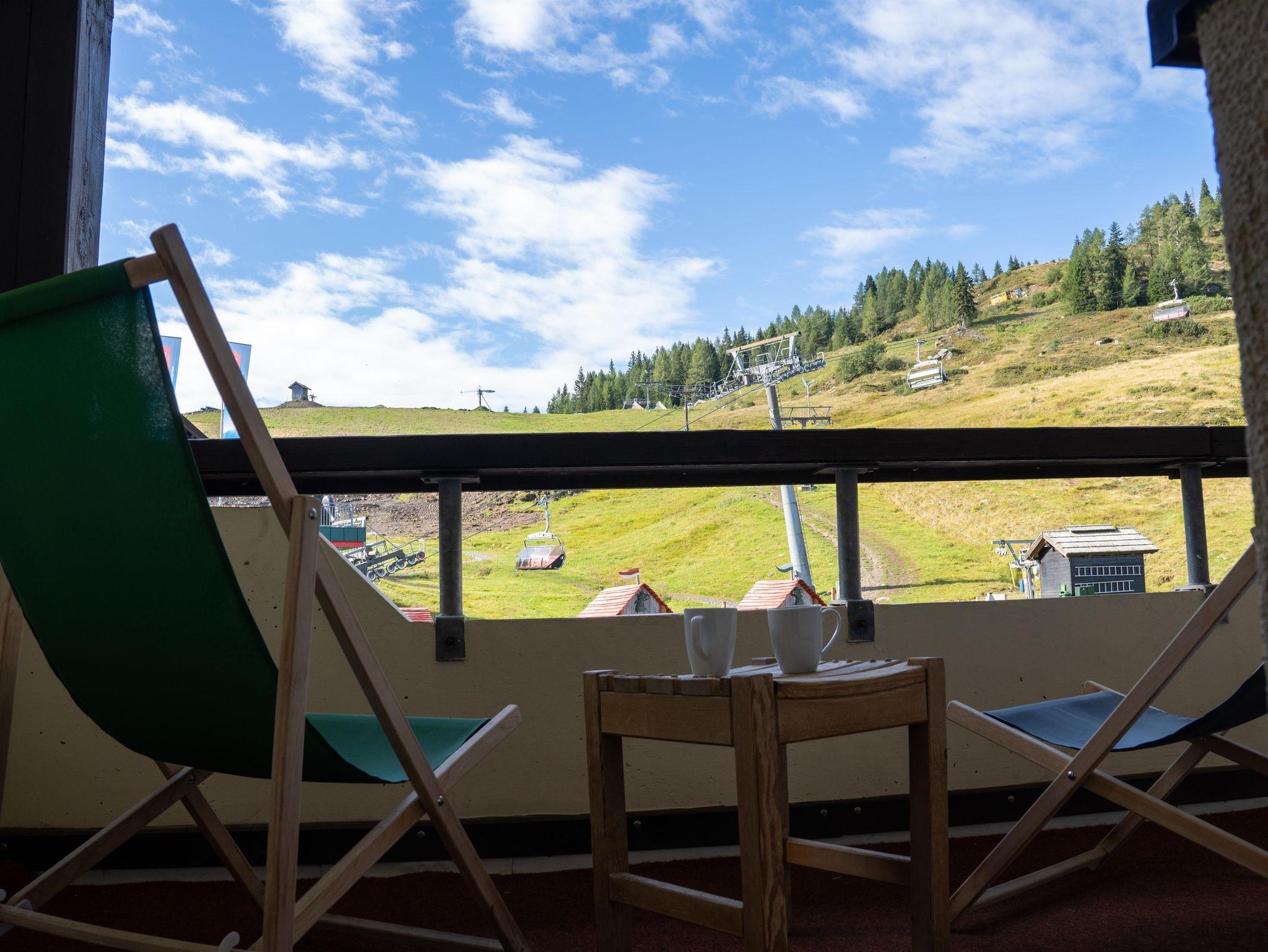 südseitiger Balkon in Richtung Piste mit Sonnenliegestühlen