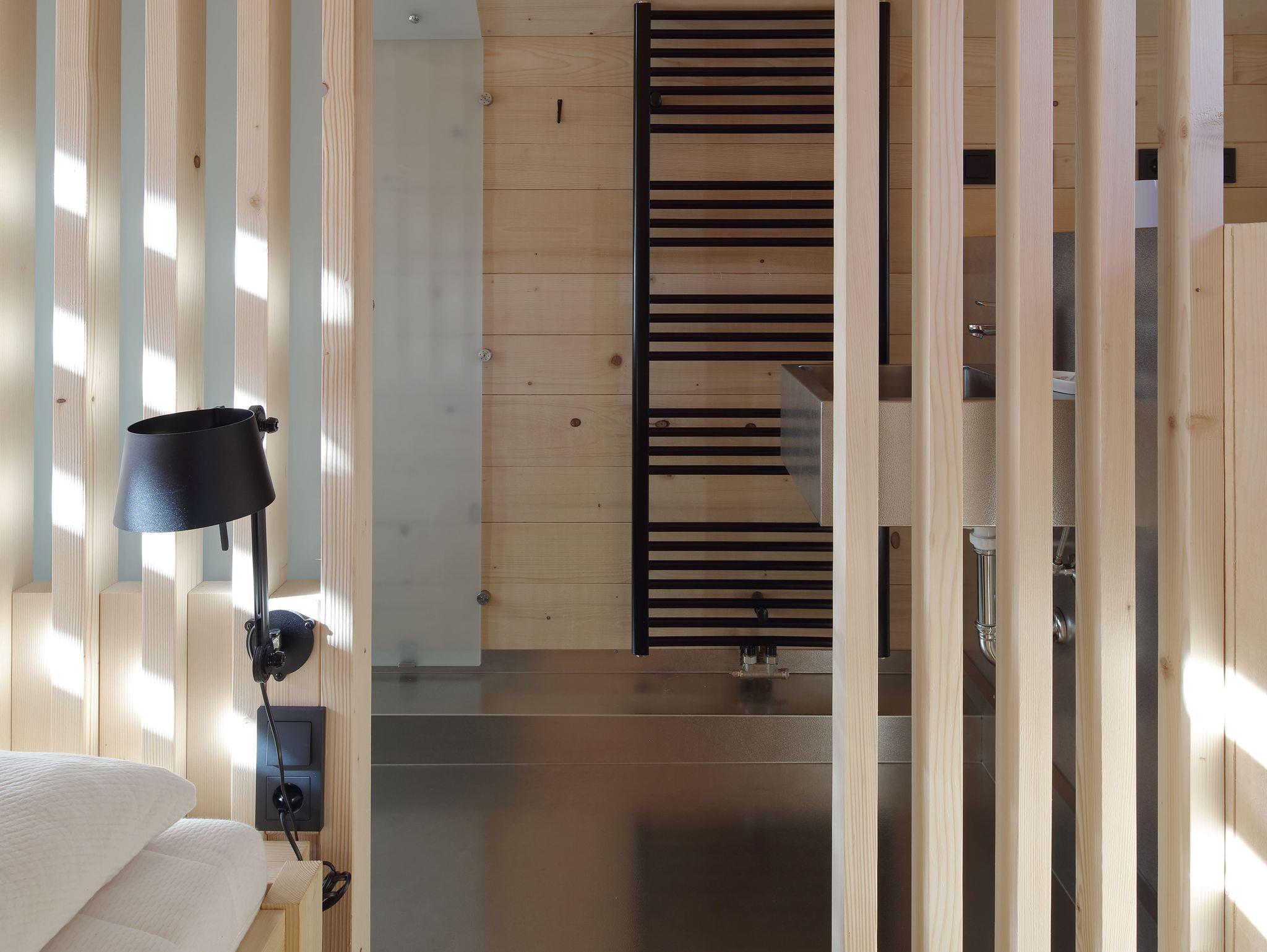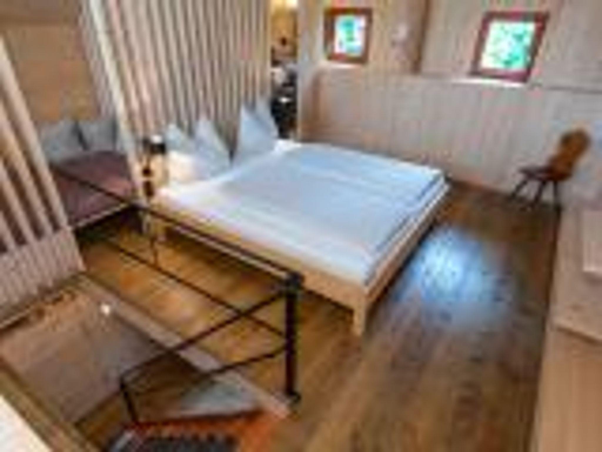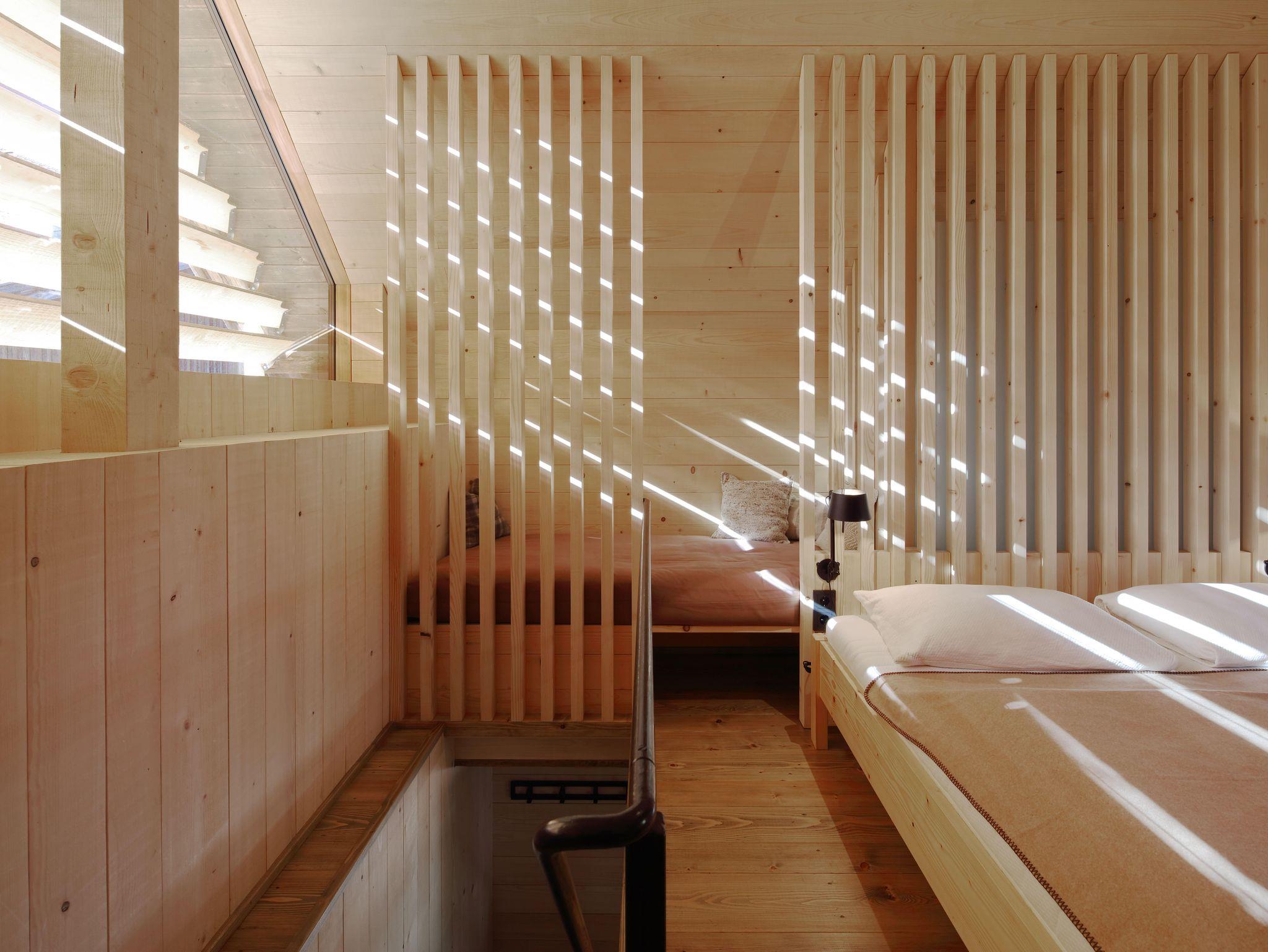 Über die Wohnstiege erreicht man den ersten Stock. Dort befinden sich das Doppelbett sowie die Dusche und eine Relaxecke.