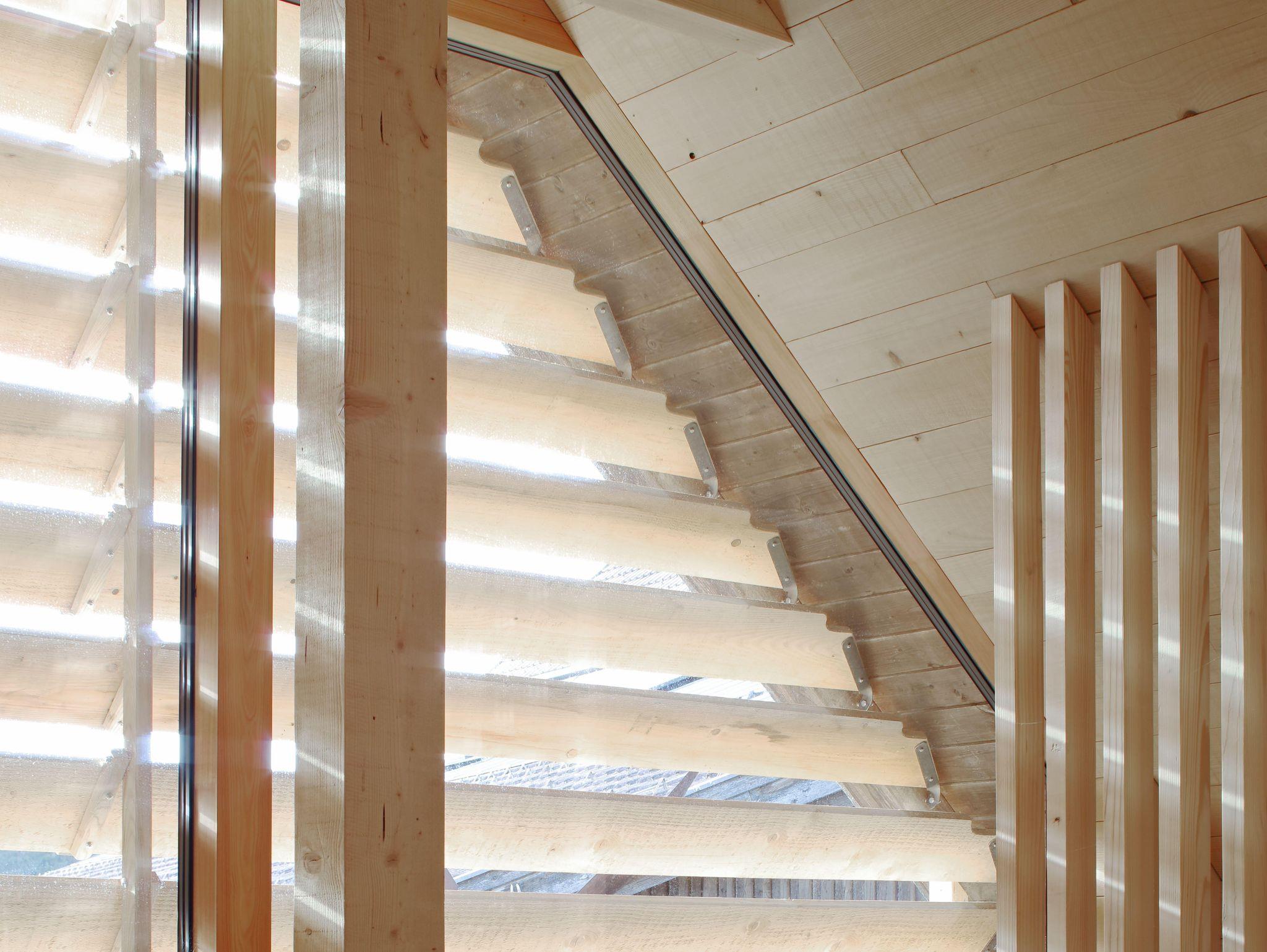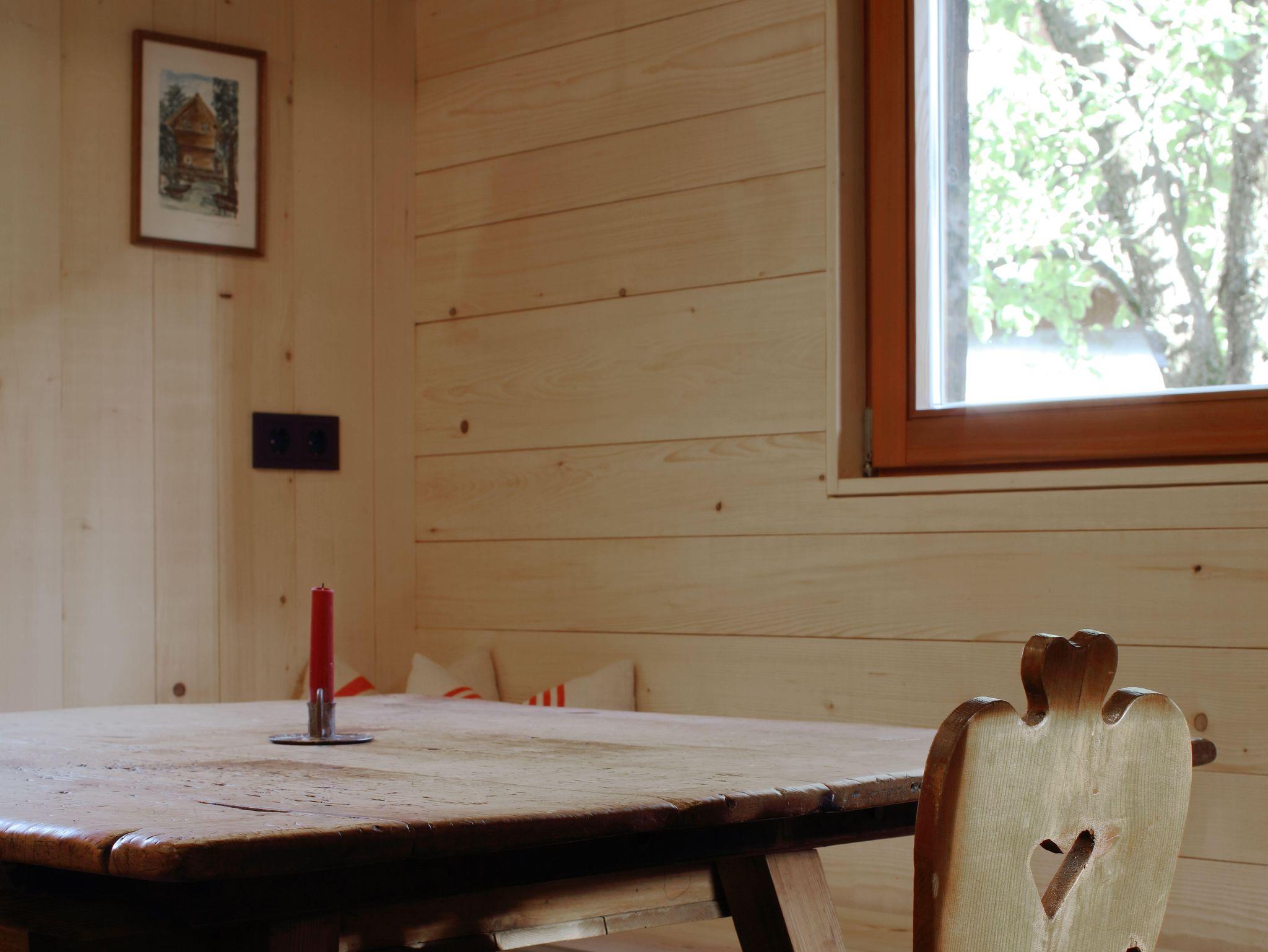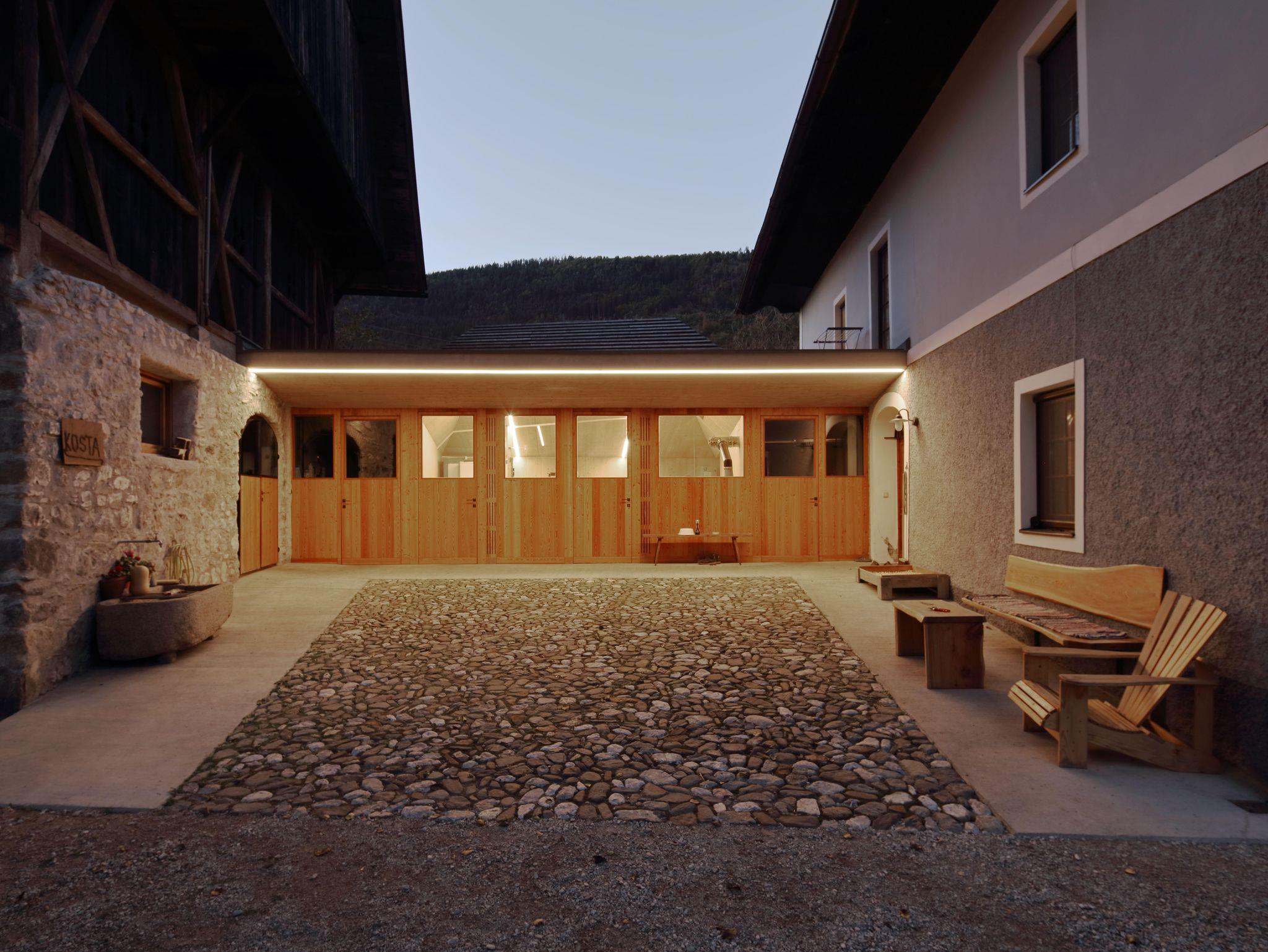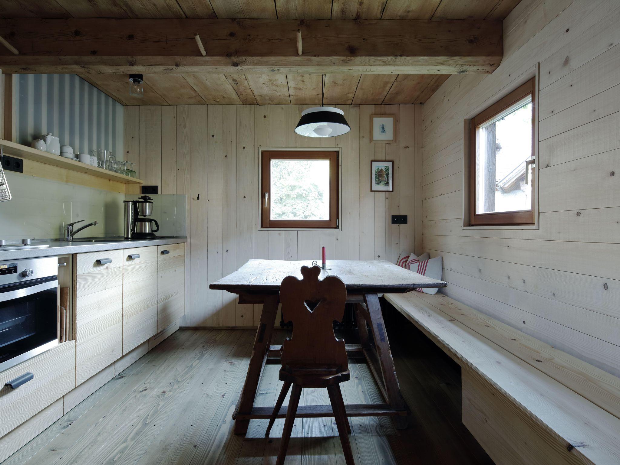 Im Erdgeschoß befindet sich der Wohnraum mit einer komplett eingerichteten Küche, Garderobe und WC. Eine lange Holzbank lädt zum Sitzen oder Entspannen ein.