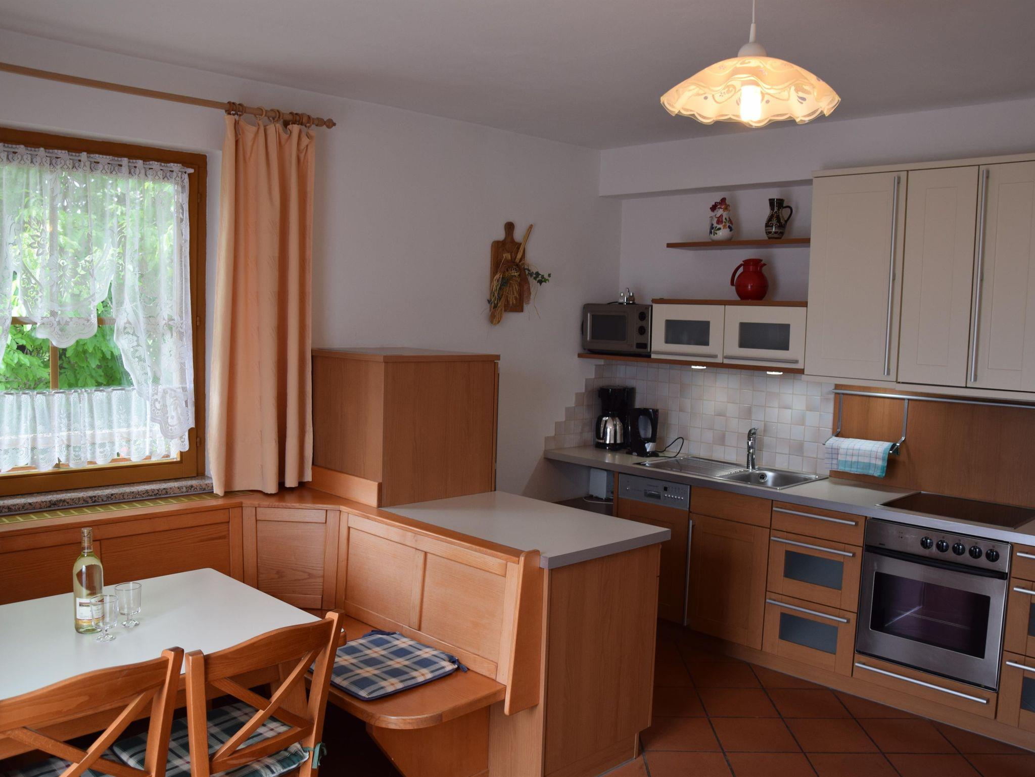 Gemütliche südwestlich gelegene Ferienwohnung für bis zu 7 Personen 84 m2: moderne Wohnküche mit Geschirrspüler und Ausgang auf Balkon,Sofa, Essecke und SAT-TV, 1 Doppelbettzimmer, 1 Zimmer mit 2 Einzelbetten, 1 Dreibettzimmer mit Doppelbett und Einzelbett mit Ausgang auf Balkon, Bad mit Dusche 2 Waschbecken und WC, 1 WC extra, sehr großer Balkon mit Tischen und Stühlen